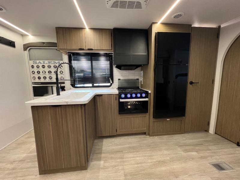The Salem travel trailers are packed with hassle-free camping amenities! There are a variety of floorplans to choose from between three different regions. The heated and enclosed Accessibelly will help protect against the elements and debris during transport, and the exterior retro/metal redesign is sure to be eye-catching! There are stylish roller shades inside, along with updated backsplash, elegant curtain rods and curtains, plus many more interior comforts! Choose a Salem travel trailer today for quality and value!