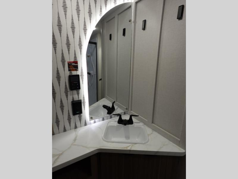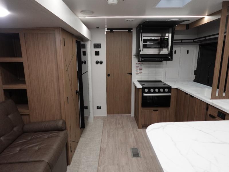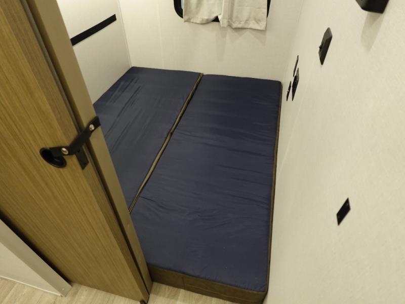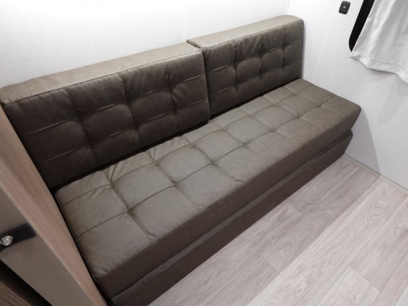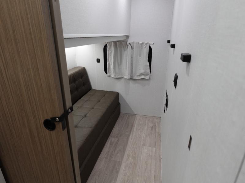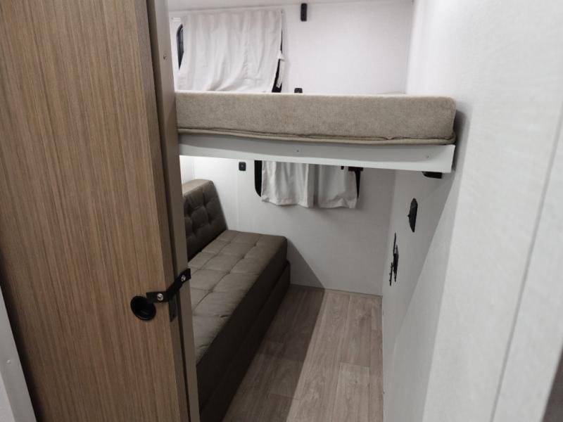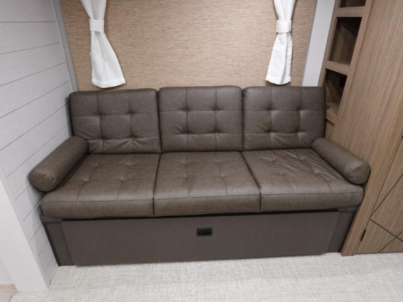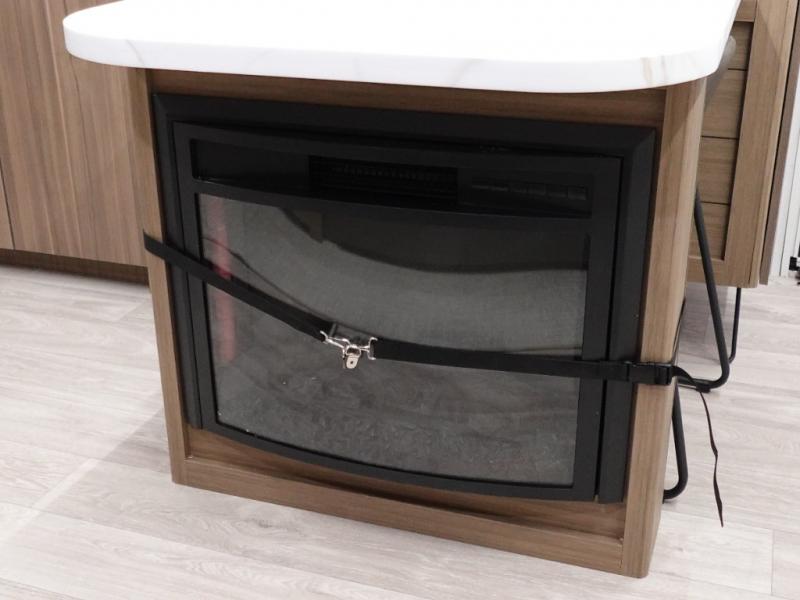 Everyone will enjoy having their own space in this travel trailer thanks to the front master bedroom and the rear bunkhouse. The bunkhouse includes a wall to separate the Versa bunk and fold-down desk on one side and a Versa sofa on the other, perfect for older kids or guests. You'll have the custom king bed with Versa Tilt all to yourselves, and the walk-thru bath will be easily accessible for everyone. In the combined kitchen and living room, a jackknife sofa slide sits across from the fireplace/entertainment center, and there is a pull-out table here so you can dine together.