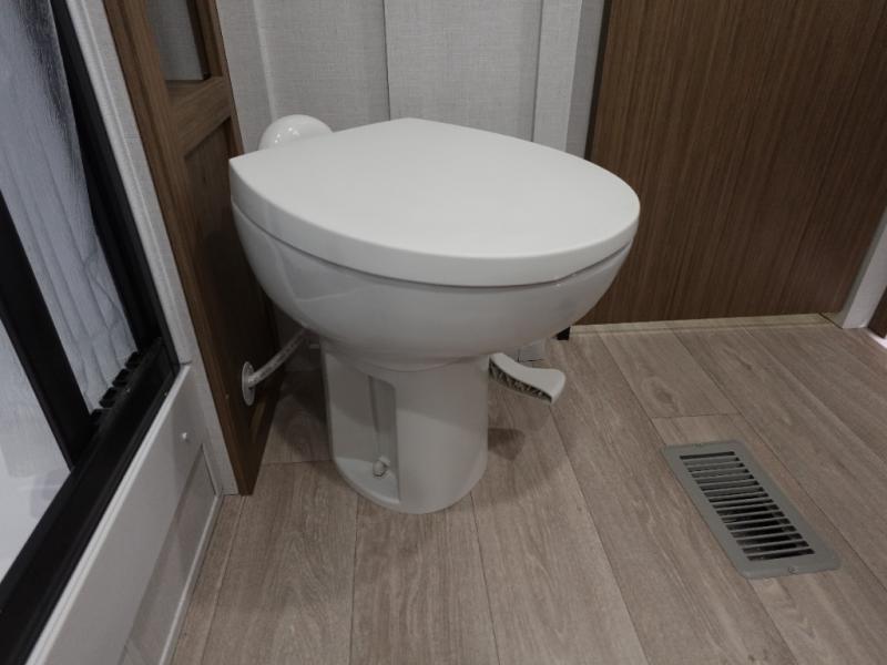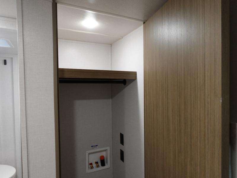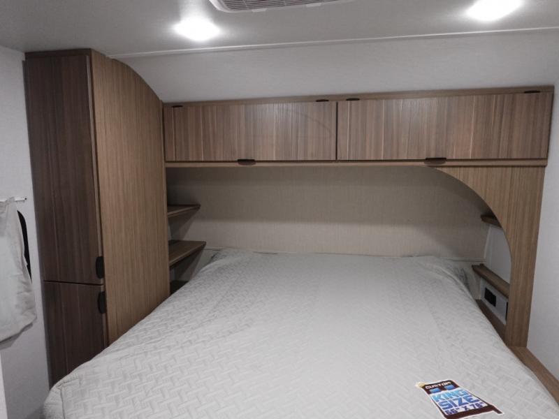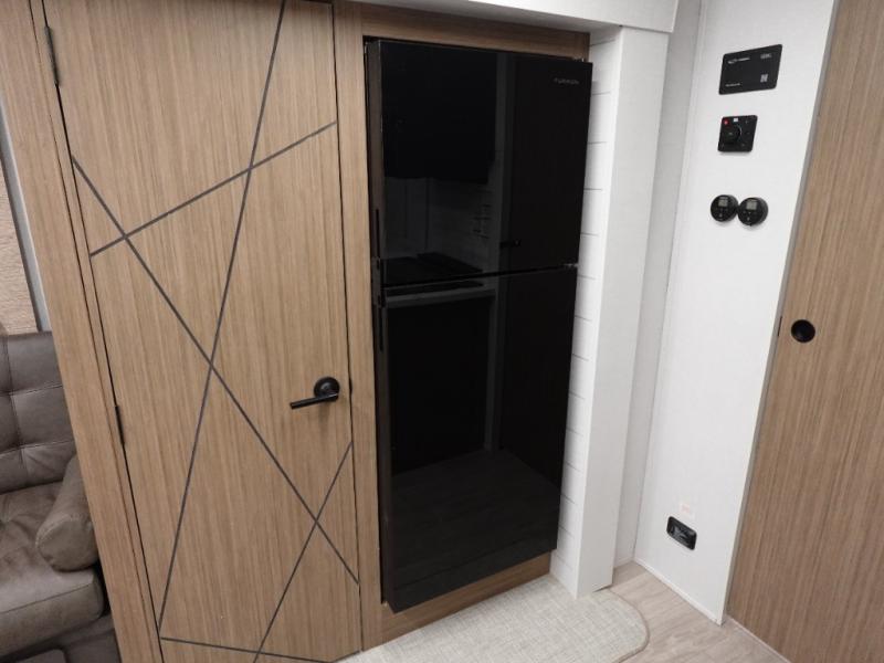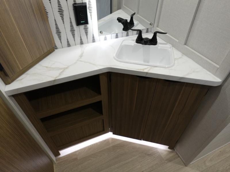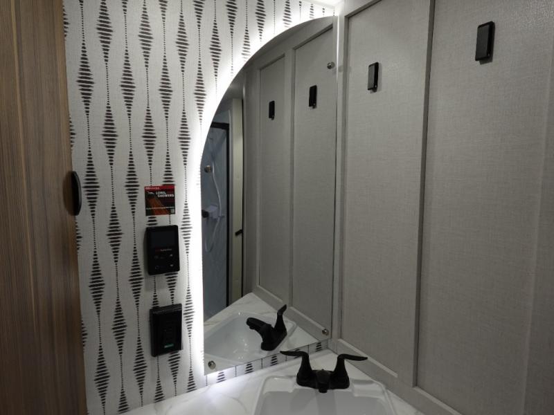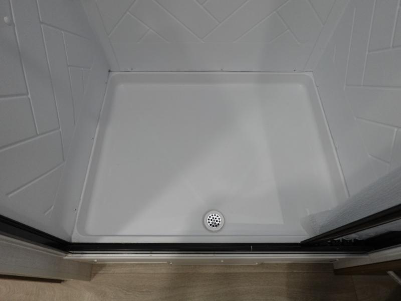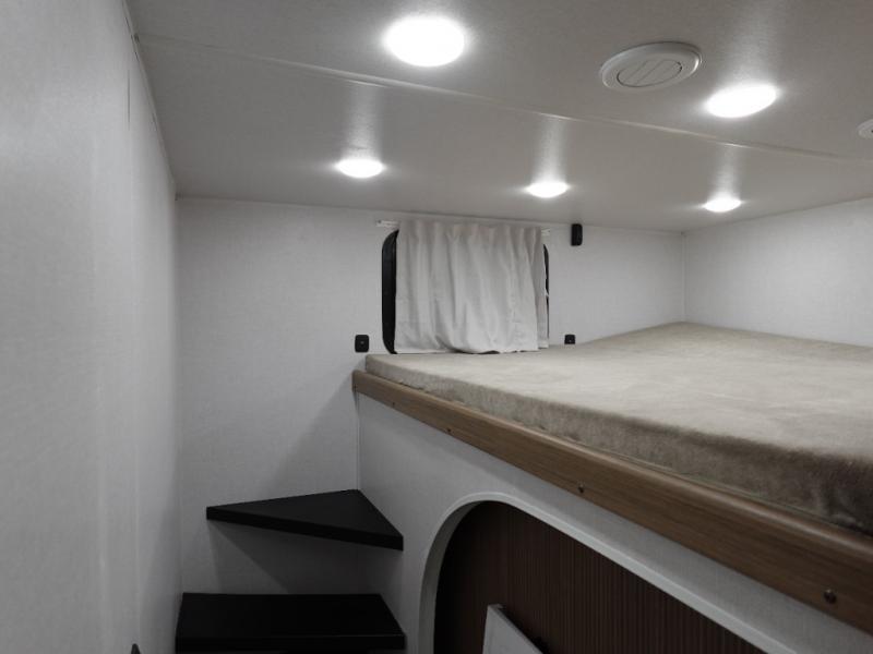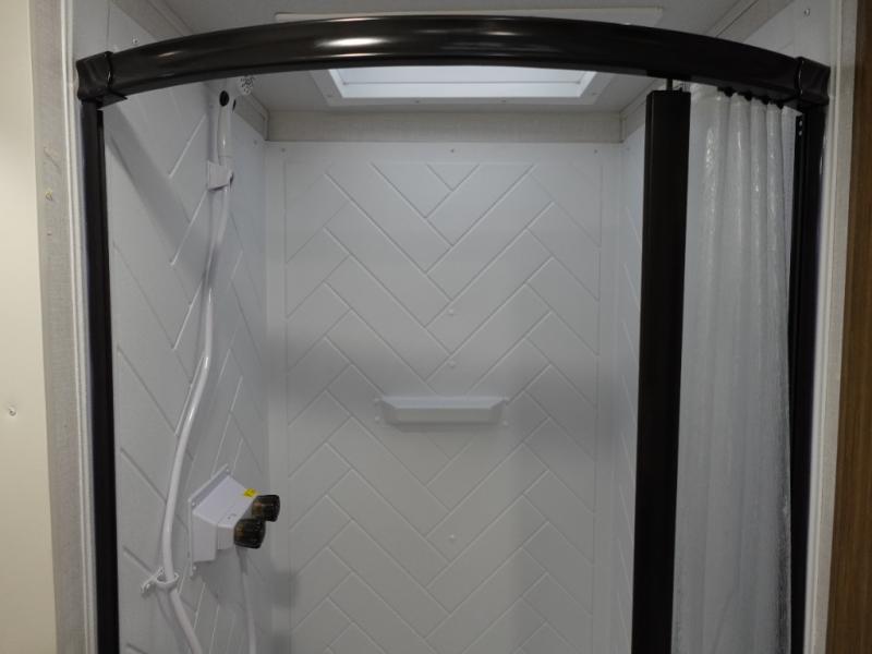 Everyone will enjoy having their own space in this travel trailer thanks to the front master bedroom and the rear bunkhouse. The bunkhouse includes a wall to separate the Versa bunk and fold-down desk on one side and a Versa sofa on the other, perfect for older kids or guests. You'll have the custom king bed with Versa Tilt all to yourselves, and the walk-thru bath will be easily accessible for everyone. In the combined kitchen and living room, a jackknife sofa slide sits across from the fireplace/entertainment center, and there is a pull-out table here so you can dine together.