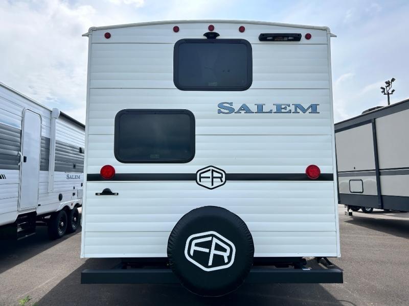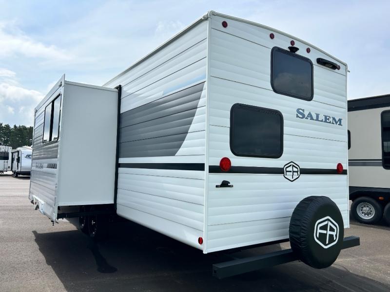 The Salem travel trailers are packed with hassle-free camping amenities and there are a variety of floorplans to choose from. The heated and enclosed Accessibelly will help protect against the elements and debris during transport, and the exterior retro/metal redesign is sure to be eye-catching! There are stylish roller shades inside, along with updated backsplash, elegant curtain rods and curtains, plus many more interior comforts! Choose a Salem travel trailer today for quality and value!
