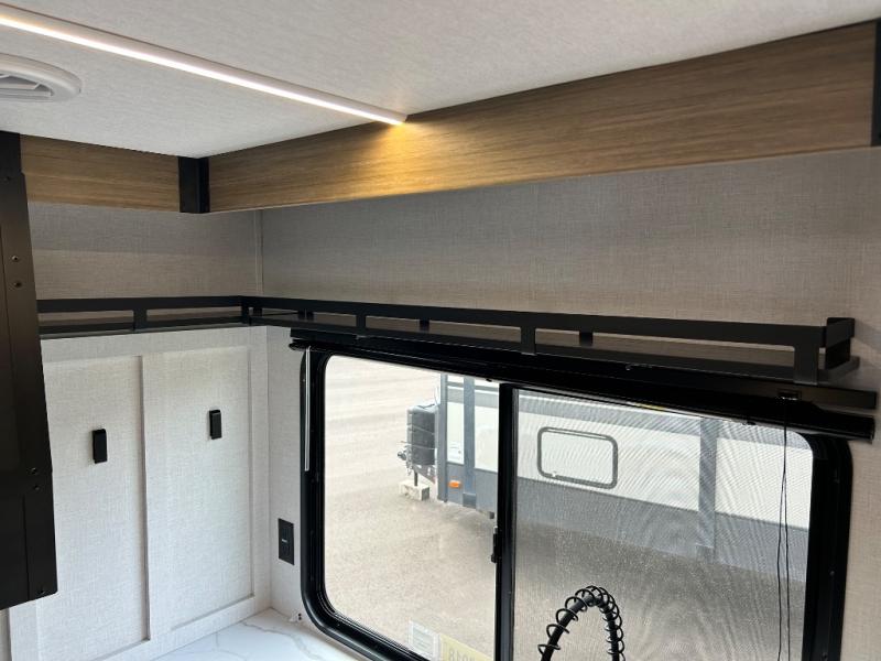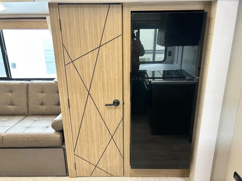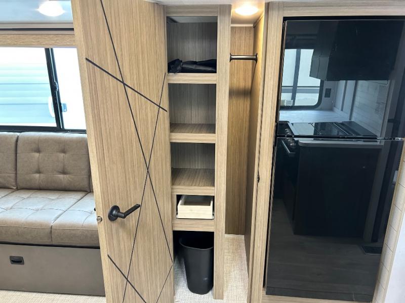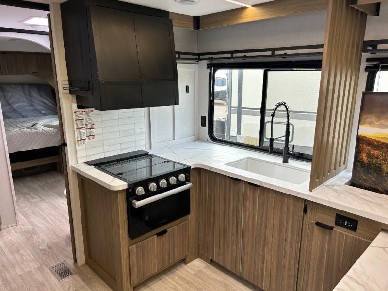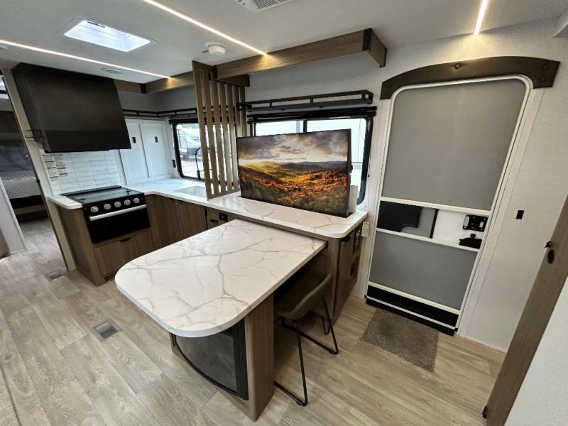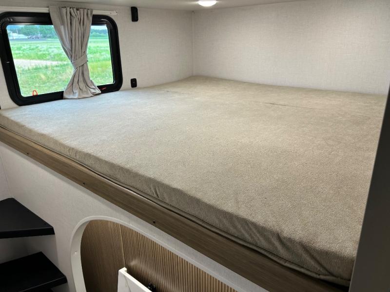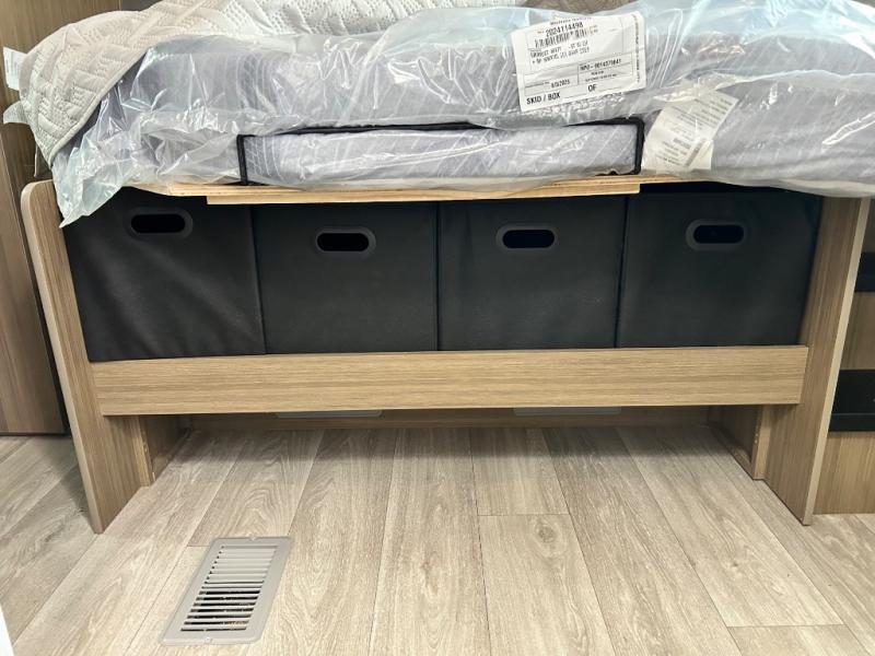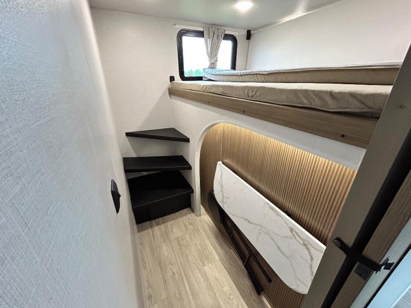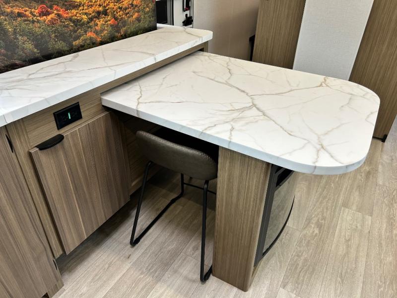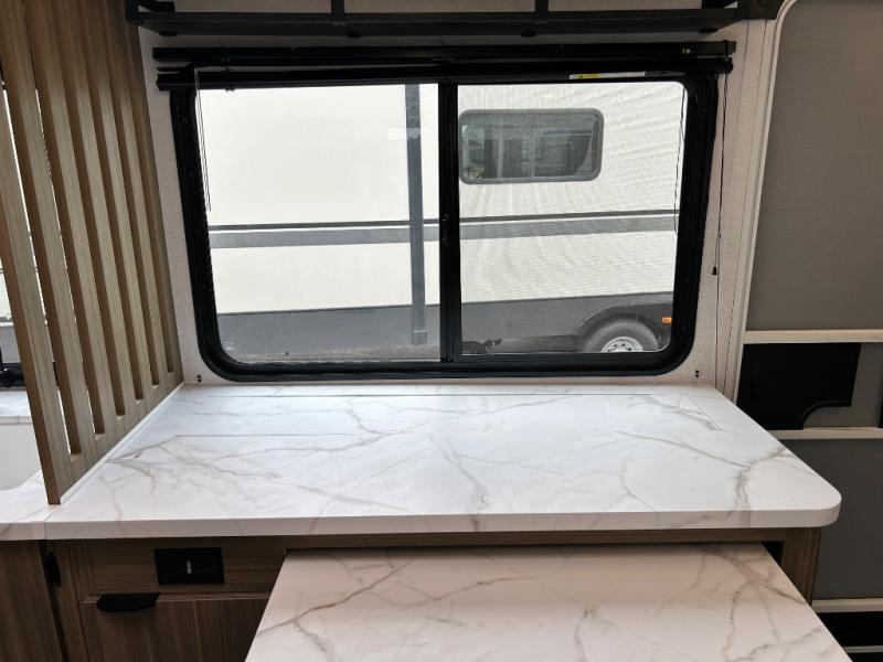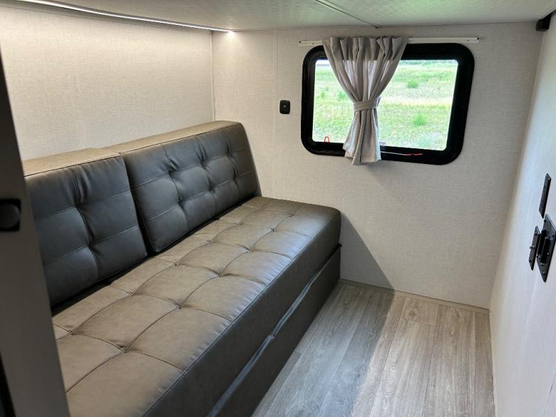 Everyone will enjoy having their own space in this travel trailer thanks to the front master bedroom and the rear bunkhouse. The bunkhouse includes a wall to separate the Versa bunk and fold-down desk on one side and a Versa sofa on the other, perfect for older kids or guests. You'll have the custom king bed with Versa Tilt all to yourselves, and the walk-thru bath will be easily accessible for everyone. In the combined kitchen and living room, a jackknife sofa slide sits across from the fireplace/entertainment center, and there is a pull-out table here so you can dine together.