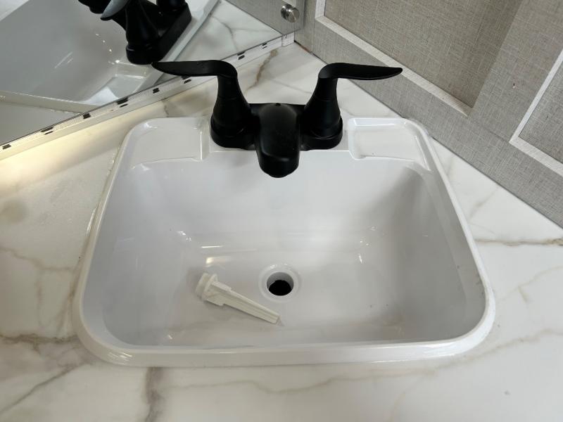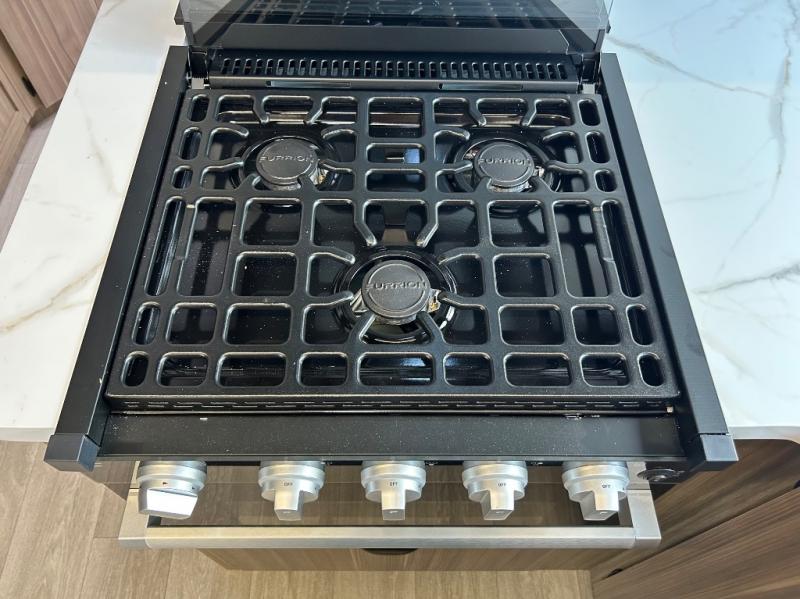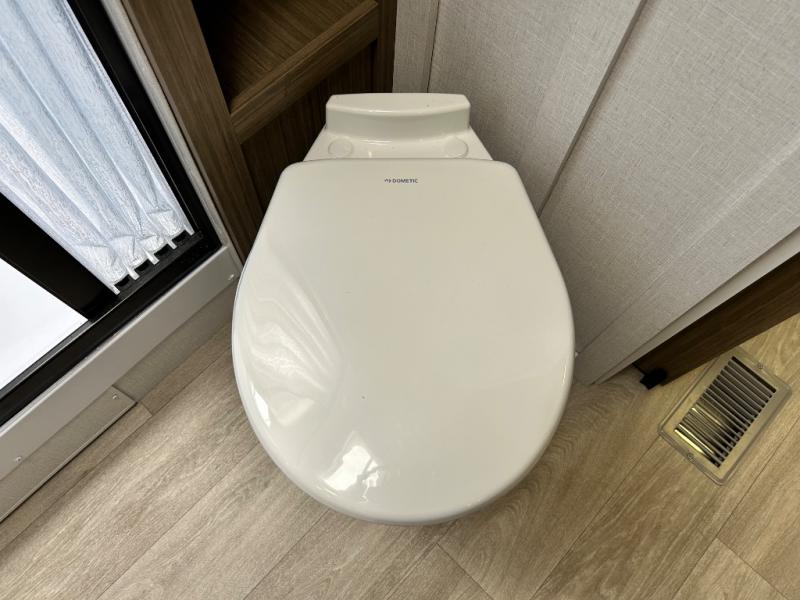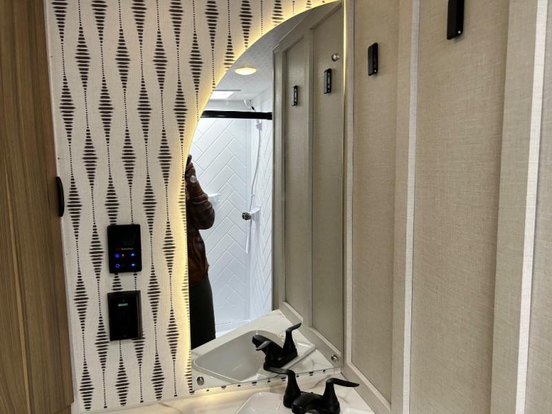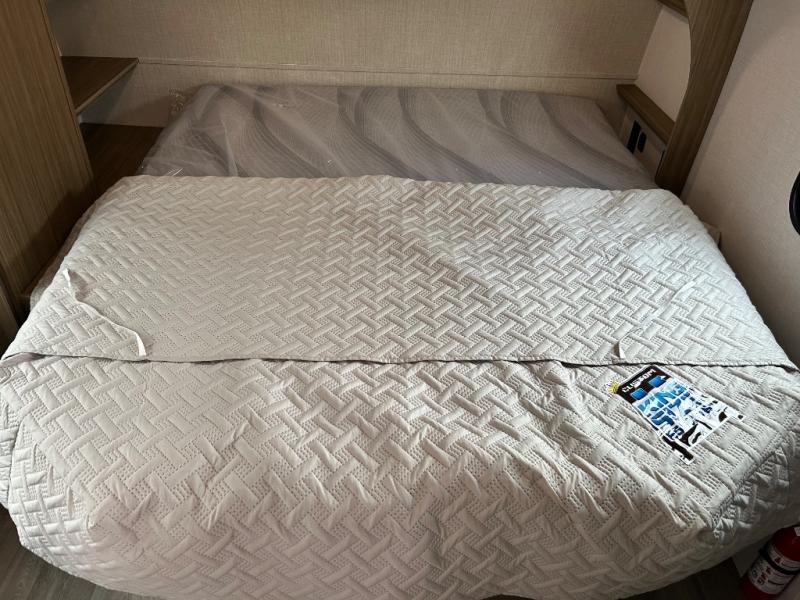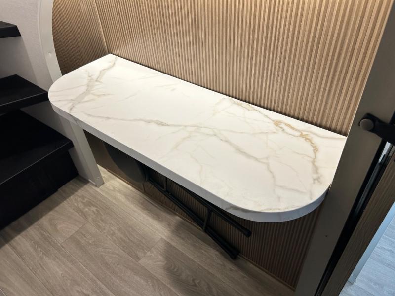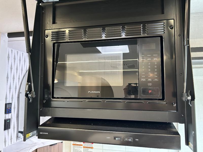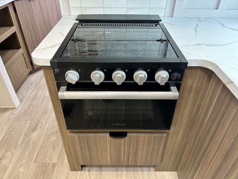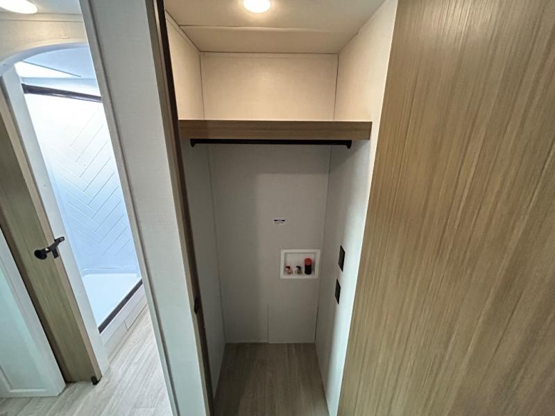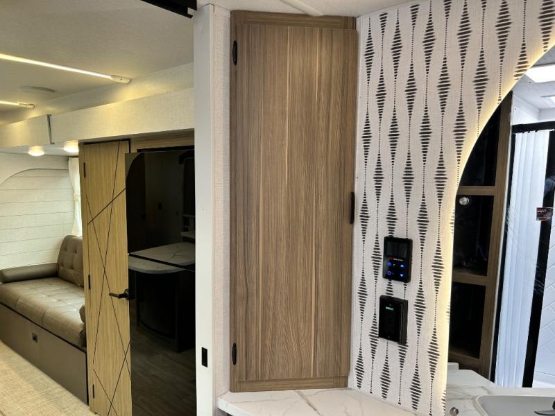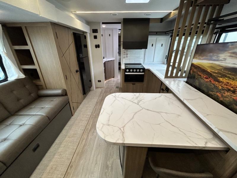 Everyone will enjoy having their own space in this travel trailer thanks to the front master bedroom and the rear bunkhouse. The bunkhouse includes a wall to separate the Versa bunk and fold-down desk on one side and a Versa sofa on the other, perfect for older kids or guests. You'll have the custom king bed with Versa Tilt all to yourselves, and the walk-thru bath will be easily accessible for everyone. In the combined kitchen and living room, a jackknife sofa slide sits across from the fireplace/entertainment center, and there is a pull-out table here so you can dine together.
