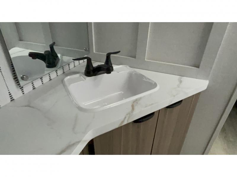 Everyone will enjoy having their own space in this travel trailer thanks to the front master bedroom and the rear bunkhouse. The bunkhouse includes a wall to separate the Versa bunk and fold-down desk on one side and a Versa sofa on the other, perfect for older kids or guests. You'll have the custom king bed with Versa Tilt all to yourselves, and the walk-thru bath will be easily accessible for everyone. In the combined kitchen and living room, a jackknife sofa slide sits across from the fireplace/entertainment center, and there is a pull-out table here so you can dine together.