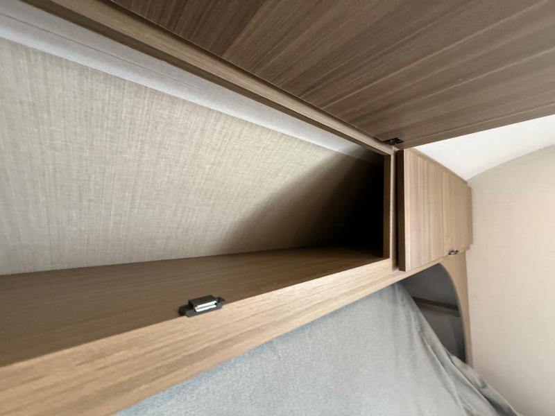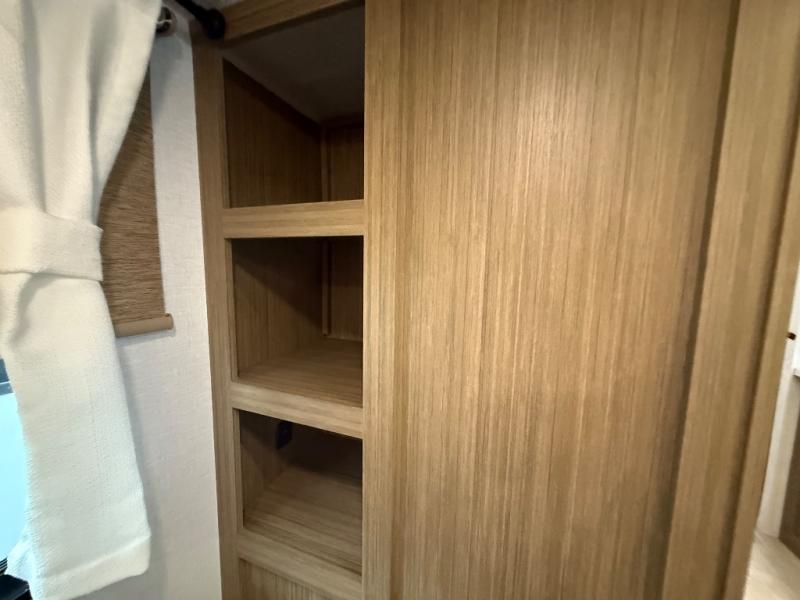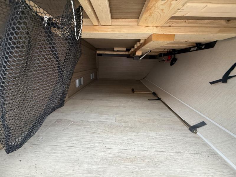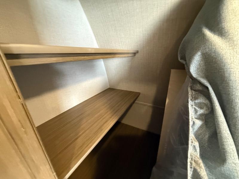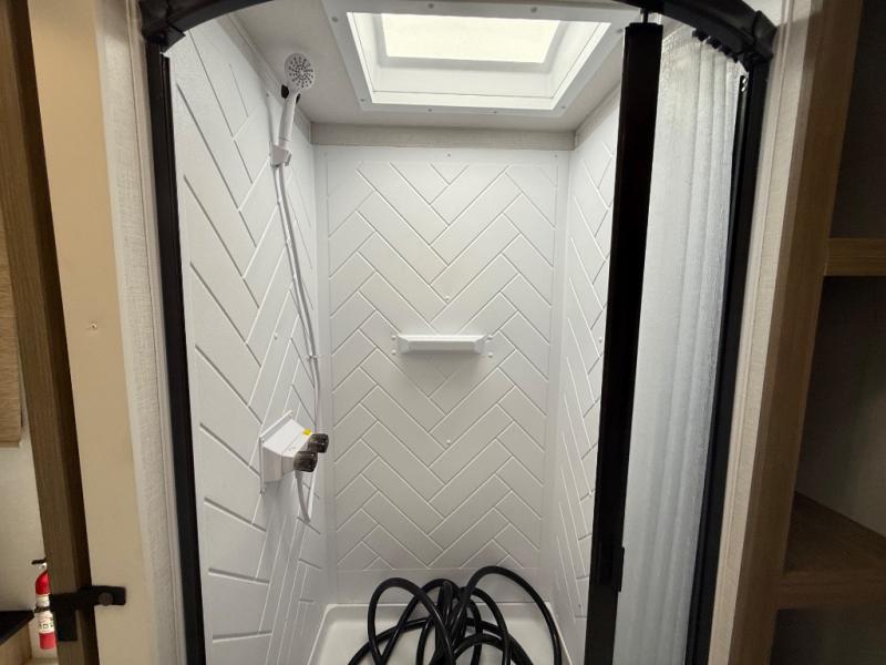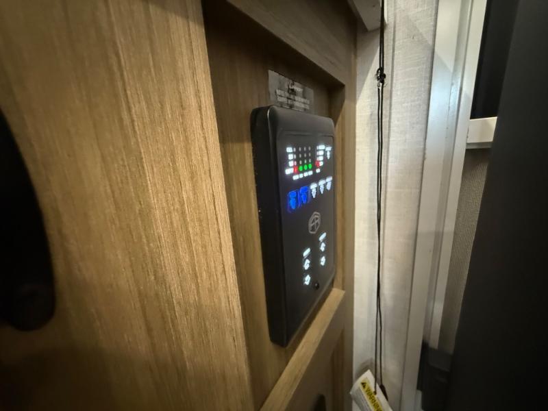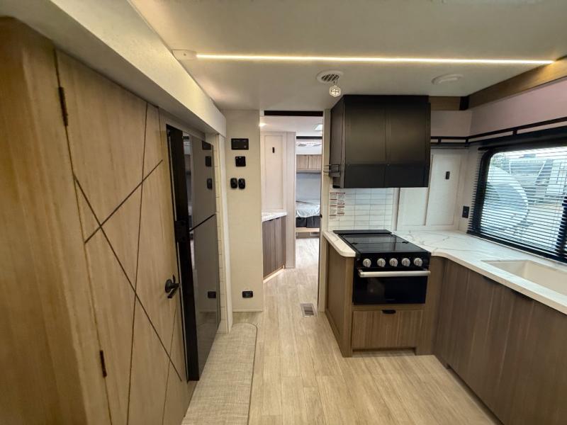Everyone will enjoy having their own space in this travel trailer thanks to the front master bedroom and the rear bunkhouse. The bunkhouse includes a wall to separate the Versa bunk and fold-down desk on one side and a Versa sofa on the other, perfect for older kids or guests. You'll have the custom king bed with Versa Tilt all to yourselves, and the walk-thru bath will be easily accessible for everyone. In the combined kitchen and living room, a jackknife sofa slide sits across from the fireplace/entertainment center, and there is a pull-out table here so you can dine together.