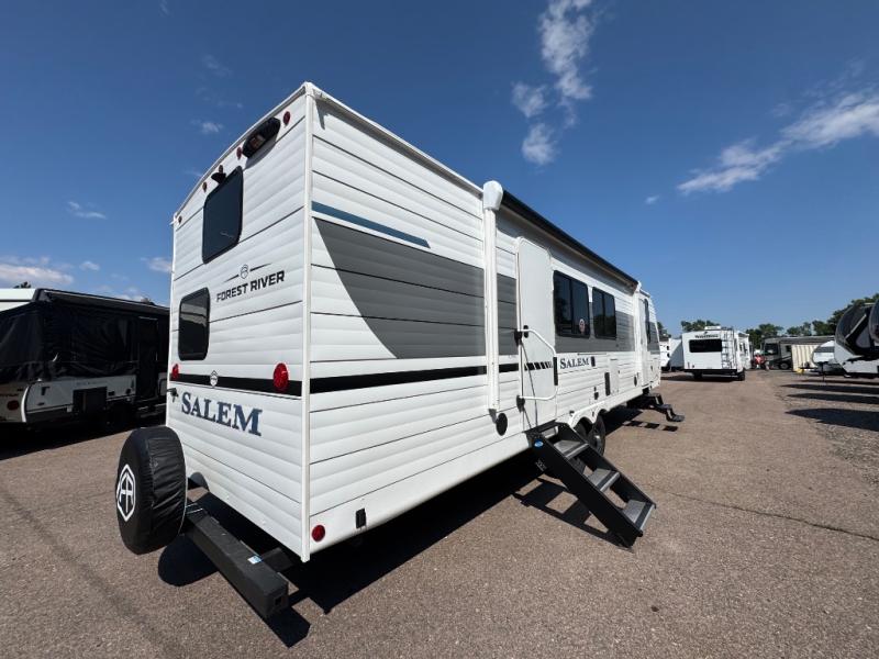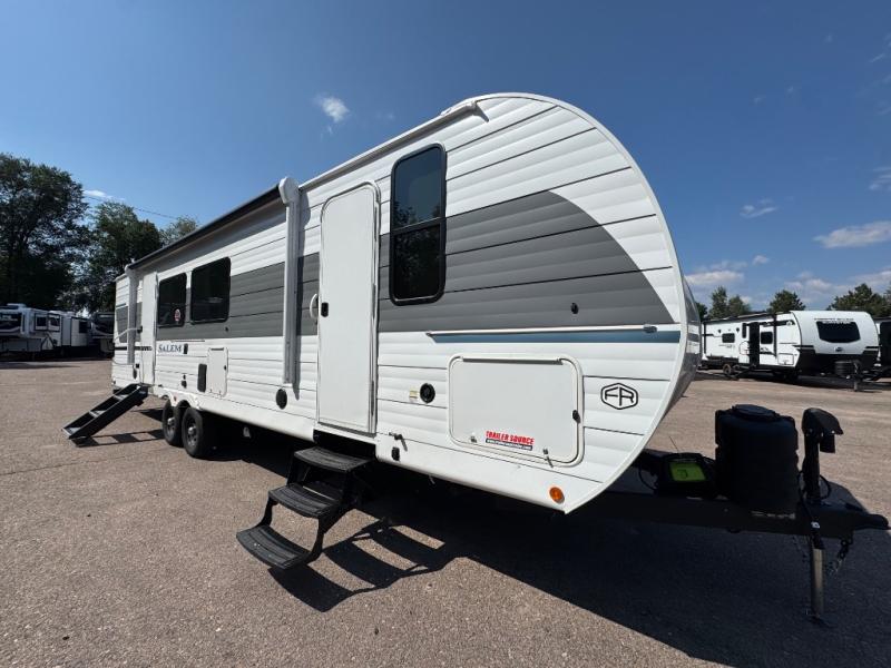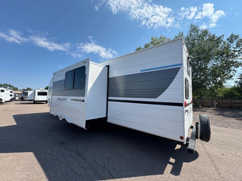 The Salem travel trailers are packed with hassle-free camping amenities and there are a variety of floorplans to choose from. The heated and enclosed Accessibelly will help protect against the elements and debris during transport, and the exterior retro/metal redesign is sure to be eye-catching! There are stylish roller shades inside, along with updated backsplash, elegant curtain rods and curtains, plus many more interior comforts! Choose a Salem travel trailer today for quality and value!