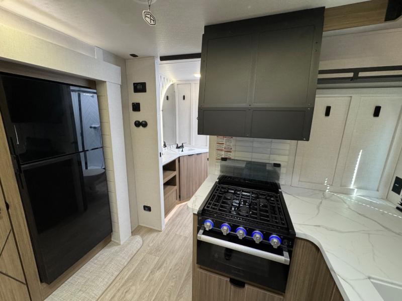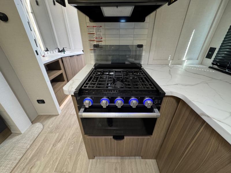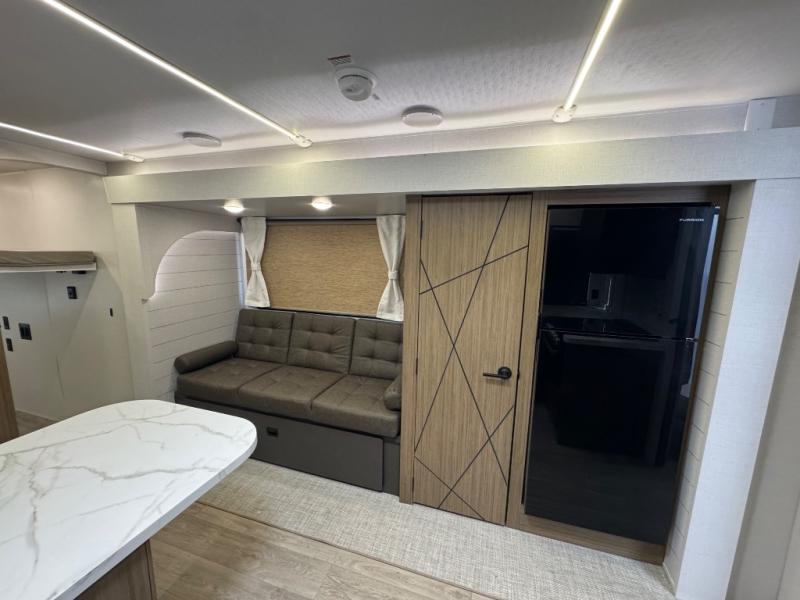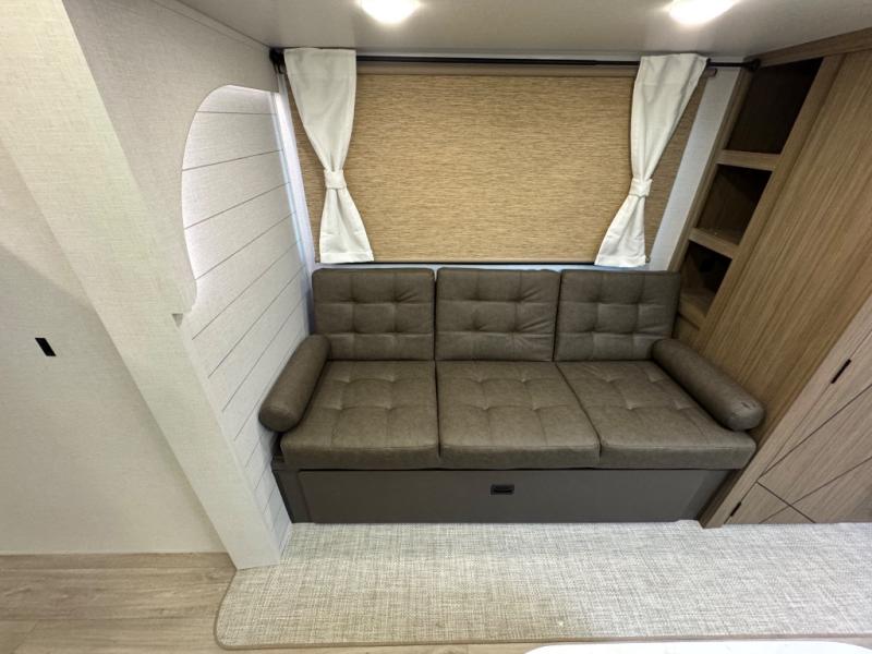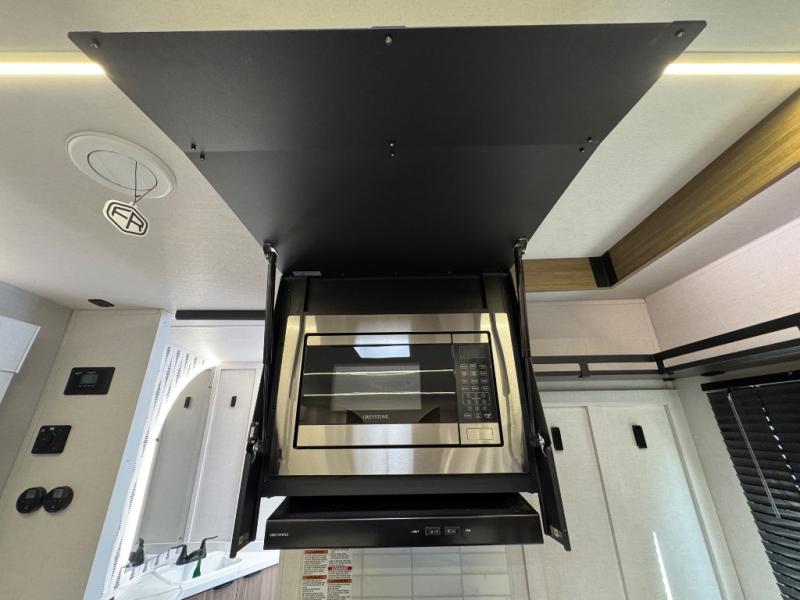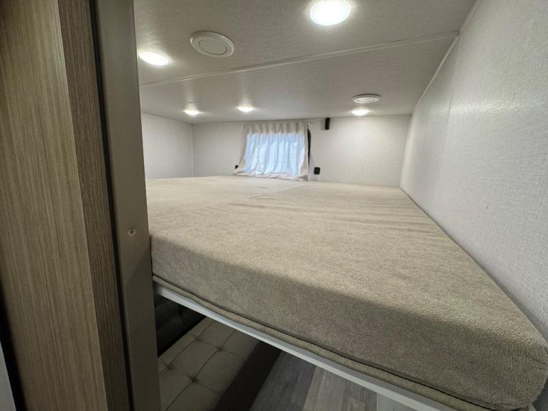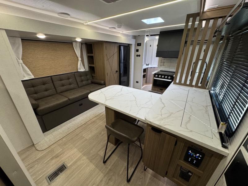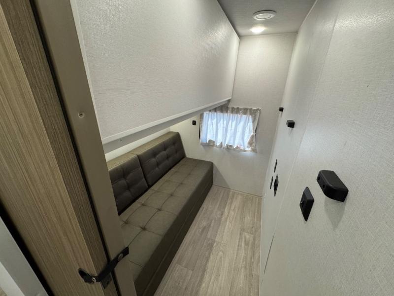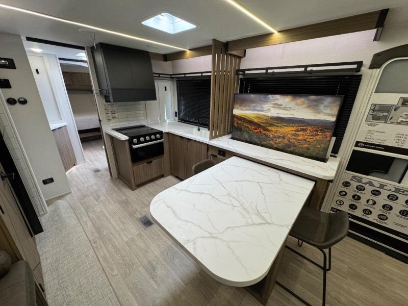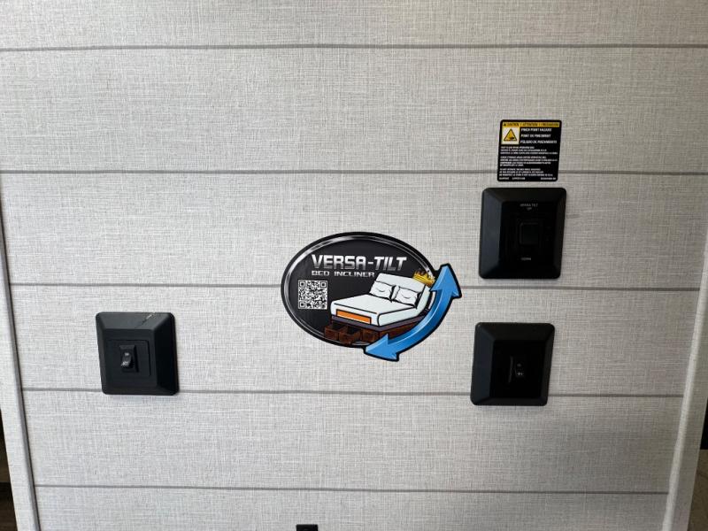 Everyone will enjoy having their own space in this travel trailer thanks to the front master bedroom and the rear bunkhouse. The bunkhouse includes a wall to separate the Versa bunk and fold-down desk on one side and a Versa sofa on the other, perfect for older kids or guests. You'll have the custom king bed with Versa Tilt all to yourselves, and the walk-thru bath will be easily accessible for everyone. In the combined kitchen and living room, a jackknife sofa slide sits across from the fireplace/entertainment center, and there is a pull-out table here so you can dine together.