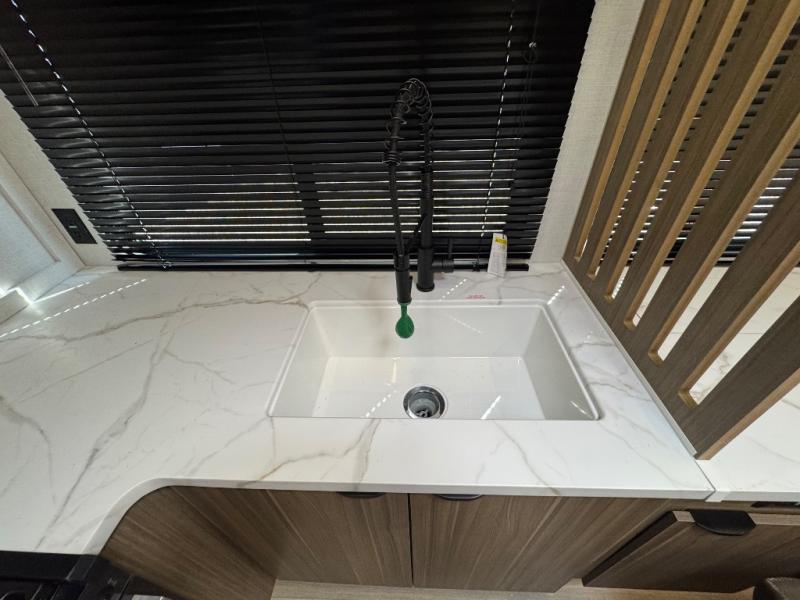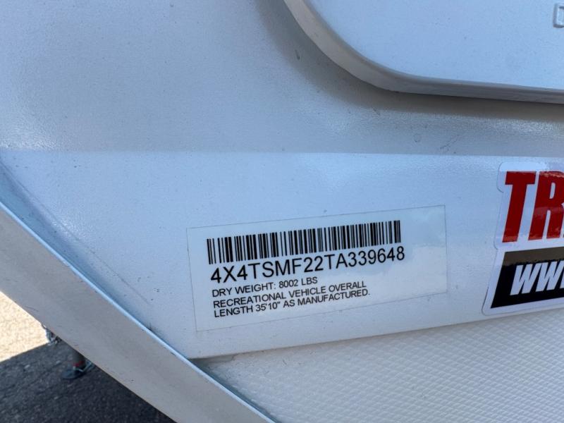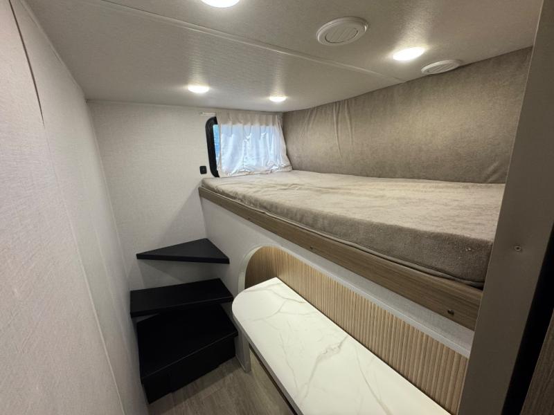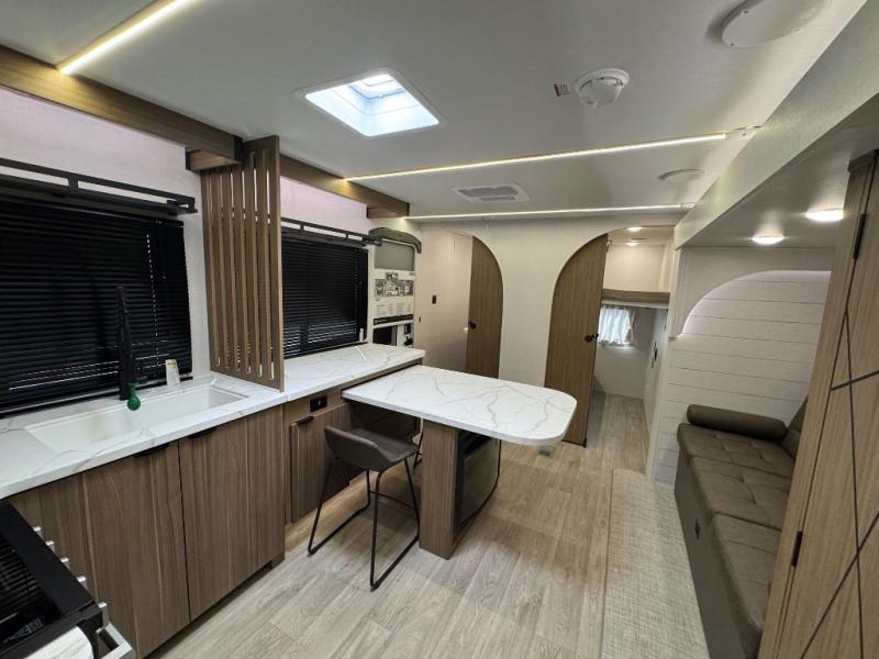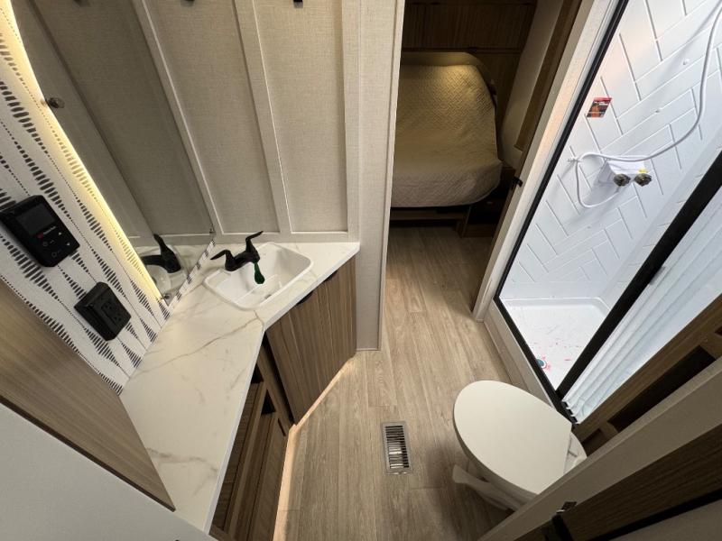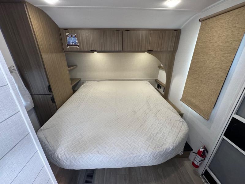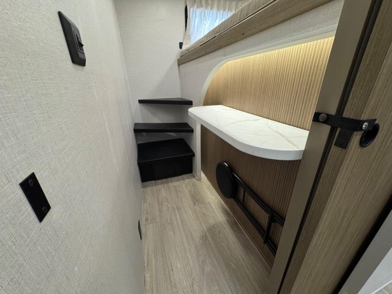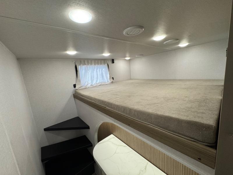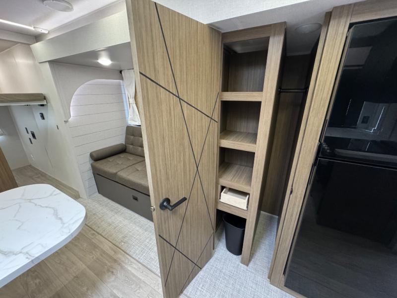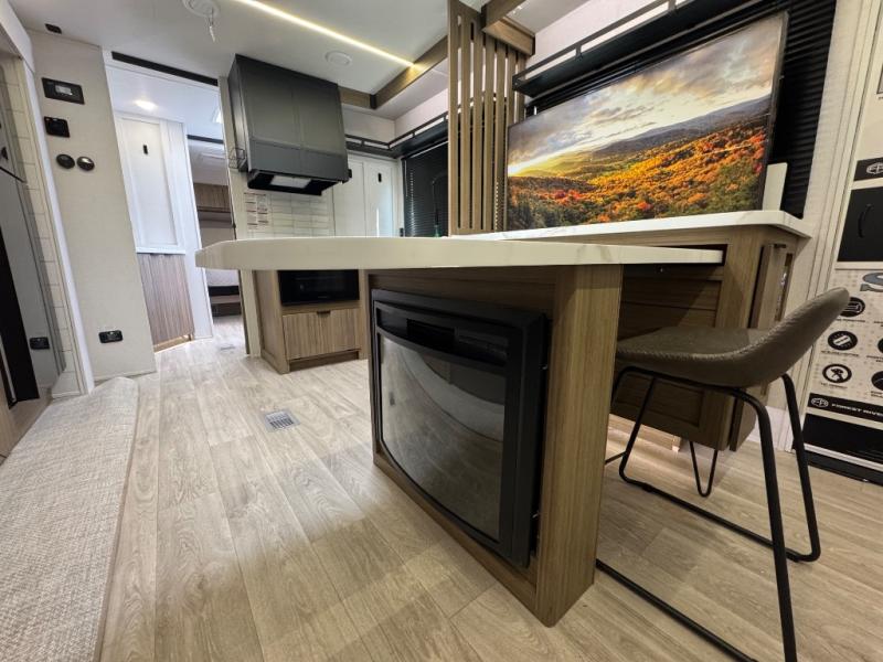 Everyone will enjoy having their own space in this travel trailer thanks to the front master bedroom and the rear bunkhouse. The bunkhouse includes a wall to separate the Versa bunk and fold-down desk on one side and a Versa sofa on the other, perfect for older kids or guests. You'll have the custom king bed with Versa Tilt all to yourselves, and the walk-thru bath will be easily accessible for everyone. In the combined kitchen and living room, a jackknife sofa slide sits across from the fireplace/entertainment center, and there is a pull-out table here so you can dine together.