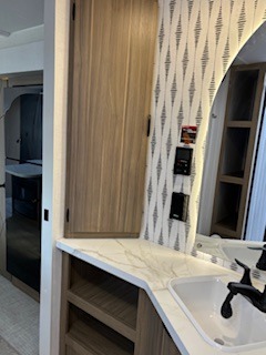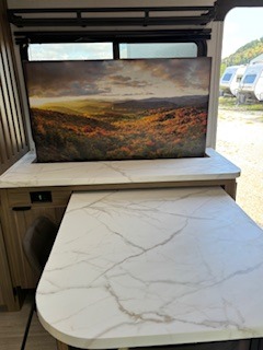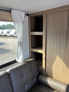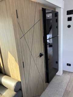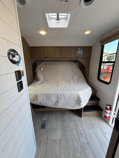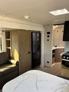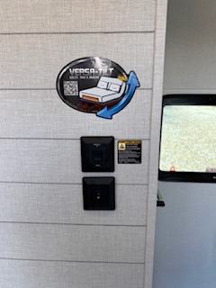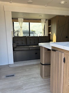 Everyone will enjoy having their own space in this travel trailer thanks to the front master bedroom and the rear bunkhouse. The bunkhouse includes a wall to separate the Versa bunk and fold-down desk on one side and a Versa sofa on the other, perfect for older kids or guests. You'll have the custom king bed with Versa Tilt all to yourselves, and the walk-thru bath will be easily accessible for everyone. In the combined kitchen and living room, a jackknife sofa slide sits across from the fireplace/entertainment center, and there is a pull-out table here so you can dine together.