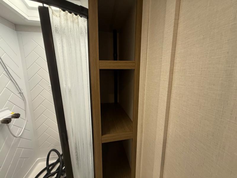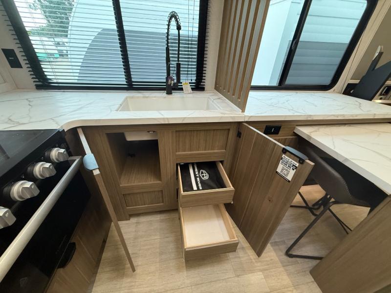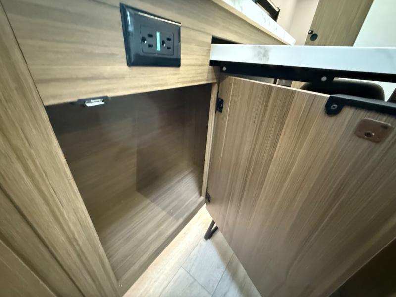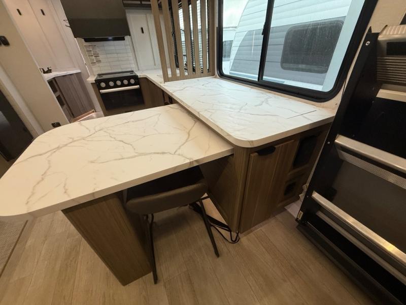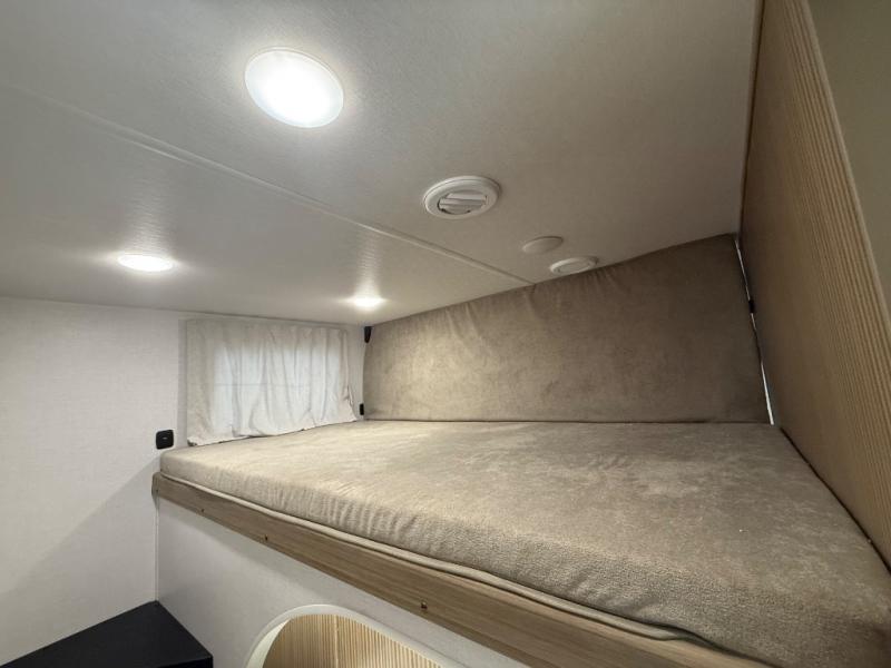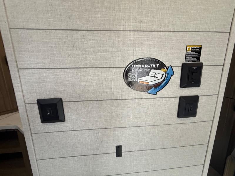 Everyone will enjoy having their own space in this travel trailer thanks to the front master bedroom and the rear bunkhouse. The bunkhouse includes a wall to separate the Versa bunk and fold-down desk on one side and a Versa sofa on the other, perfect for older kids or guests. You'll have the custom king bed with Versa Tilt all to yourselves, and the walk-thru bath will be easily accessible for everyone. In the combined kitchen and living room, a jackknife sofa slide sits across from the fireplace/entertainment center, and there is a pull-out table here so you can dine together.