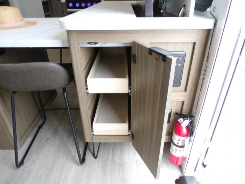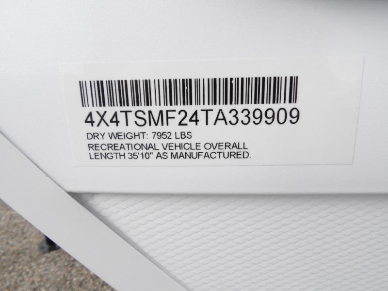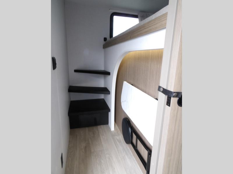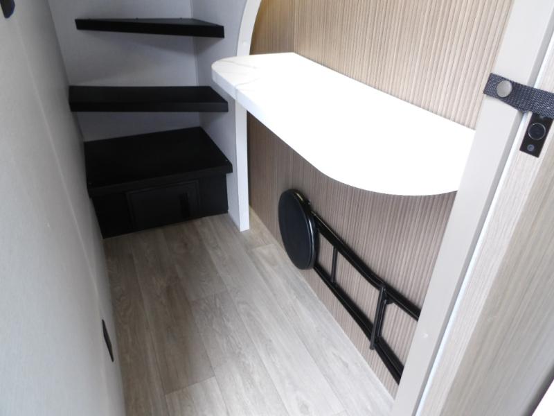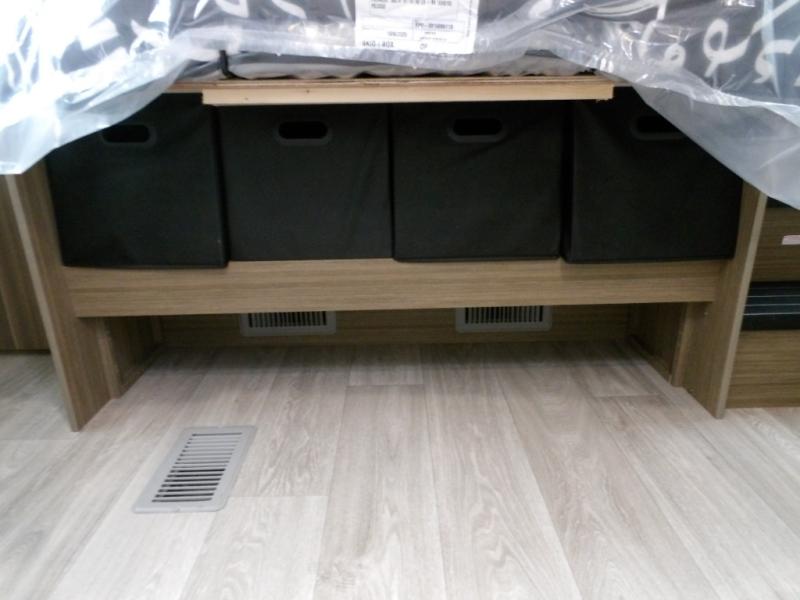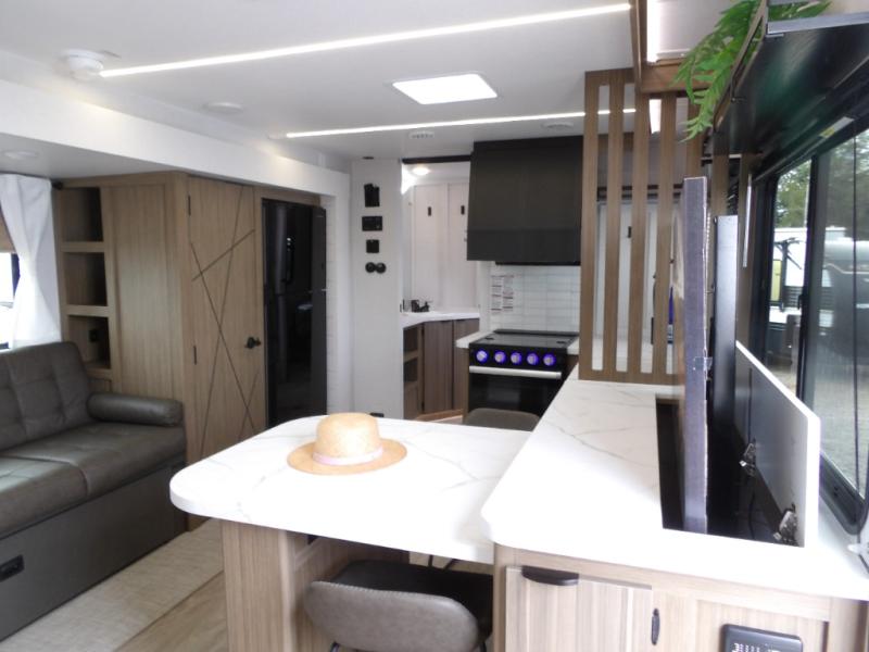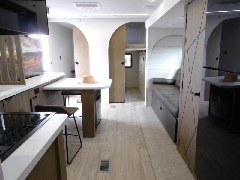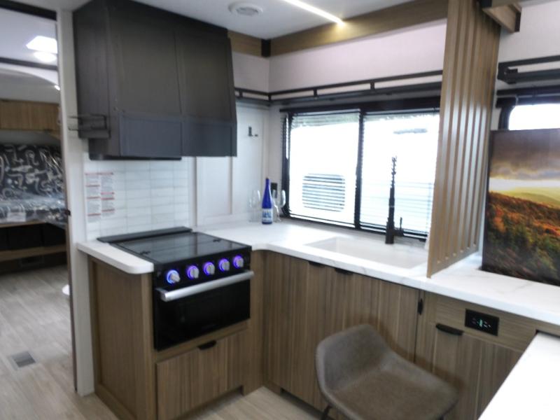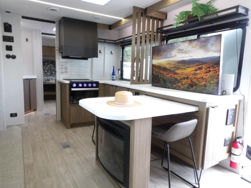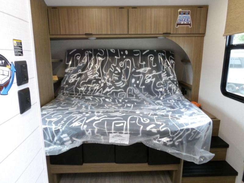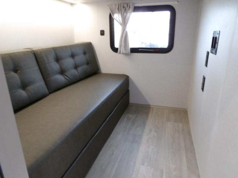 Everyone will enjoy having their own space in this travel trailer thanks to the front master bedroom and the rear bunkhouse. The bunkhouse includes a wall to separate the Versa bunk and fold-down desk on one side and a Versa sofa on the other, perfect for older kids or guests. You'll have the custom king bed with Versa Tilt all to yourselves, and the walk-thru bath will be easily accessible for everyone. In the combined kitchen and living room, a jackknife sofa slide sits across from the fireplace/entertainment center, and there is a pull-out table here so you can dine together.