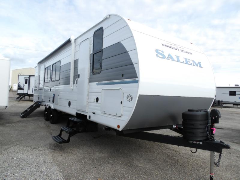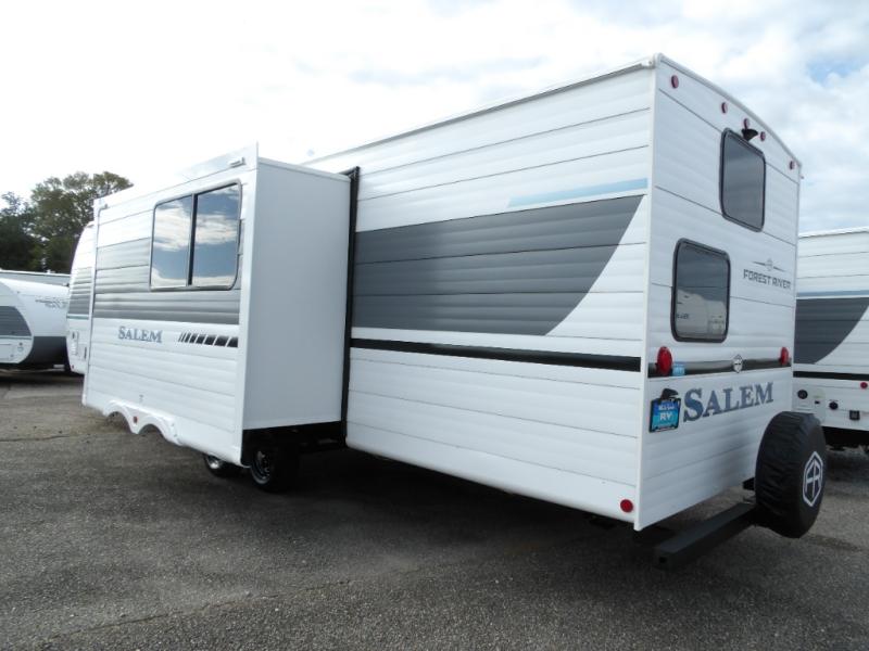 The Salem travel trailers are packed with hassle-free camping amenities and there are a variety of floorplans to choose from. The heated and enclosed Accessibelly will help protect against the elements and debris during transport, and the exterior retro/metal redesign is sure to be eye-catching! There are stylish roller shades inside, along with updated backsplash, elegant curtain rods and curtains, plus many more interior comforts! Choose a Salem travel trailer today for quality and value!