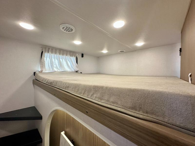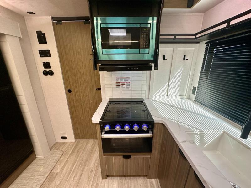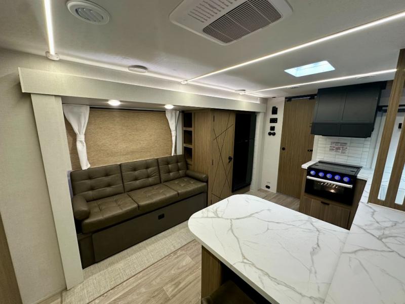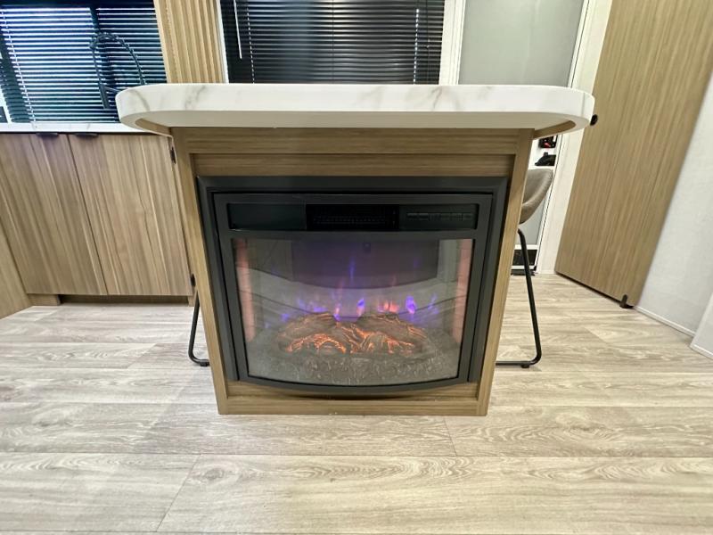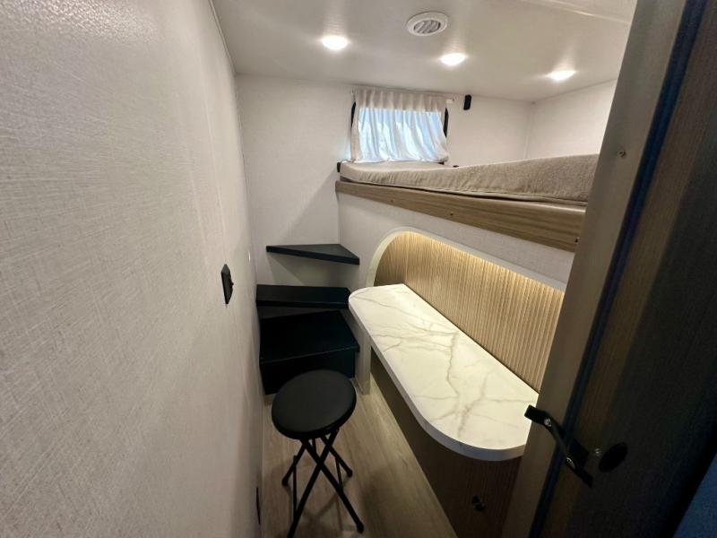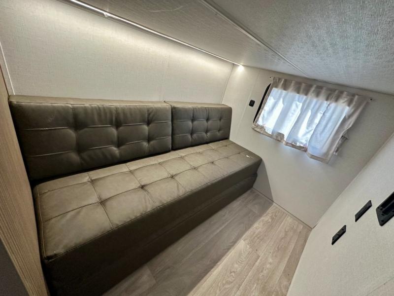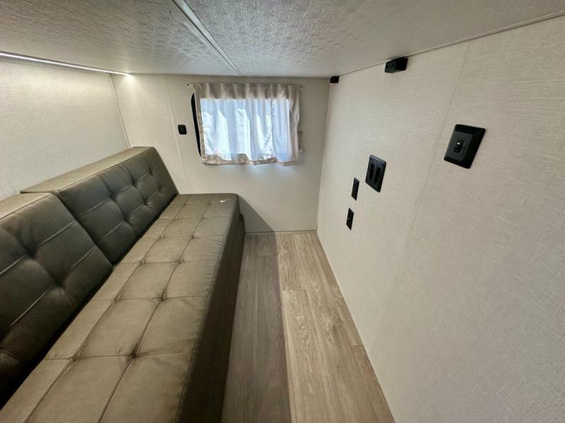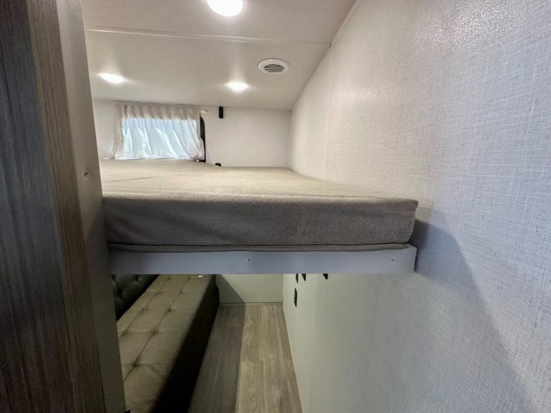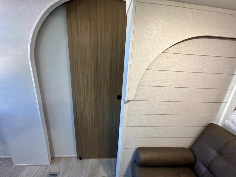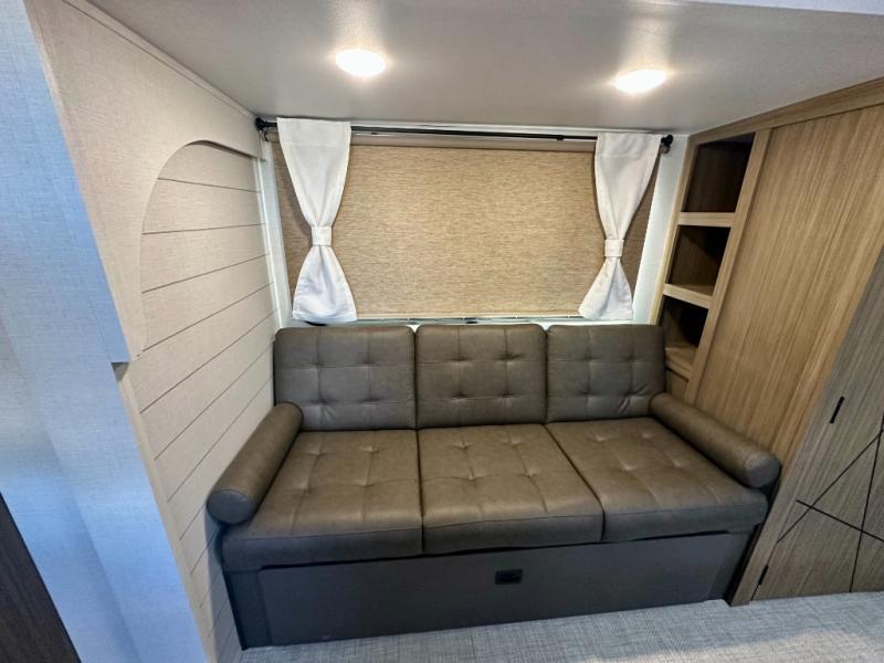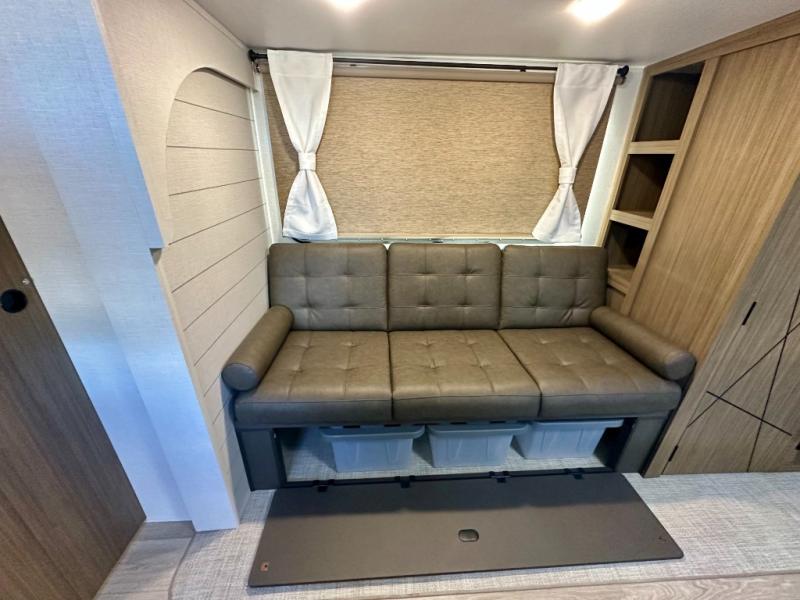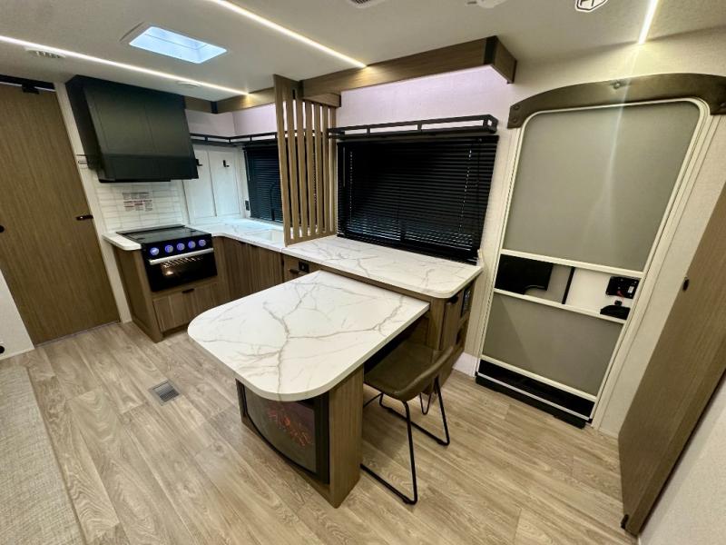 Everyone will enjoy having their own space in this travel trailer thanks to the front master bedroom and the rear bunkhouse. The bunkhouse includes a wall to separate the Versa bunk and fold-down desk on one side and a Versa sofa on the other, perfect for older kids or guests. You'll have the custom king bed with Versa Tilt all to yourselves, and the walk-thru bath will be easily accessible for everyone. In the combined kitchen and living room, a jackknife sofa slide sits across from the fireplace/entertainment center, and there is a pull-out table here so you can dine together.