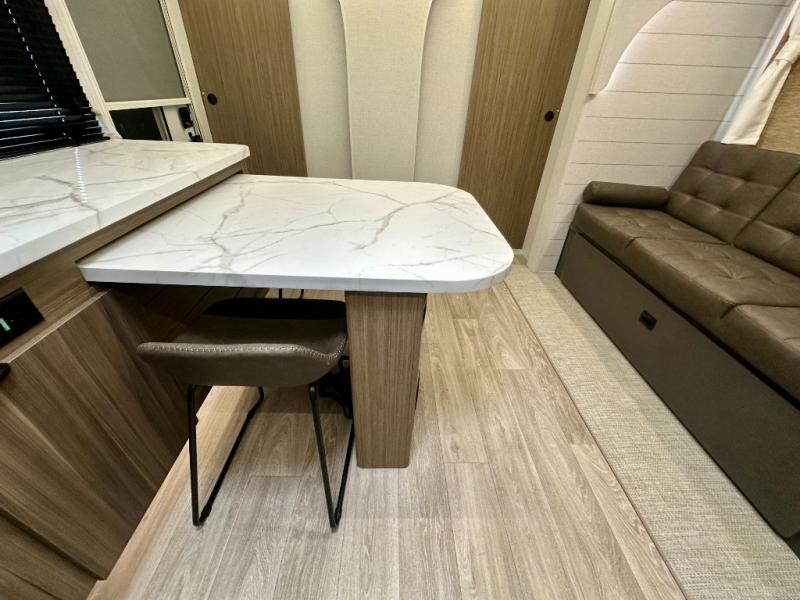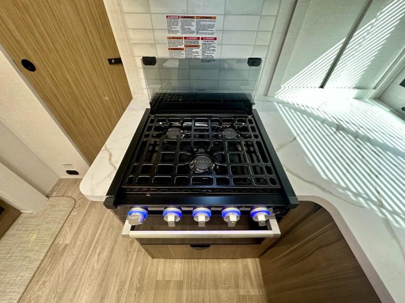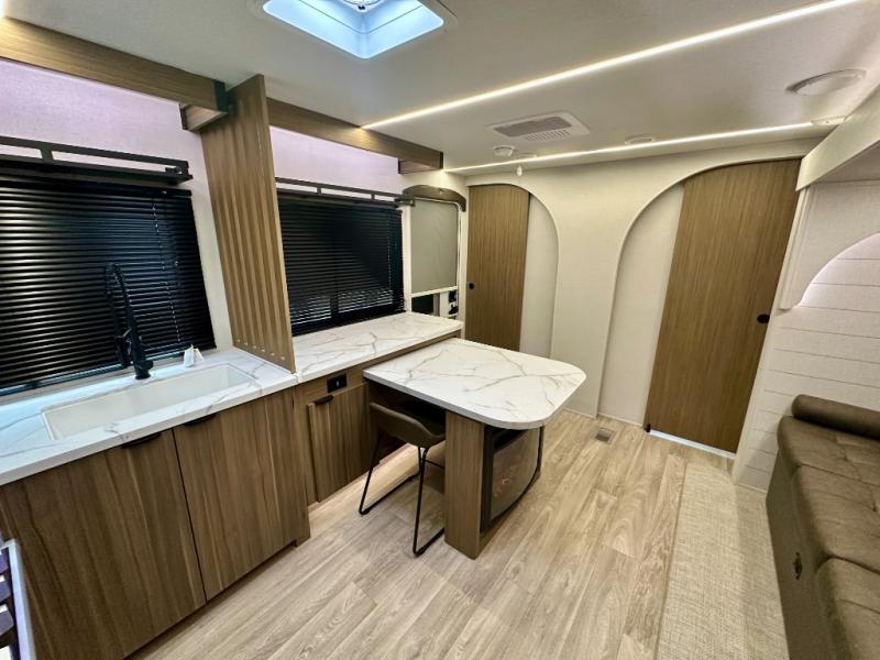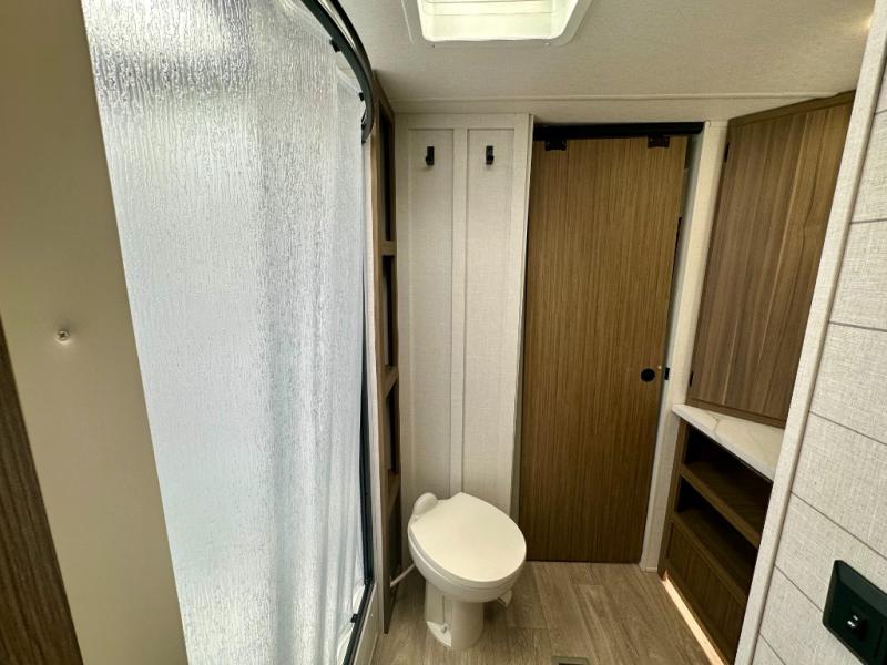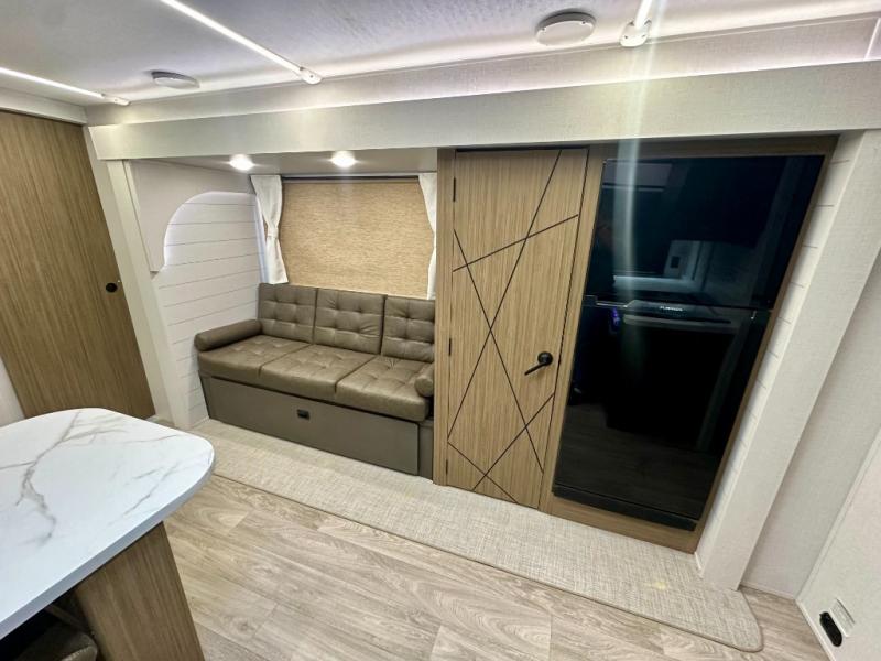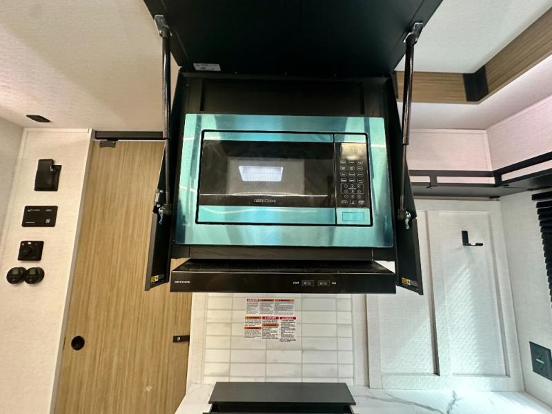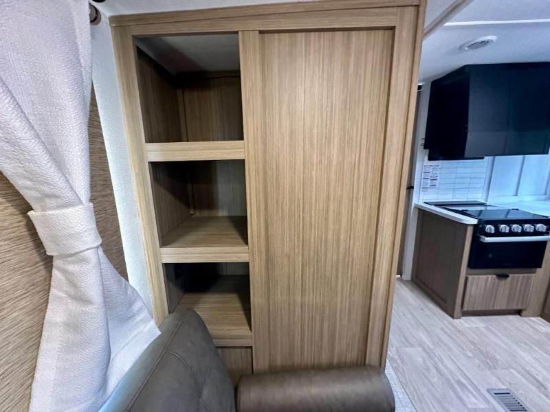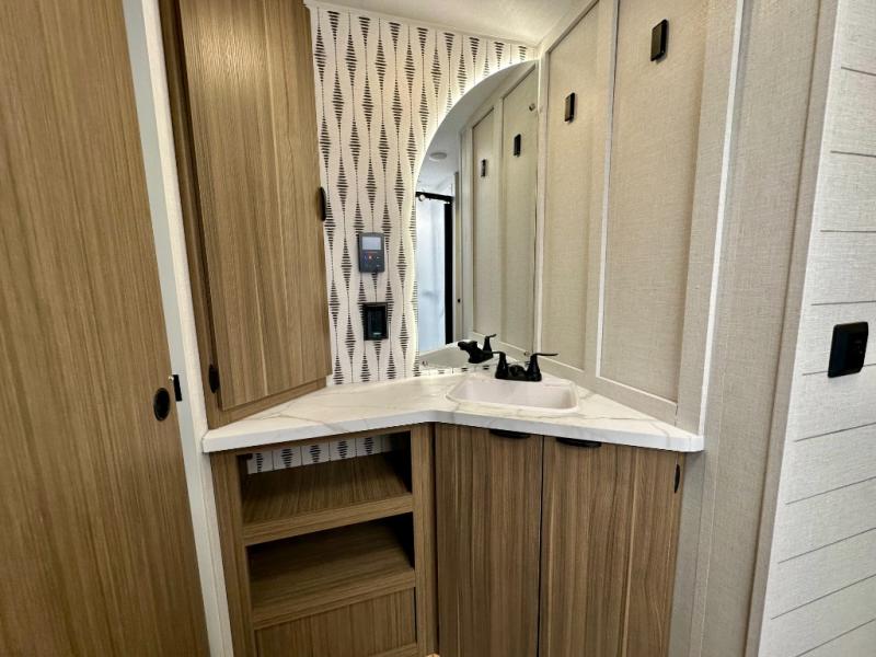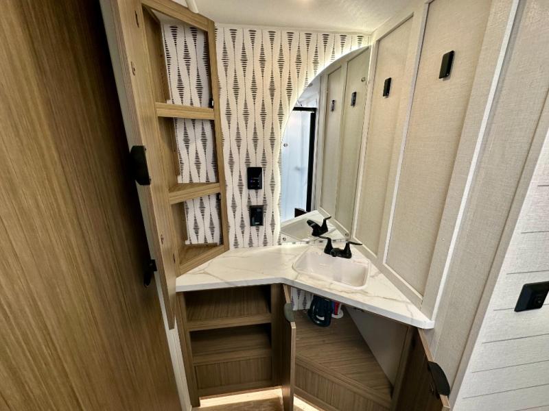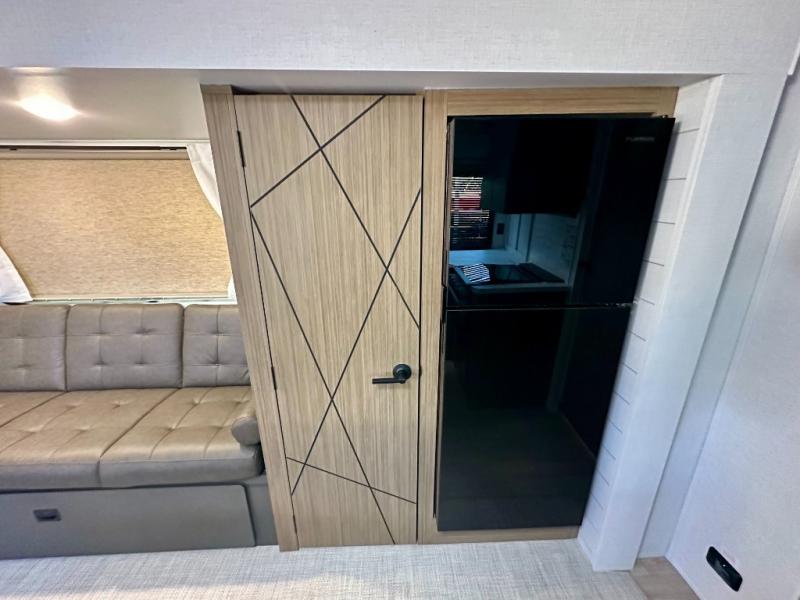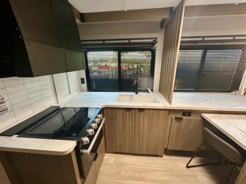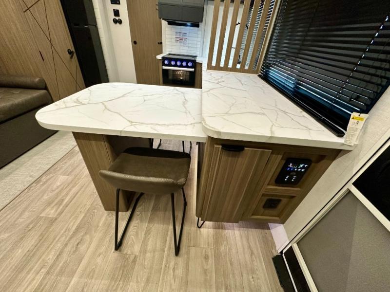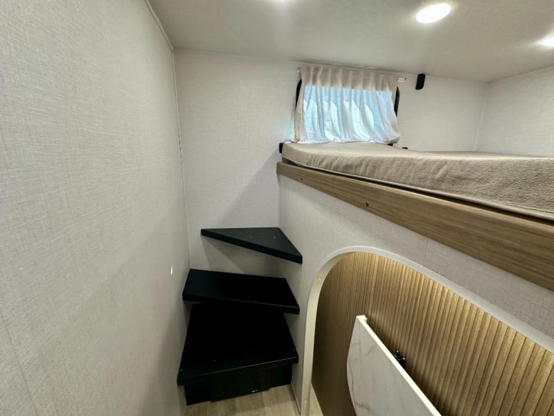 Everyone will enjoy having their own space in this travel trailer thanks to the front master bedroom and the rear bunkhouse. The bunkhouse includes a wall to separate the Versa bunk and fold-down desk on one side and a Versa sofa on the other, perfect for older kids or guests. You'll have the custom king bed with Versa Tilt all to yourselves, and the walk-thru bath will be easily accessible for everyone. In the combined kitchen and living room, a jackknife sofa slide sits across from the fireplace/entertainment center, and there is a pull-out table here so you can dine together.