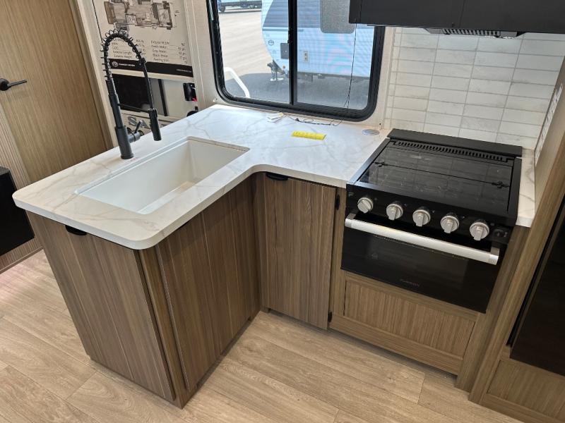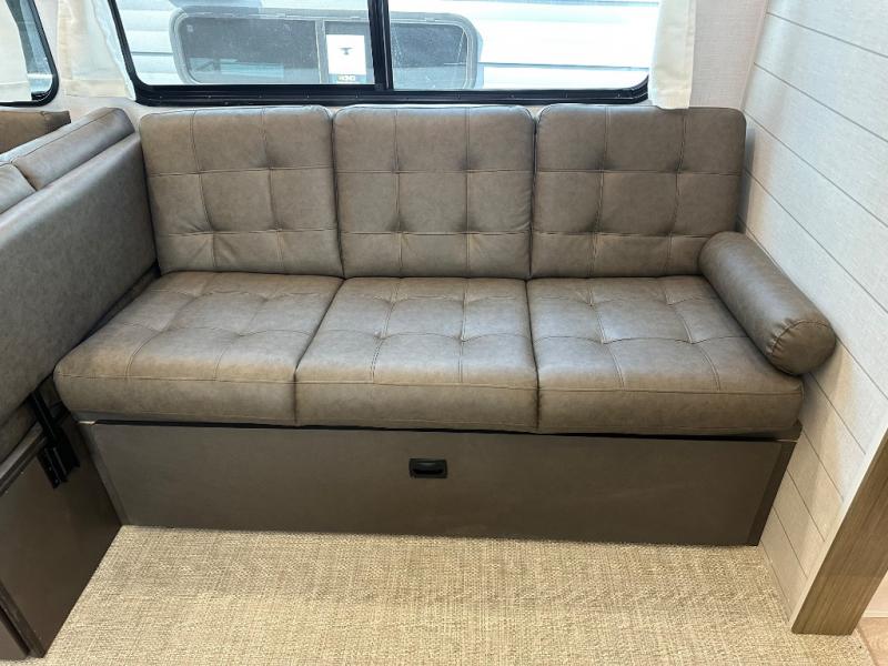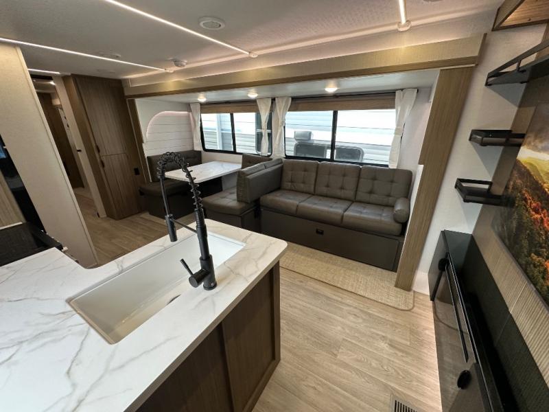 The rear private bunkhouse in this Salem travel trailer is super accommodating for your kids or your overnight guests! It has two opposing slides which provide extra floor space and a full-width closet/entertainment center which delivers extra space for backpacks and tennis shoes. The front private bedroom will be perfect for you with its custom king bed and dual closets, and any additional guests can sleep on the L-shaped versa lounge. There is also a Versa Flex table here to dine at or get some work done. Everyone will enjoy their own space when it's time to freshen up in the full bath with a walk-in shower, and the chef of the group will have all the appliances needed to make meals each day. And don't forget about the outdoor kitchen for outdoor fun!