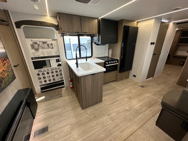 The Salem travel trailers are packed with hassle-free camping amenities! There are a variety of floorplans to choose from between three different regions. The heated and enclosed Accessibelly will help protect against the elements and debris during transport, and the exterior retro/metal redesign is sure to be eye-catching! There are stylish roller shades inside, along with updated backsplash, elegant curtain rods and curtains, plus many more interior comforts! Choose a Salem travel trailer today for quality and value!
