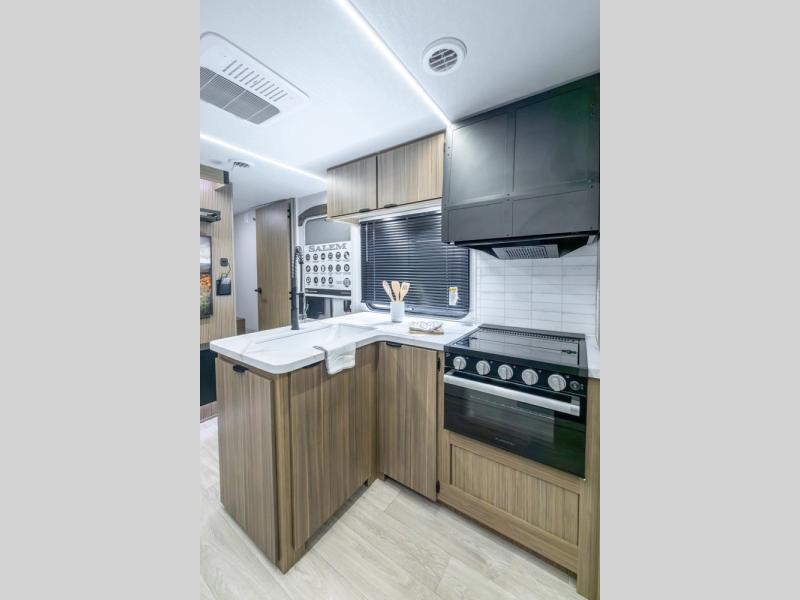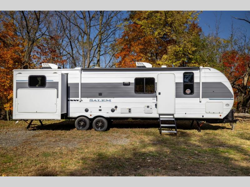 The Salem travel trailers are packed with hassle-free camping amenities! There are a variety of floorplans to choose from between three different regions. The heated and enclosed Accessibelly will help protect against the elements and debris during transport, and the exterior retro/metal redesign is sure to be eye-catching! There are stylish roller shades inside, along with updated backsplash, elegant curtain rods and curtains, plus many more interior comforts! Choose a Salem travel trailer today for quality and value!