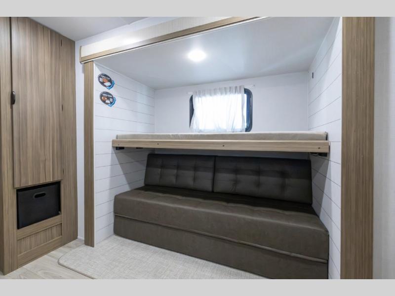The rear private bunkhouse in this Salem travel trailer is super accommodating for your kids or your overnight guests! It has two opposing slides which provide extra floor space and a full-width closet/entertainment center which delivers extra space for backpacks and tennis shoes. The front private bedroom will be perfect for you with its custom king bed and dual closets, and any additional guests can sleep on the L-shaped versa lounge. There is also a Versa Flex table here to dine at or get some work done. Everyone will enjoy their own space when it's time to freshen up in the full bath with a walk-in shower, and the chef of the group will have all the appliances needed to make meals each day. And don't forget about the outdoor kitchen for outdoor fun!