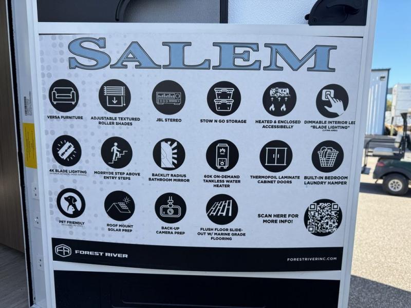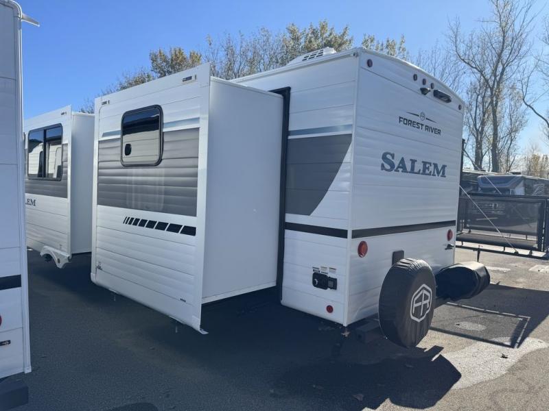 The Salem travel trailers are packed with hassle-free camping amenities! There are a variety of floorplans to choose from between three different regions. The heated and enclosed Accessibelly will help protect against the elements and debris during transport, and the exterior retro/metal redesign is sure to be eye-catching! There are stylish roller shades inside, along with updated backsplash, elegant curtain rods and curtains, plus many more interior comforts! Choose a Salem travel trailer today for quality and value!