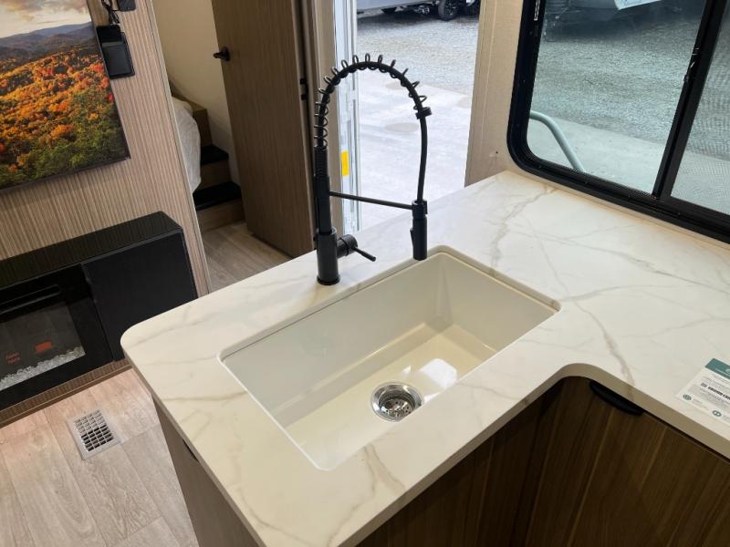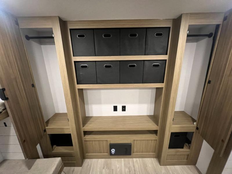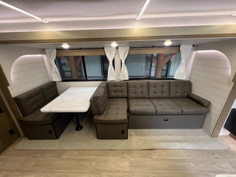 The rear private bunkhouse in this Salem travel trailer is super accommodating for your kids or your overnight guests! It has two opposing slides which provide extra floor space and a full-width closet/entertainment center which delivers extra space for backpacks and tennis shoes. The front private bedroom will be perfect for you with its custom king bed and dual closets, and any additional guests can sleep on the L-shaped versa lounge. There is also a Versa Flex table here to dine at or get some work done. Everyone will enjoy their own space when it's time to freshen up in the full bath with a walk-in shower, and the chef of the group will have all the appliances needed to make meals each day. And don't forget about the outdoor kitchen for outdoor fun!