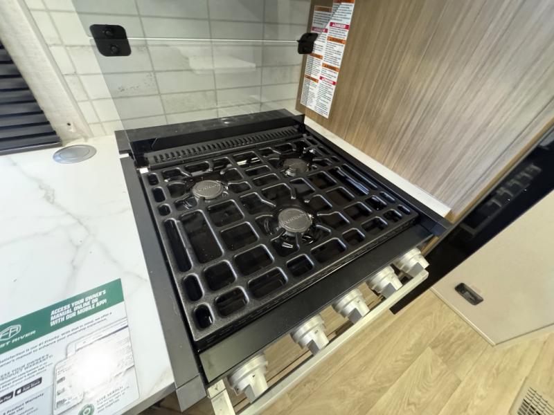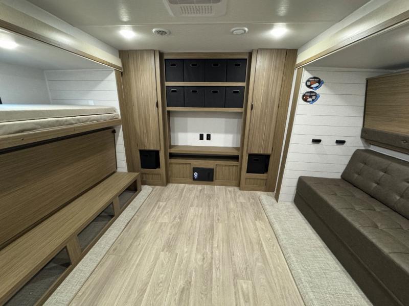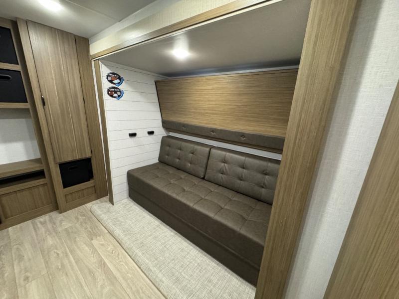 The rear private bunkhouse in this Salem travel trailer is super accommodating for your kids or your overnight guests! It has two opposing slides which provide extra floor space and a full-width closet/entertainment center which delivers extra space for backpacks and tennis shoes. The front private bedroom will be perfect for you with its custom king bed and dual closets, and any additional guests can sleep on the L-shaped versa lounge. There is also a Versa Flex table here to dine at or get some work done. Everyone will enjoy their own space when it's time to freshen up in the full bath with a walk-in shower, and the chef of the group will have all the appliances needed to make meals each day. And don't forget about the outdoor kitchen for outdoor fun!