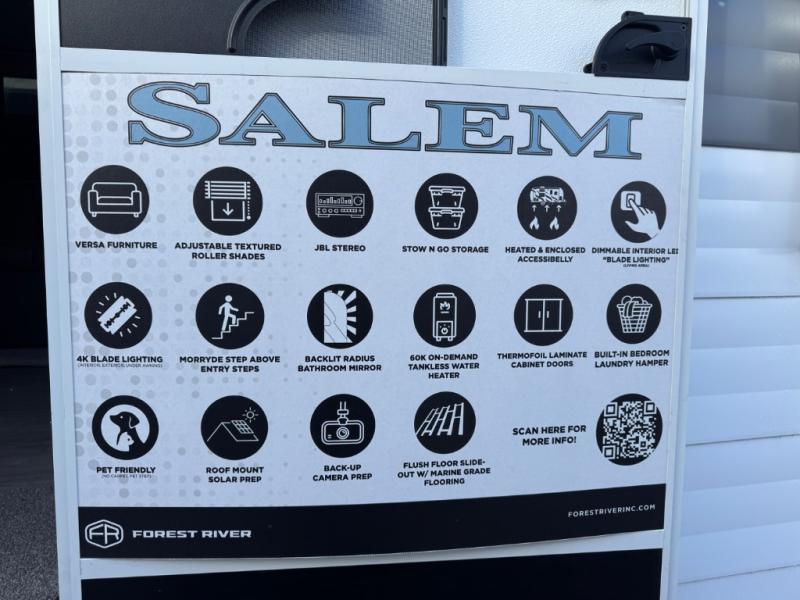 The Salem travel trailers are packed with hassle-free camping amenities! There are a variety of floorplans to choose from between three different regions. The heated and enclosed Accessibelly will help protect against the elements and debris during transport, and the exterior retro/metal redesign is sure to be eye-catching! There are stylish roller shades inside, along with updated backsplash, elegant curtain rods and curtains, plus many more interior comforts! Choose a Salem travel trailer today for quality and value!