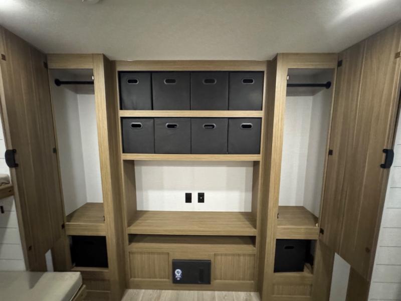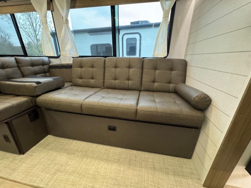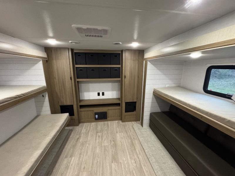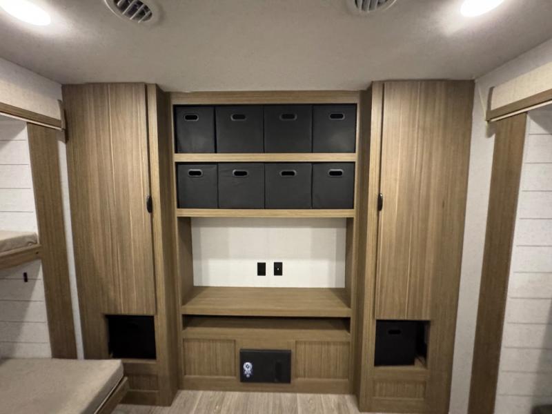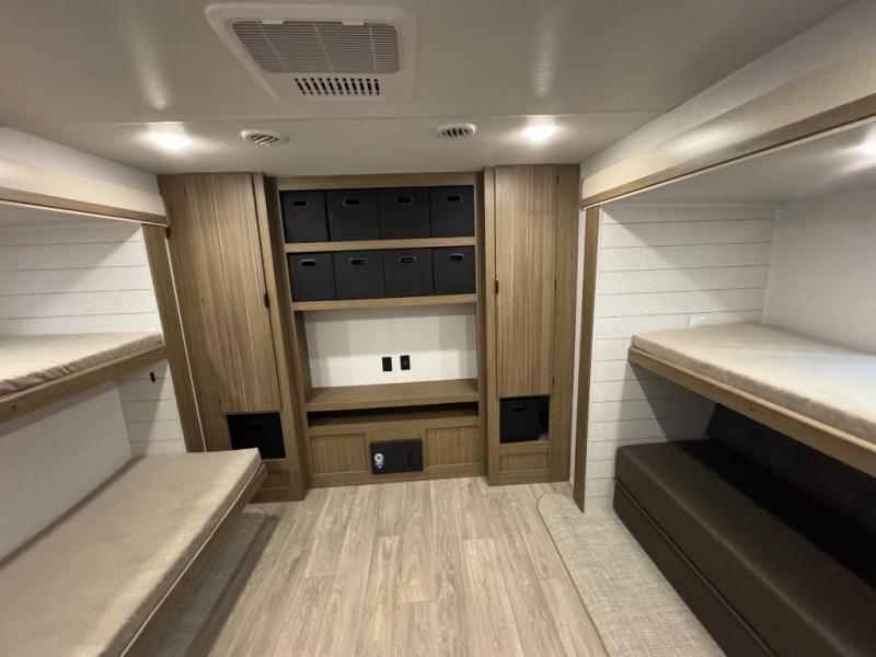 The rear private bunkhouse in this Salem travel trailer is super accommodating for your kids or your overnight guests! It has two opposing slides which provide extra floor space and a full-width closet/entertainment center which delivers extra space for backpacks and tennis shoes. The front private bedroom will be perfect for you with its custom king bed and dual closets, and any additional guests can sleep on the L-shaped versa lounge. There is also a Versa Flex table here to dine at or get some work done. Everyone will enjoy their own space when it's time to freshen up in the full bath with a walk-in shower, and the chef of the group will have all the appliances needed to make meals each day. And don't forget about the outdoor kitchen for outdoor fun!