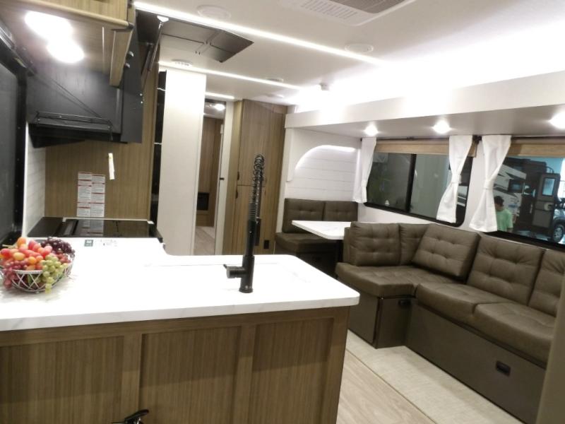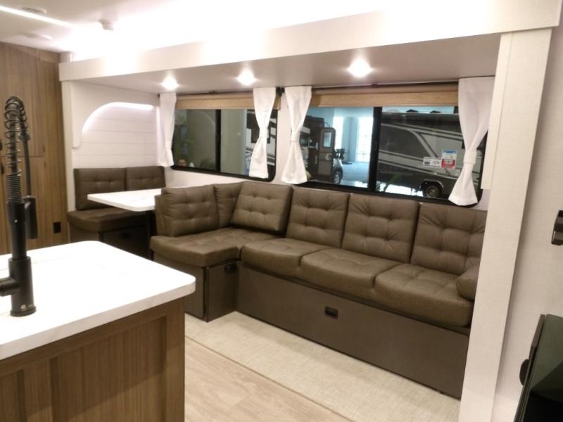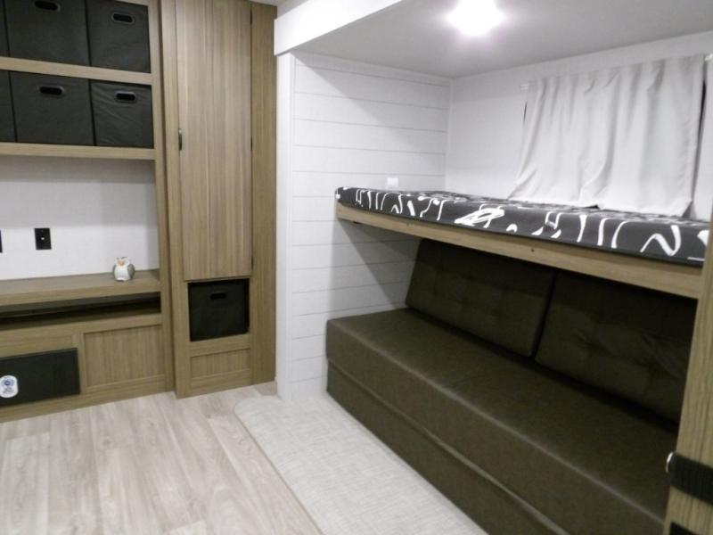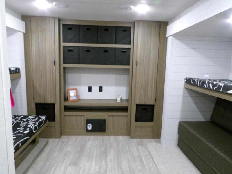 The rear private bunkhouse in this Salem travel trailer is super accommodating for your kids or your overnight guests! It has two opposing slides which provide extra floor space and a full-width closet/entertainment center which delivers extra space for backpacks and tennis shoes. The front private bedroom will be perfect for you with its custom king bed and dual closets, and any additional guests can sleep on the L-shaped versa lounge. There is also a booth dinette here to dine at or get some work done. Everyone will enjoy their own space when it's time to freshen up in the full bath with a walk-in shower, and the chef of the group will have all the appliances needed to make meals each day. And don't forget about the outdoor kitchen for outdoor fun!