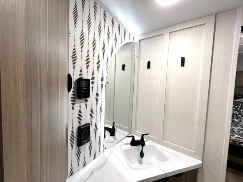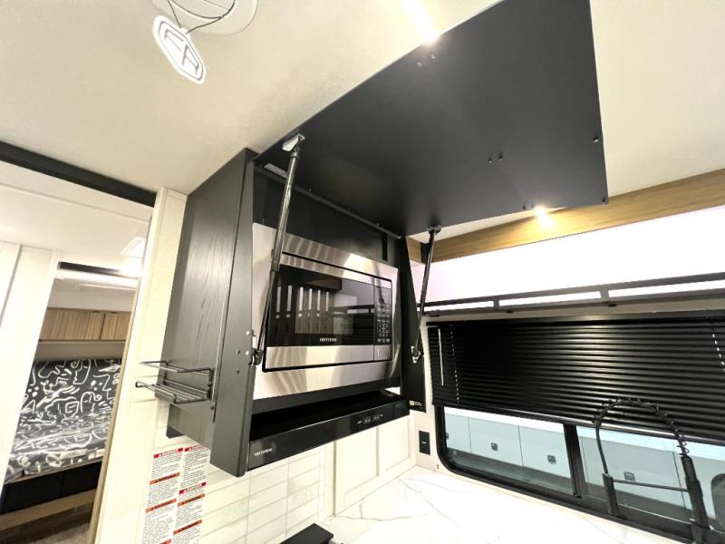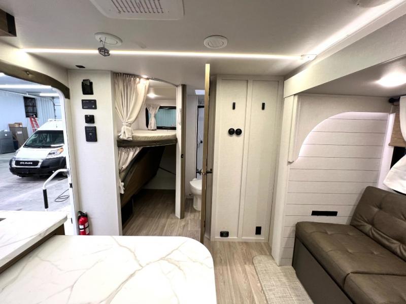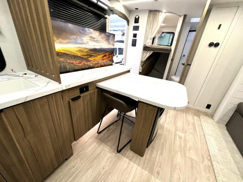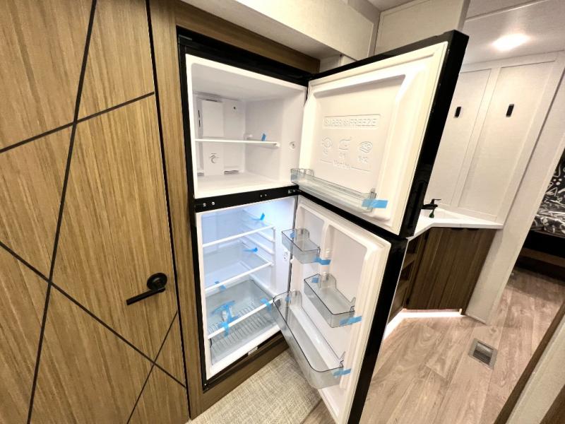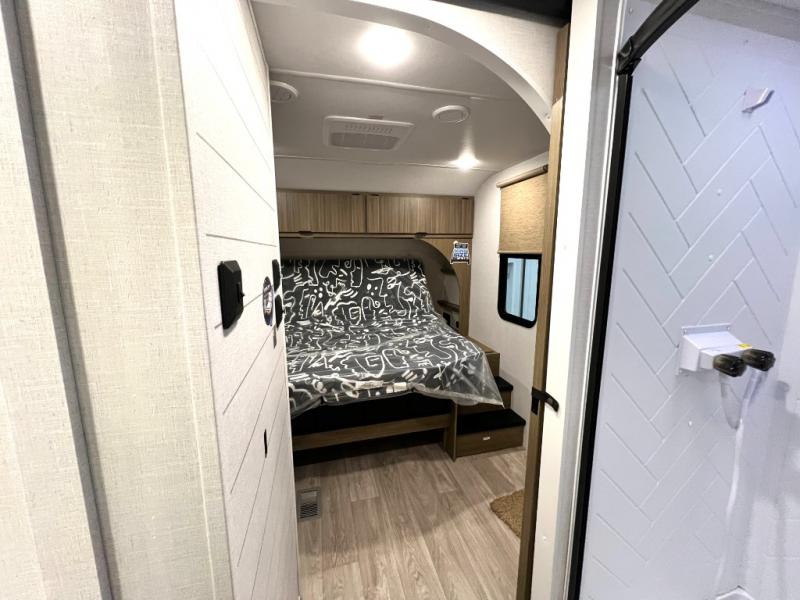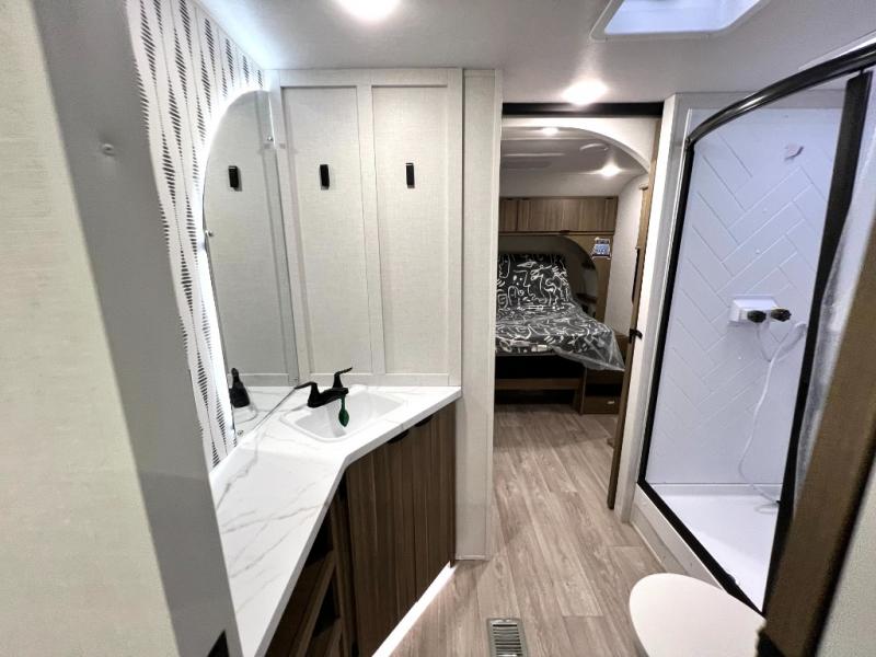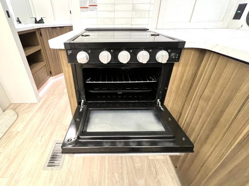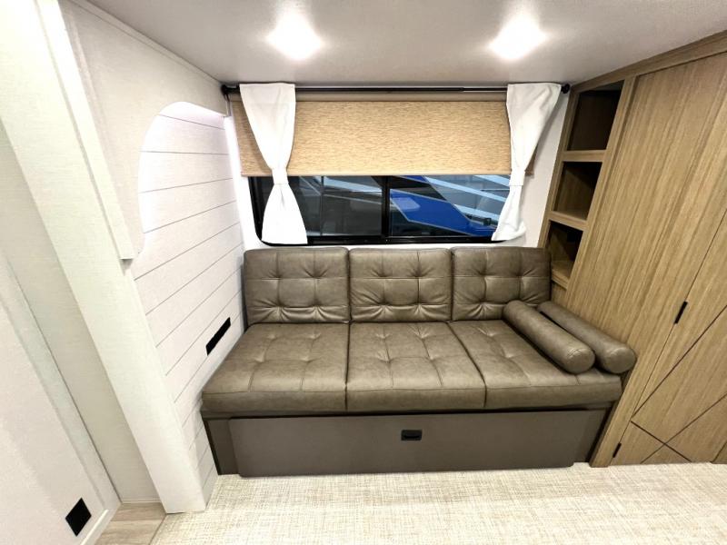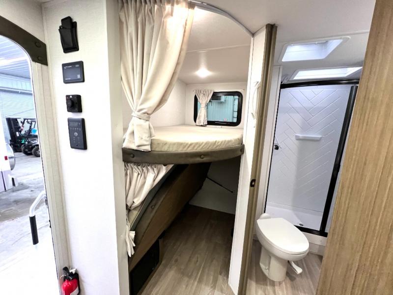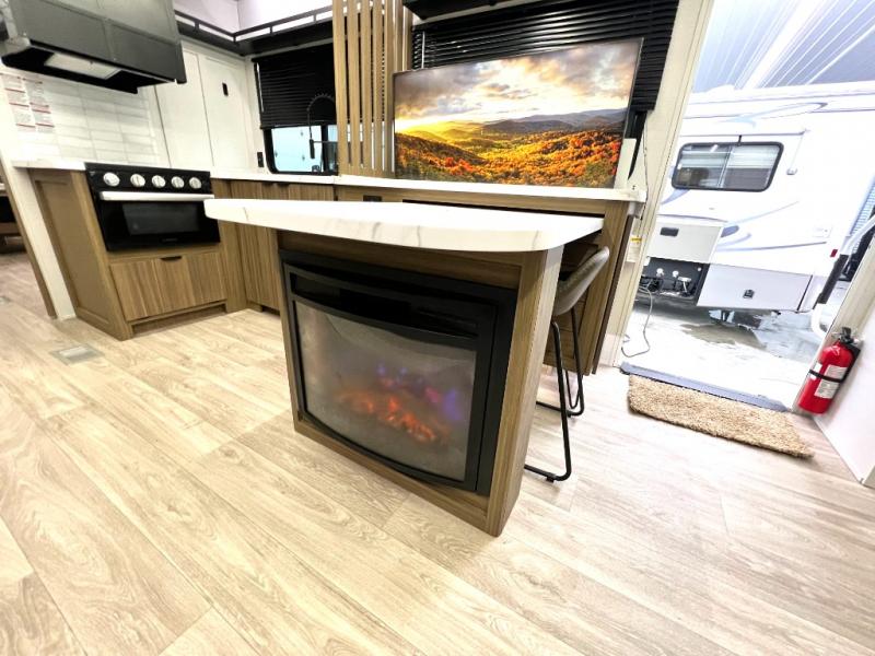 Everyone will love camping in this spacious travel trailer with double-size bunks and a large slide out for more space. You'll have the custom king bed with Versa Tilt all to yourselves, and the walk-thru bath will be easily accessible for everyone. In the combined kitchen and living room, a sofa slide sits across from the fireplace/entertainment center, and there is a pull-out table here so you can dine together.