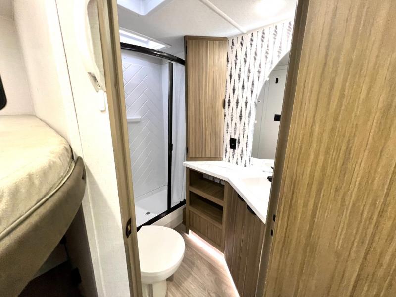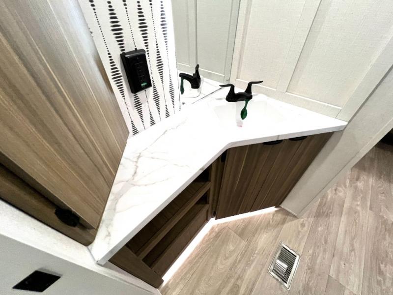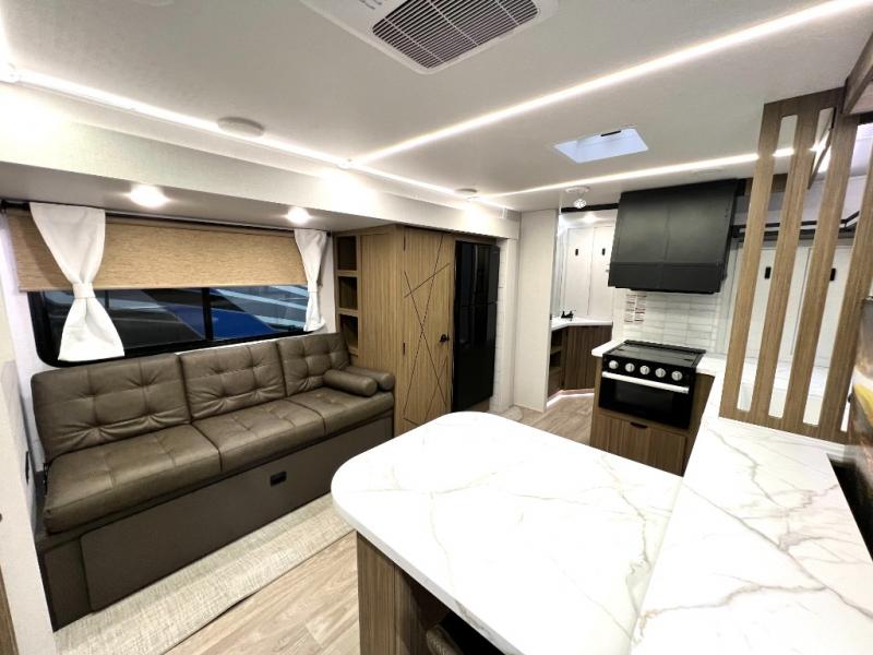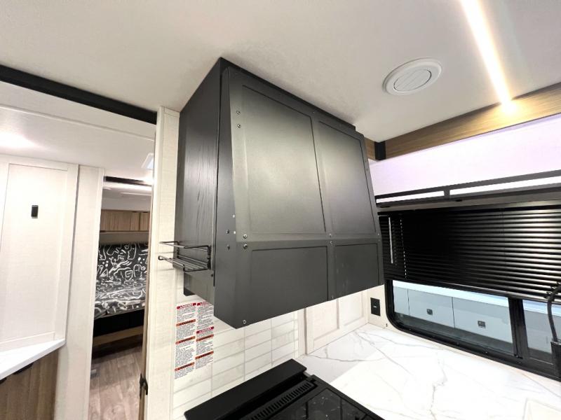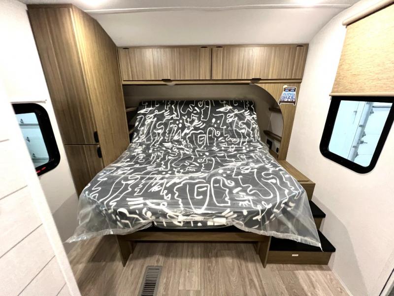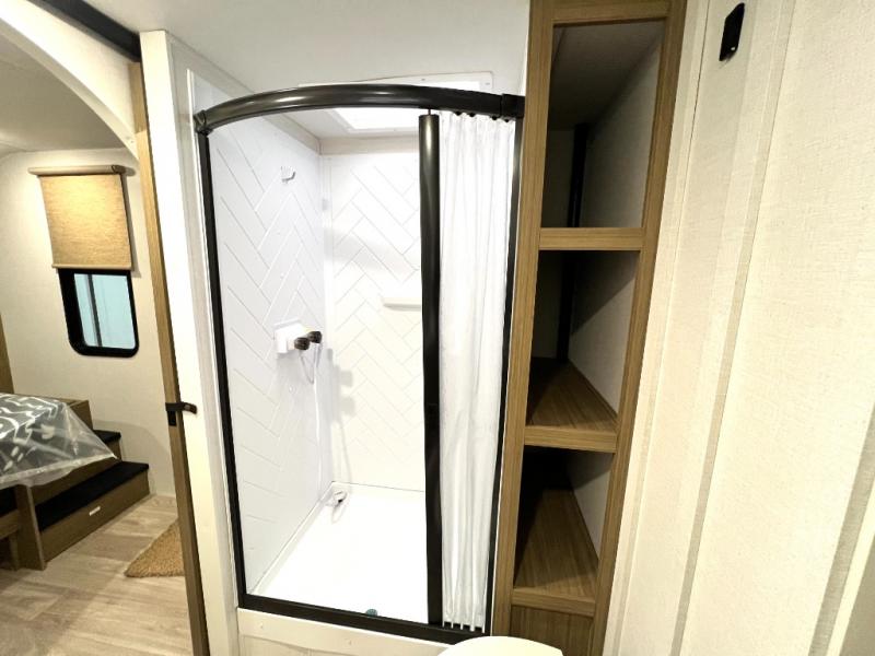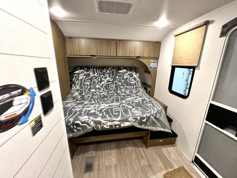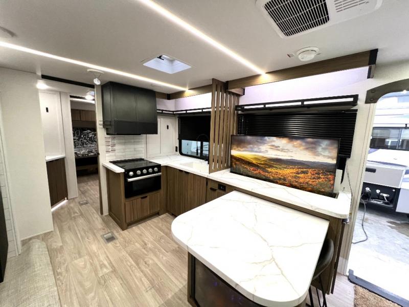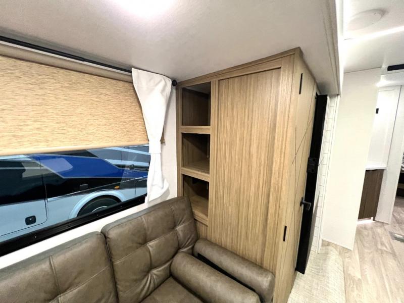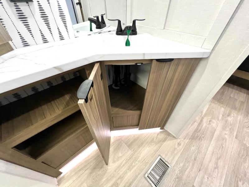 Everyone will love camping in this spacious travel trailer with double-size bunks and a large slide out for more space. You'll have the custom king bed with Versa Tilt all to yourselves, and the walk-thru bath will be easily accessible for everyone. In the combined kitchen and living room, a sofa slide sits across from the fireplace/entertainment center, and there is a pull-out table here so you can dine together.