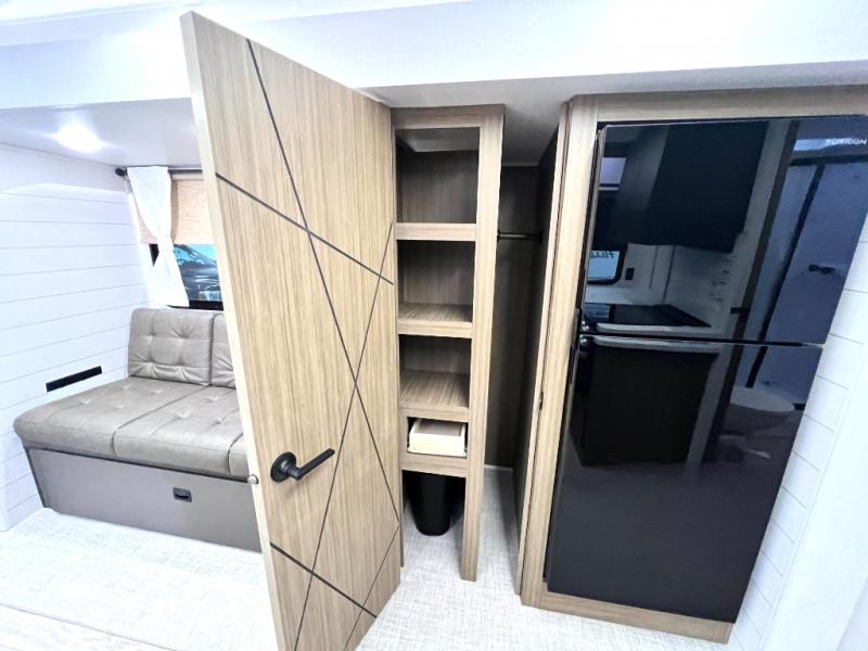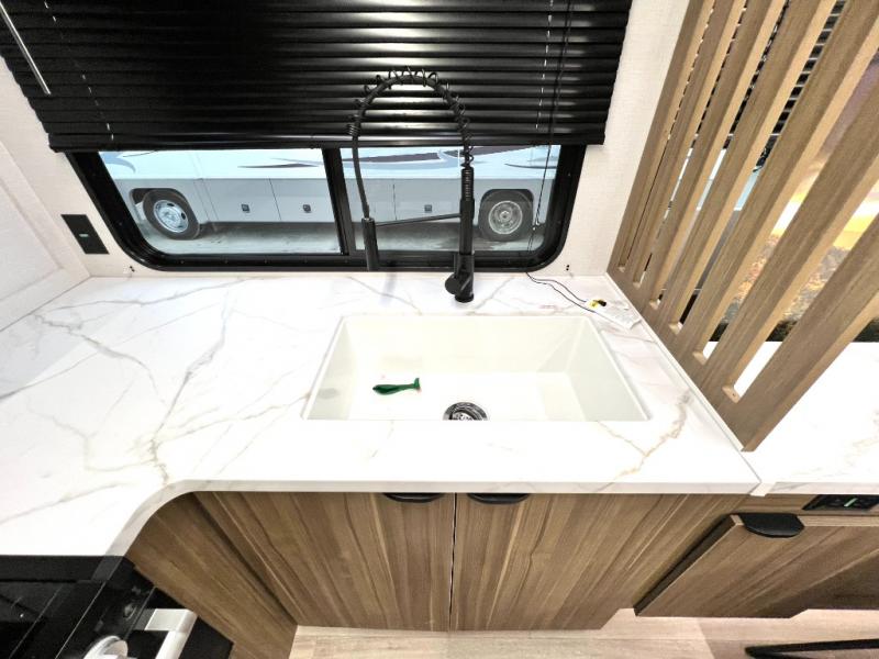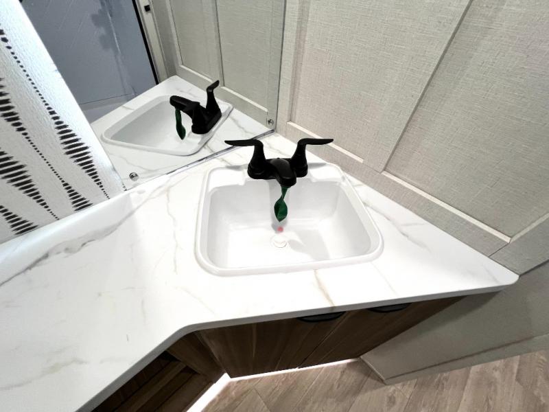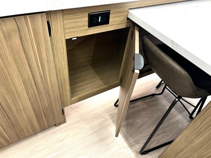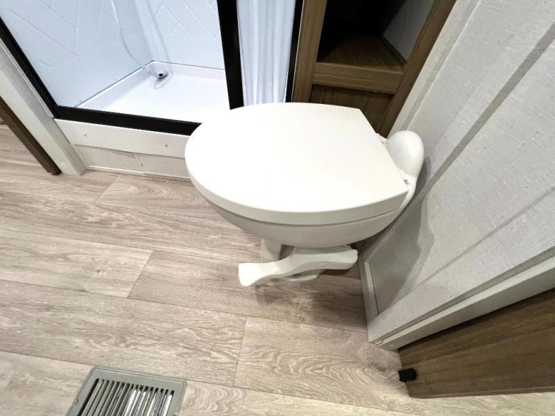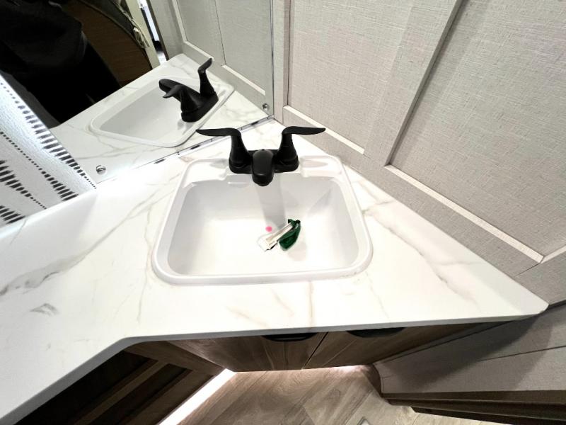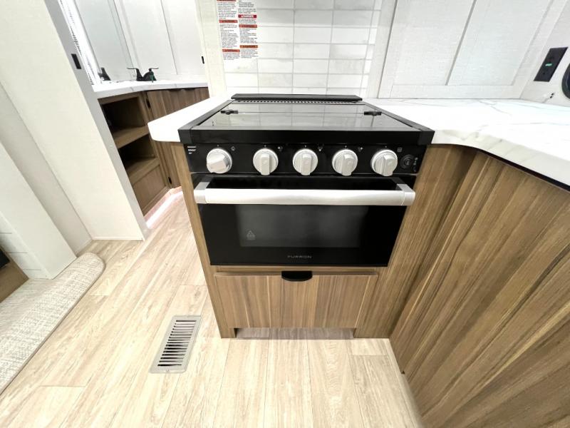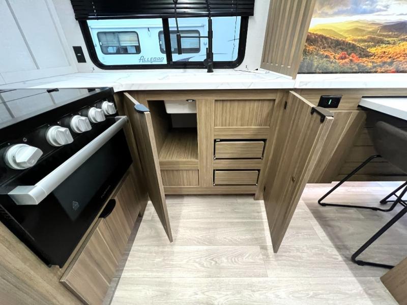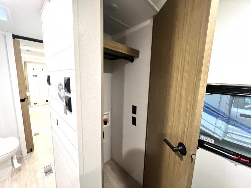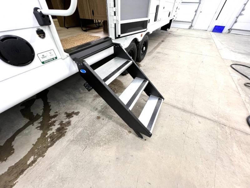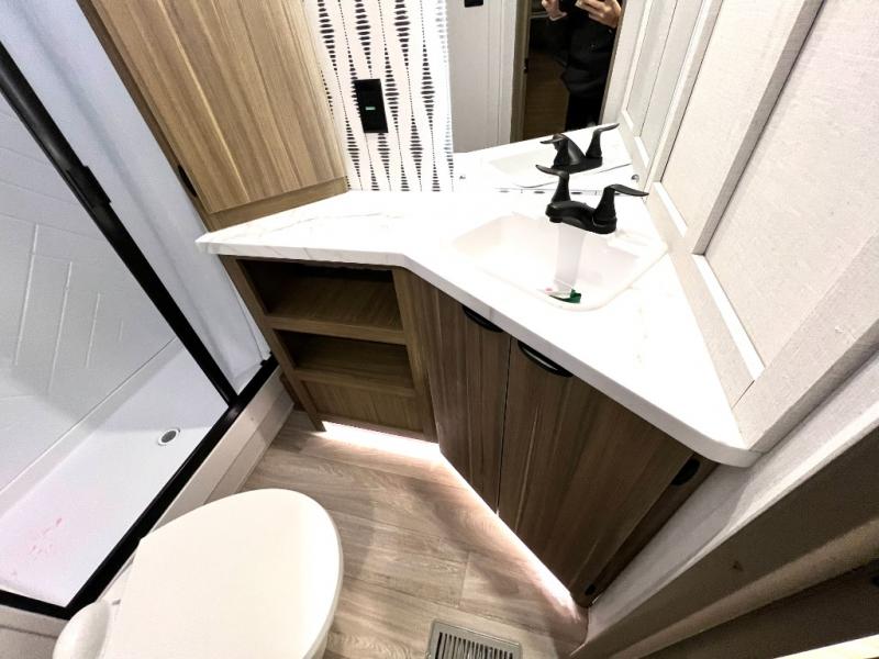 Everyone will love camping in this spacious travel trailer with double-size bunks and a large slide out for more space. You'll have the custom king bed with Versa Tilt all to yourselves, and the walk-thru bath will be easily accessible for everyone. In the combined kitchen and living room, a sofa slide sits across from the fireplace/entertainment center, and there is a pull-out table here so you can dine together.