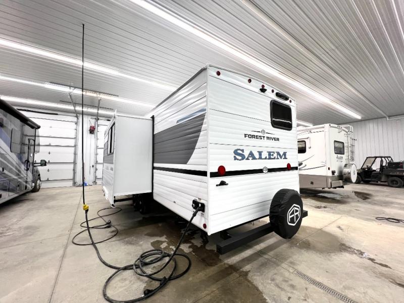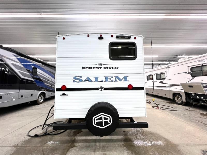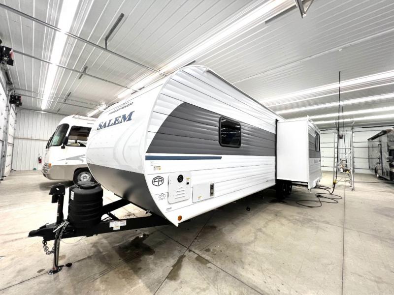The Salem travel trailers are packed with hassle-free camping amenities and there are a variety of floorplans to choose from. The heated and enclosed Accessibelly will help protect against the elements and debris during transport, and the exterior retro/metal redesign is sure to be eye-catching! There are stylish roller shades inside, along with updated backsplash, elegant curtain rods and curtains, plus many more interior comforts! Choose a Salem travel trailer today for quality and value!