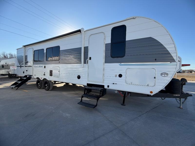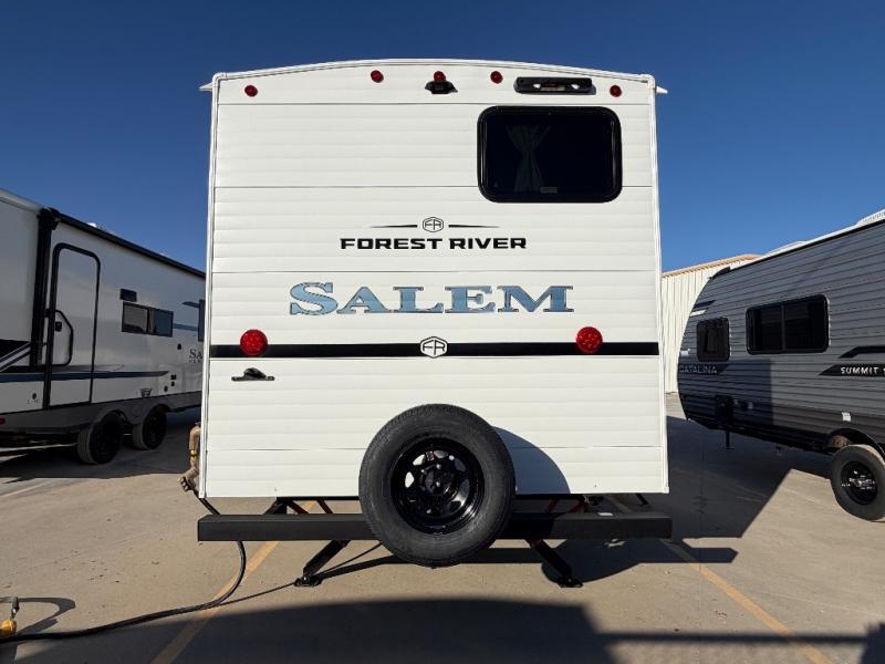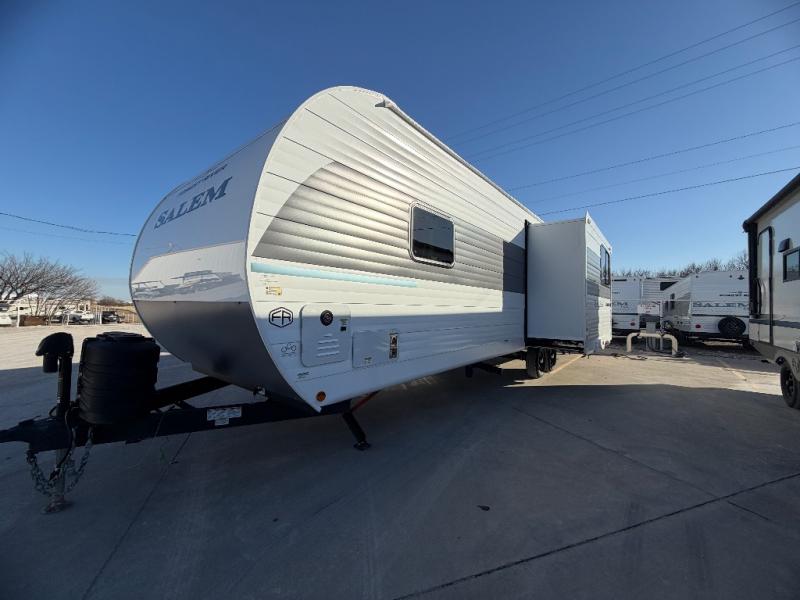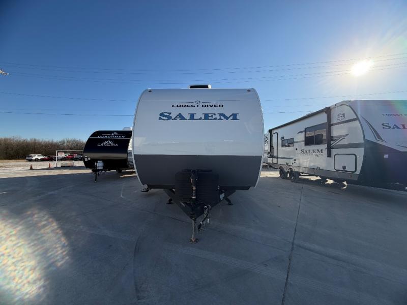 The Salem travel trailers are packed with hassle-free camping amenities and there are a variety of floorplans to choose from. The heated and enclosed Accessibelly will help protect against the elements and debris during transport, and the exterior retro/metal redesign is sure to be eye-catching! There are stylish roller shades inside, along with updated backsplash, elegant curtain rods and curtains, plus many more interior comforts! Choose a Salem travel trailer today for quality and value!