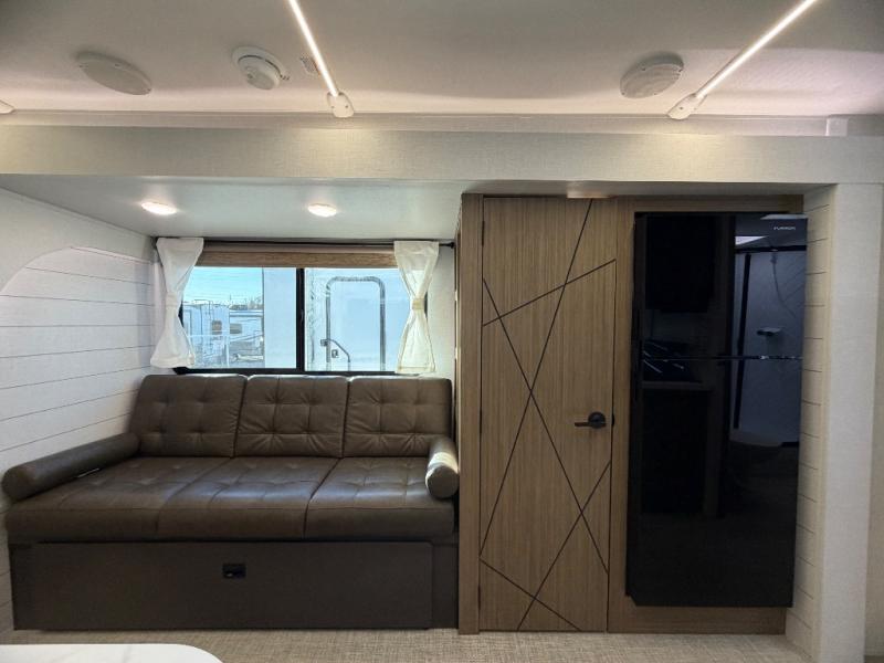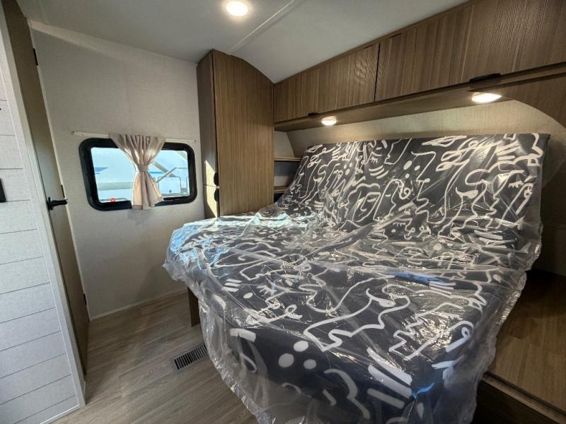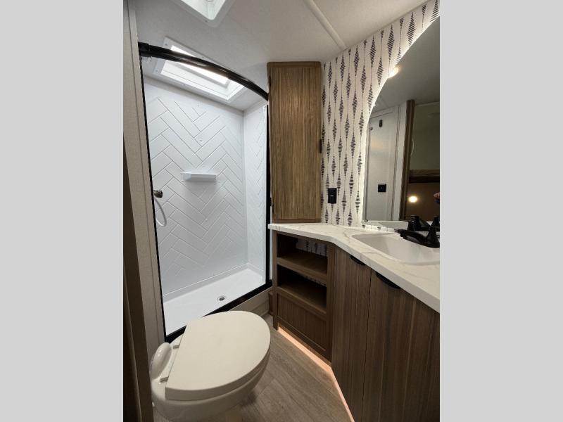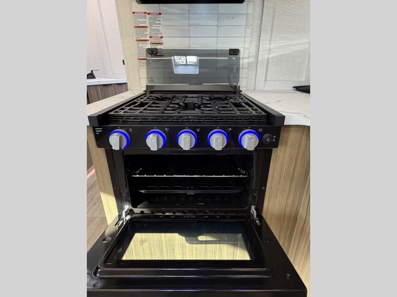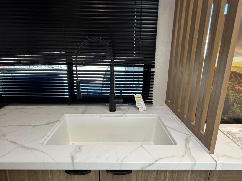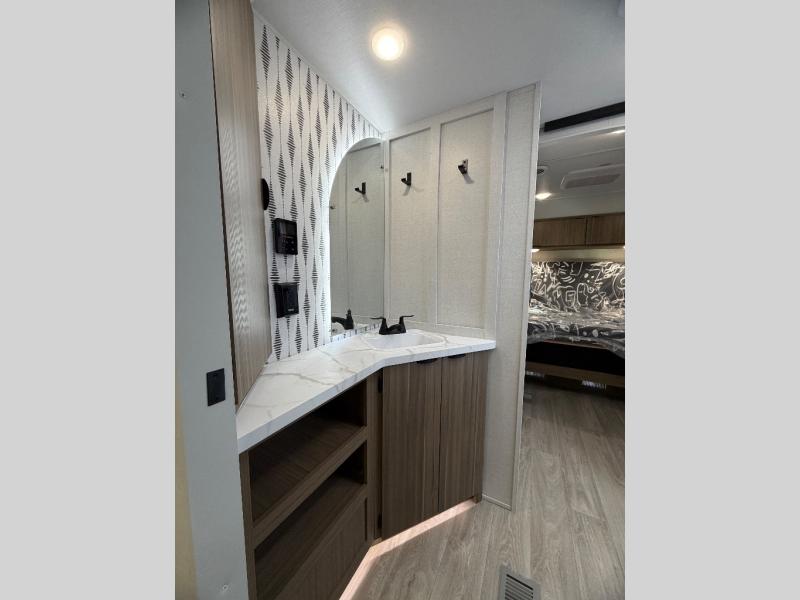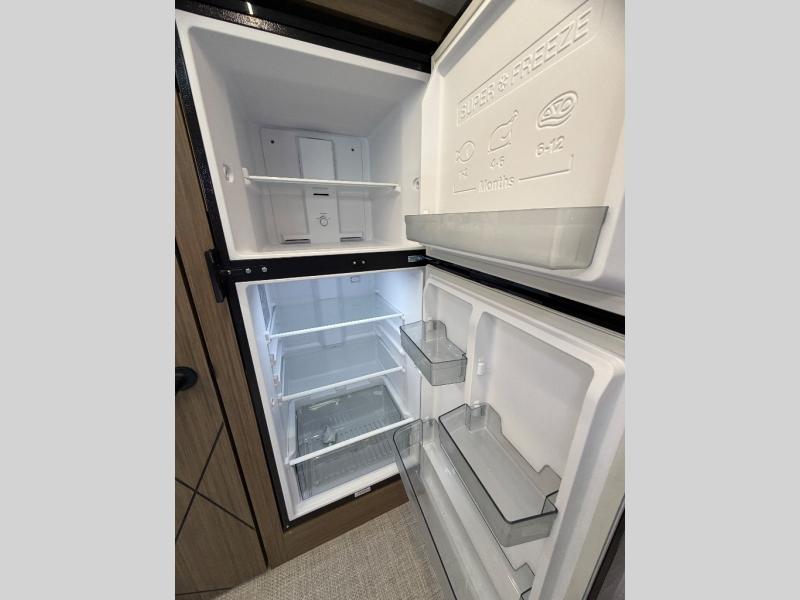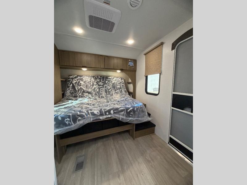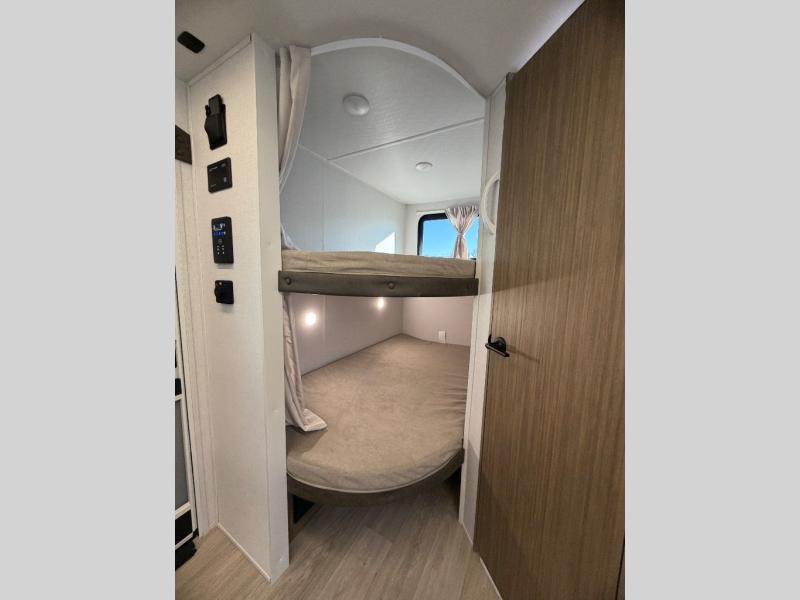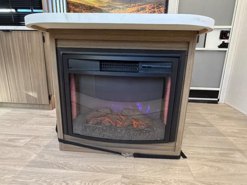 Everyone will love camping in this spacious travel trailer with double-size bunks and a large slide out for more space. You'll have the custom king bed with Versa Tilt all to yourselves, and the walk-thru bath will be easily accessible for everyone. In the combined kitchen and living room, a sofa slide sits across from the fireplace/entertainment center, and there is a pull-out table here so you can dine together.