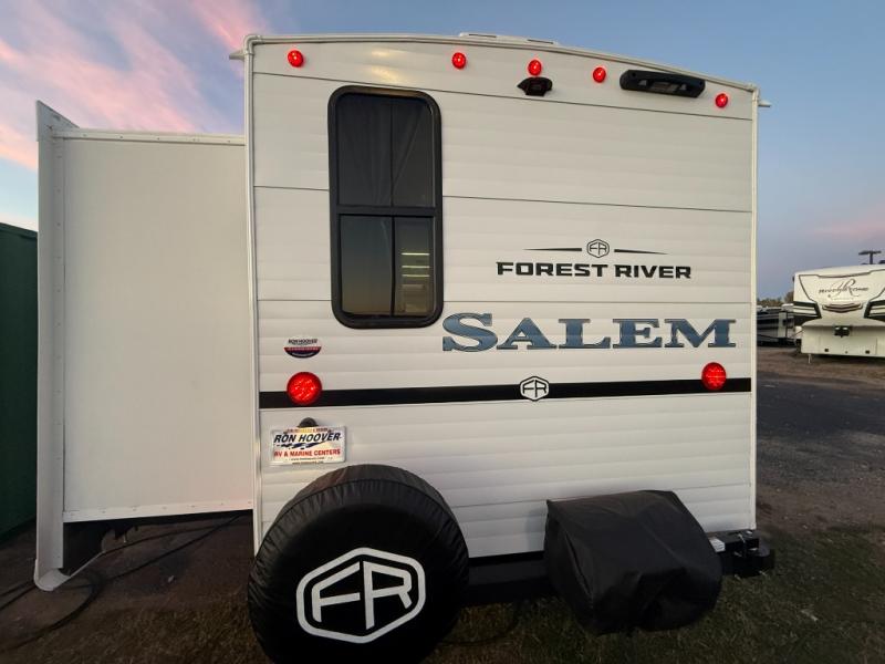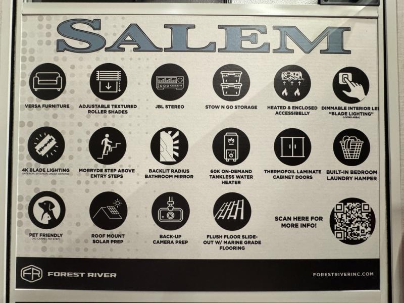 The Salem travel trailers are packed with hassle-free camping amenities! There are a variety of floorplans to choose from between three different regions. The heated and enclosed Accessibelly will help protect against the elements and debris during transport, and the exterior retro/metal redesign is sure to be eye-catching! There are stylish roller shades inside, along with updated backsplash, elegant curtain rods and curtains, plus many more interior comforts! Choose a Salem travel trailer today for quality and value!