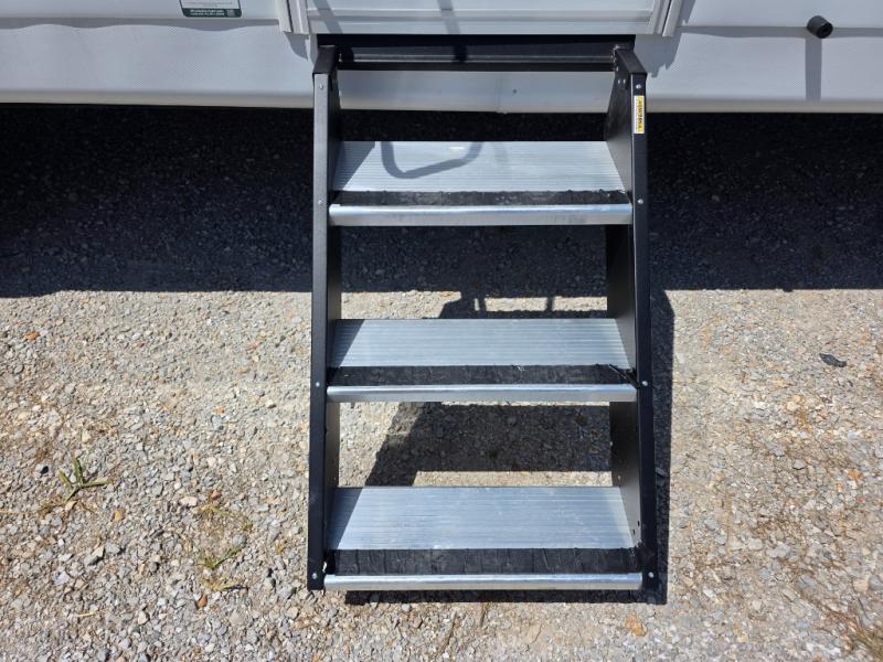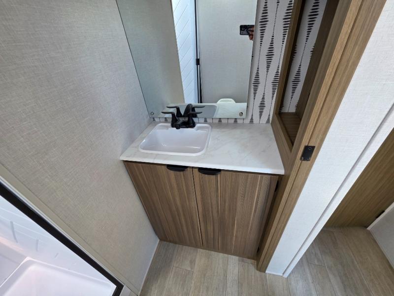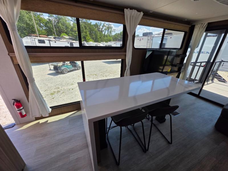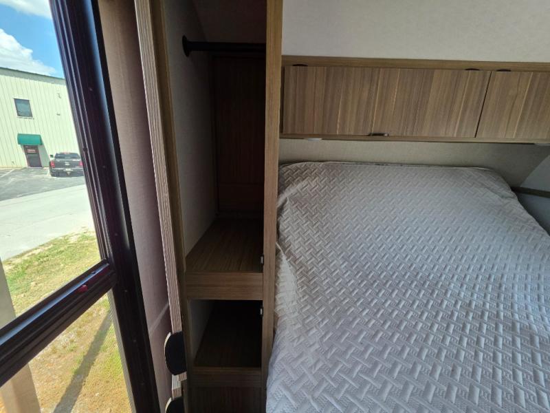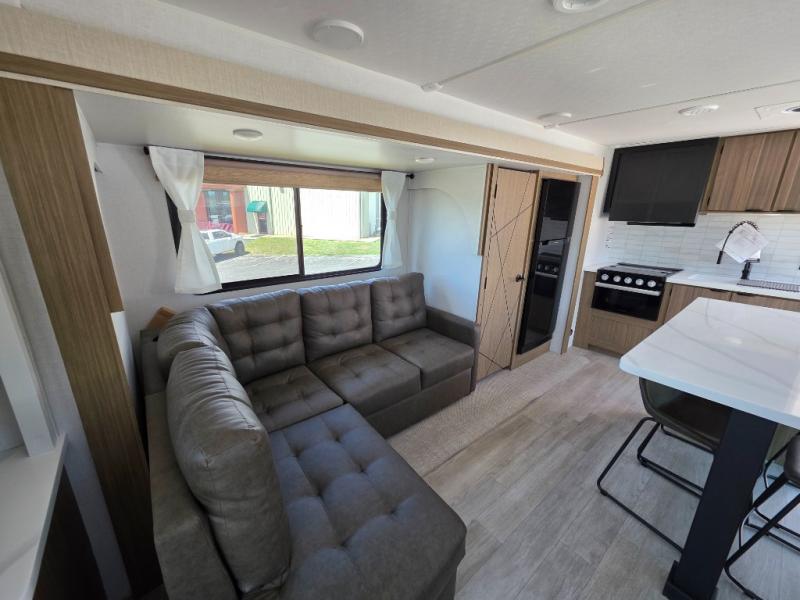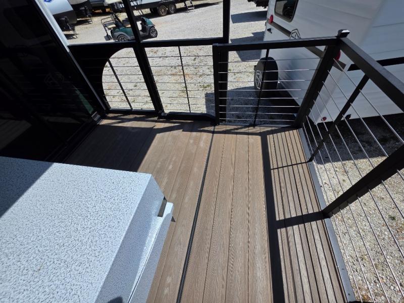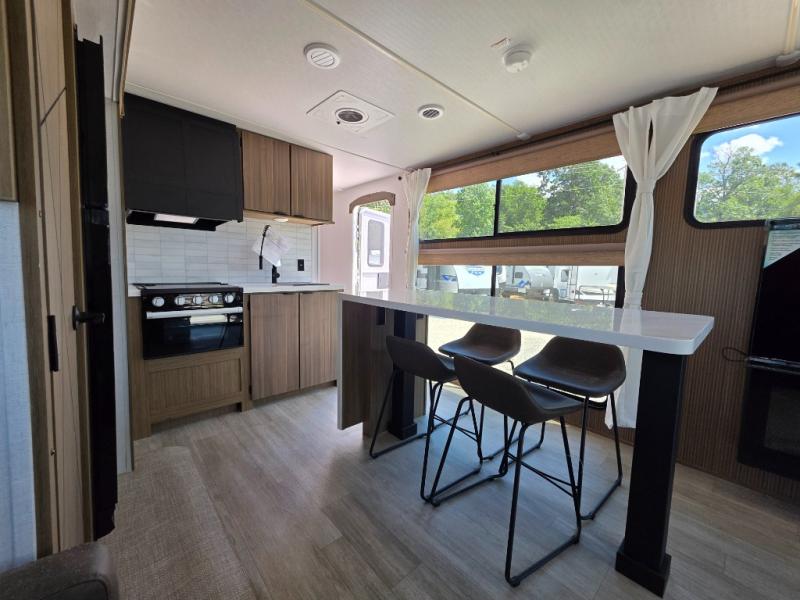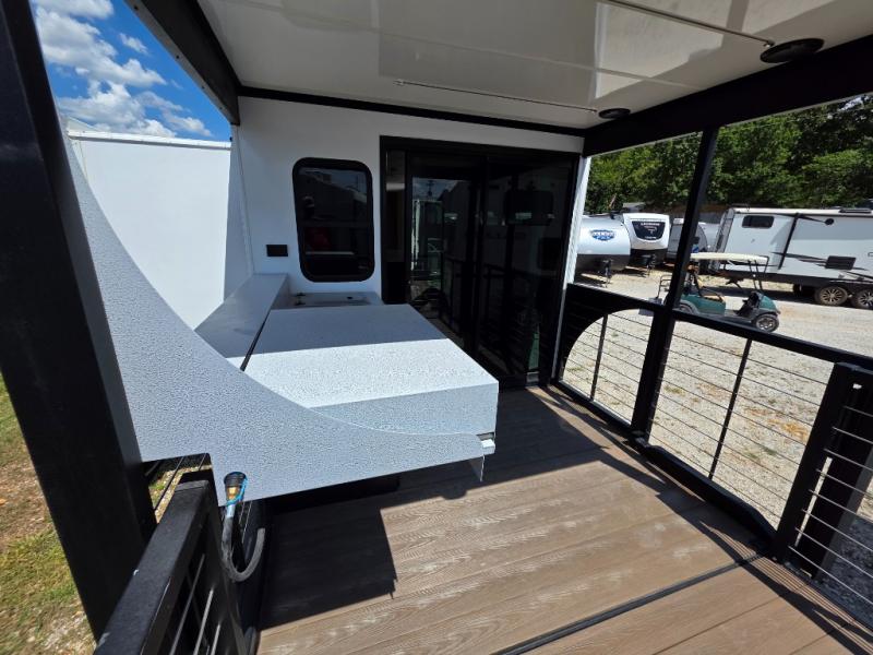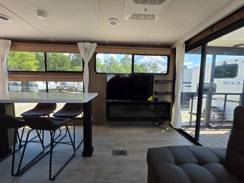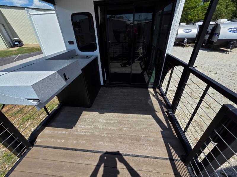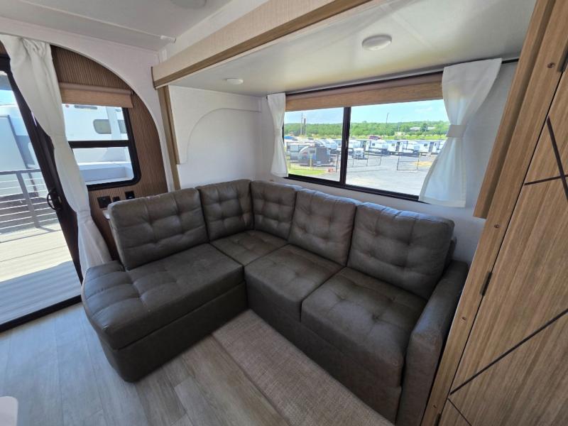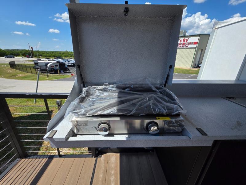This travel trailer will feel more like home with its rear veranda/porch, dual entry doors, and front private bedroom! There is an outdoor kitchen on the back porch so you can make lunch in the fresh air, and the patio doors lead right into the main living area. Your crew can relax on the L-shaped sofa across from the fireplace, which will make your space more cozy. A kitchen island with four chairs will provide a place to dine at, and there is a spacious pantry and refrigerator for food storage. You will love having your own space in the private bedroom, and the Versa-Tilt custom king bed will let you sit up in bed to read your book at night.
