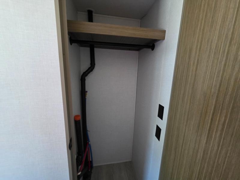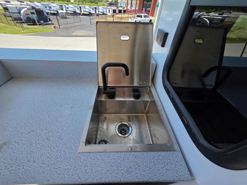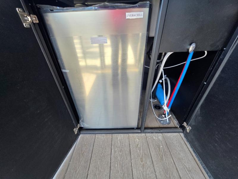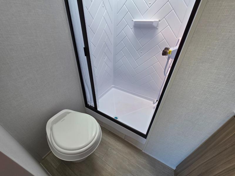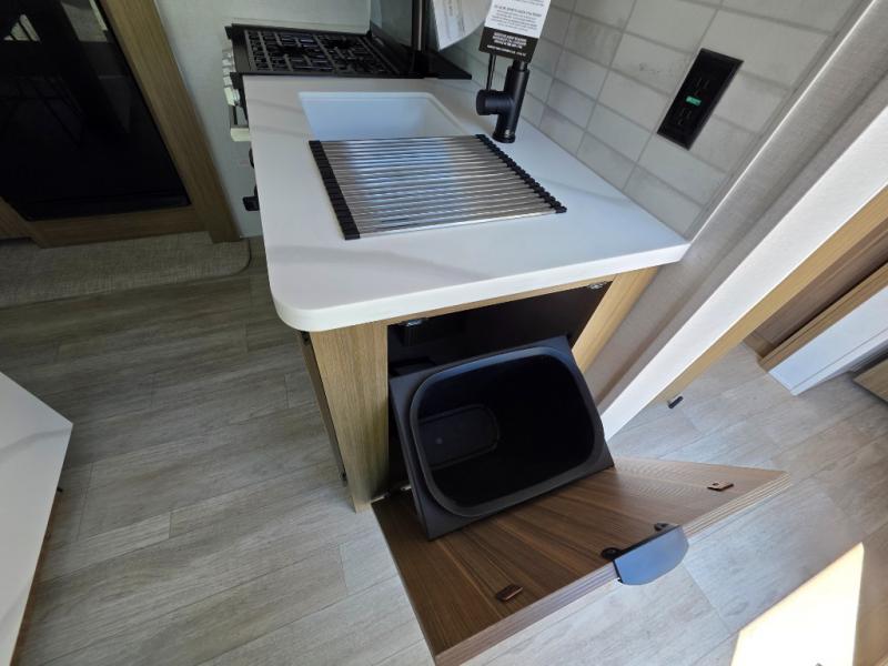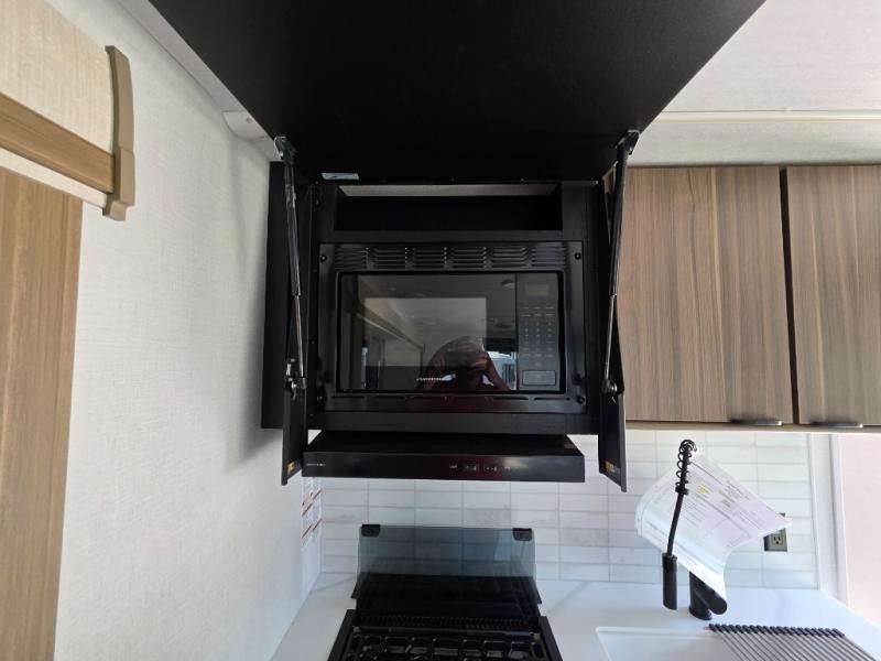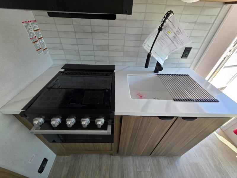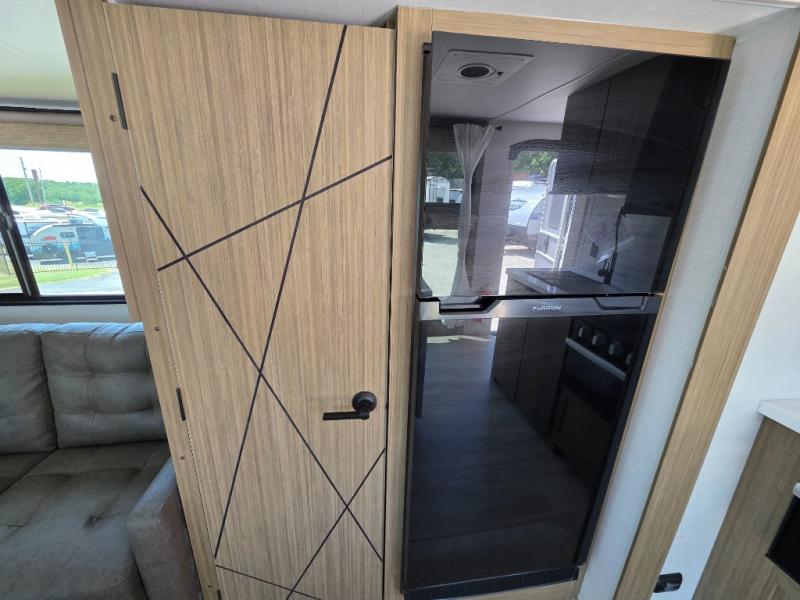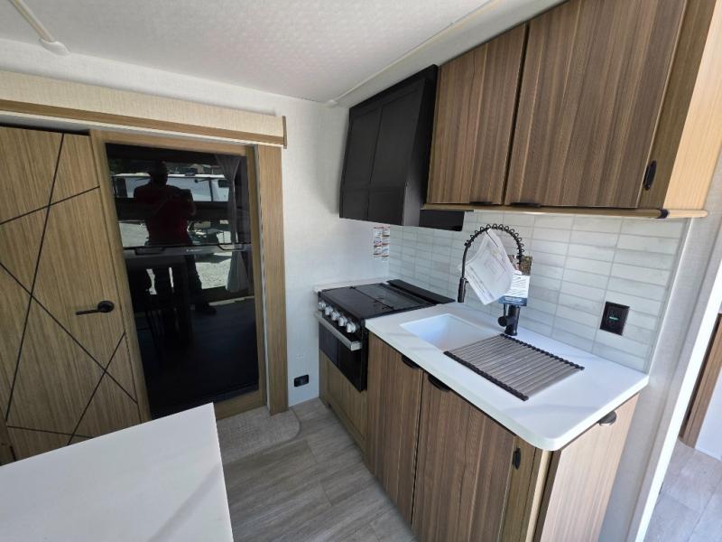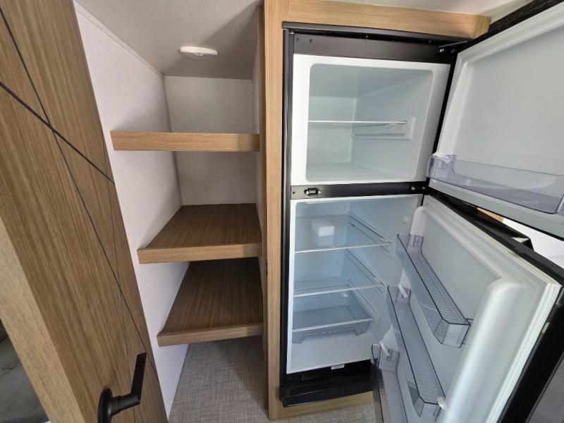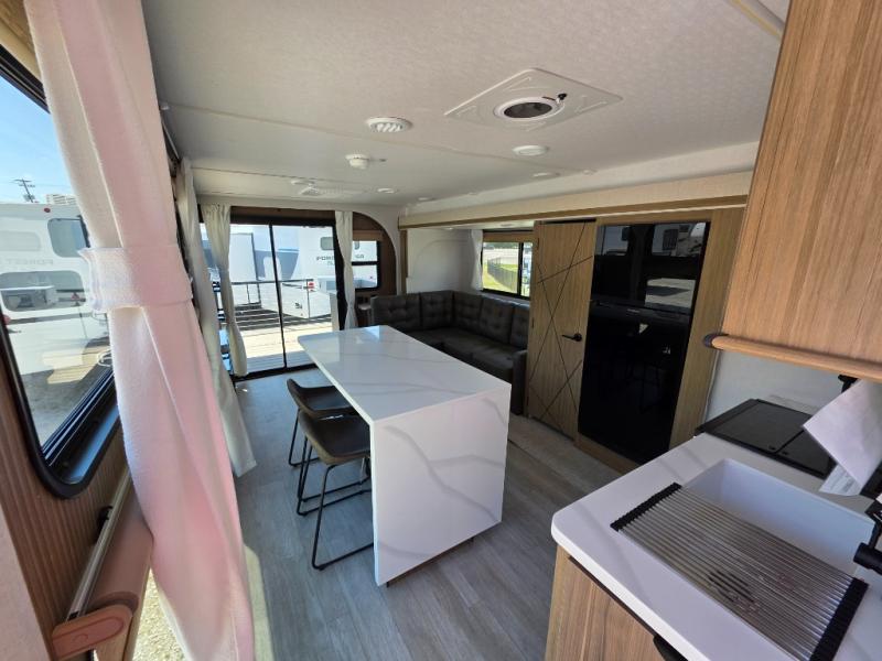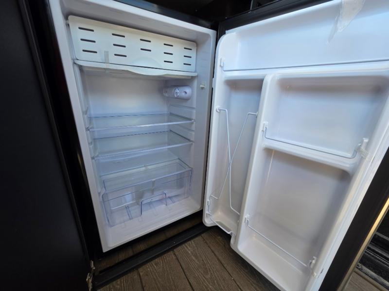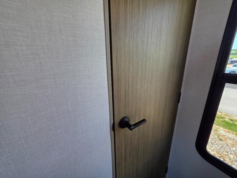 This travel trailer will feel more like home with its rear veranda/porch, dual entry doors, and front private bedroom! There is an outdoor kitchen on the back porch so you can make lunch in the fresh air, and the patio doors lead right into the main living area. Your crew can relax on the L-shaped sofa across from the fireplace, which will make your space more cozy. A kitchen island with four chairs will provide a place to dine at, and there is a spacious pantry and refrigerator for food storage. You will love having your own space in the private bedroom, and the Versa-Tilt custom king bed will let you sit up in bed to read your book at night.