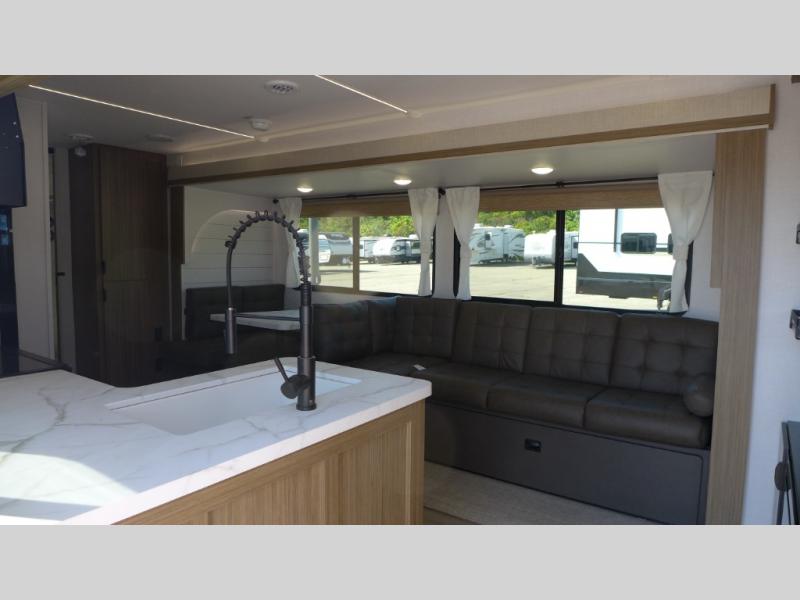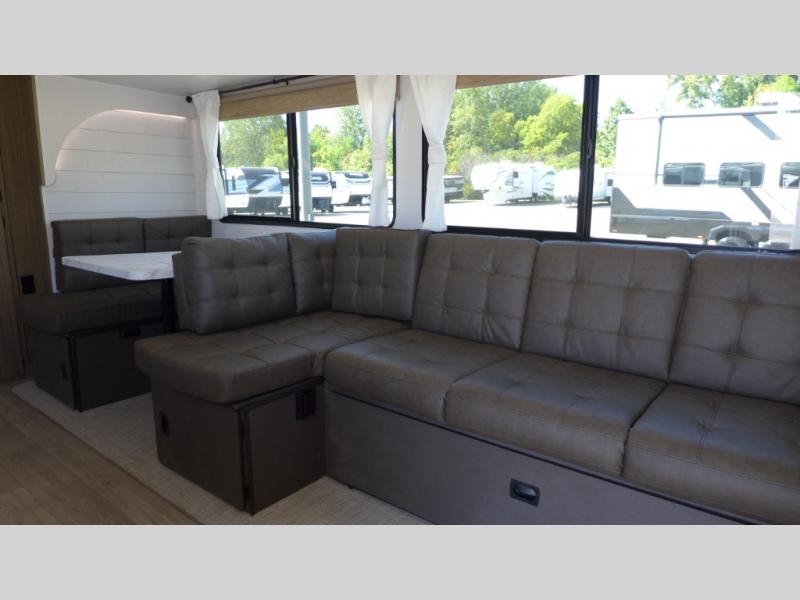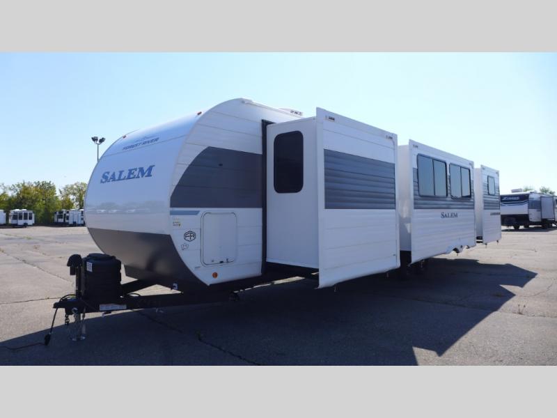 Do you need a break from the mundane camping life? If so, it's time to check out this exciting and full-featured Salem travel trailer! This unit provides two separated sleeping spaces; a rear private bunkhouse and a front private bedroom. Another feature that is just as helpful as the one in your own home is the kitchen. With an oversized refrigerator, cooktop, double sink, and abundant cabinet storage, you will be able to create delicious meals for the entire family. Plus, if you prefer to have a sunrise breakfast, you can simply take your preparations outside to the outdoor kitchen!