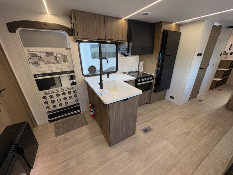 Do you need a break from the mundane camping life? If so, it's time to check out this exciting and full-featured Salem travel trailer! This unit provides two separated sleeping spaces; a rear private bunkhouse and a front private bedroom. Another feature that is just as helpful as the one in your own home is the kitchen. With an oversized refrigerator, cooktop, double sink, and abundant cabinet storage, you will be able to create delicious meals for the entire family. Plus, if you prefer to have a sunrise breakfast, you can simply take your preparations outside to the outdoor kitchen!