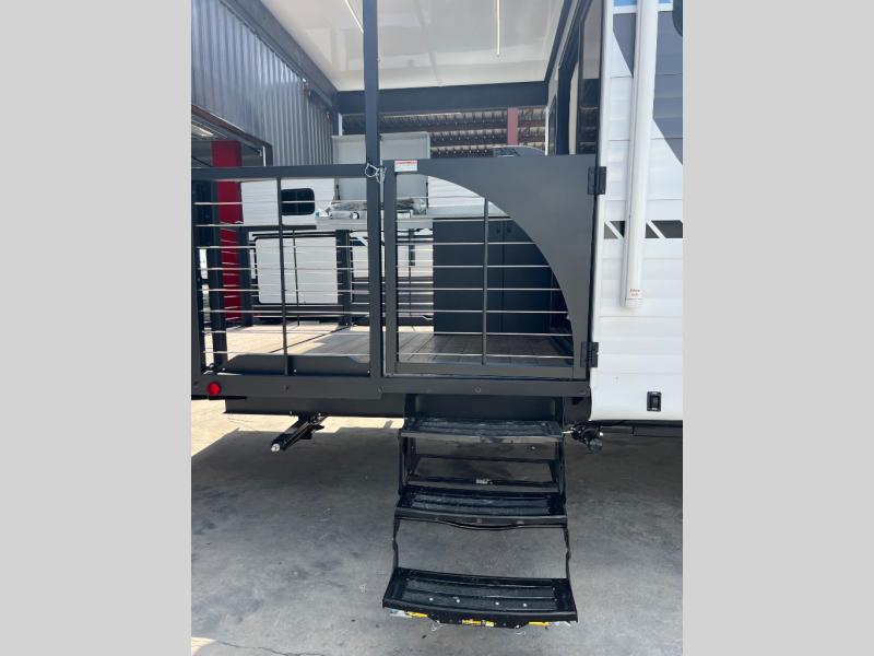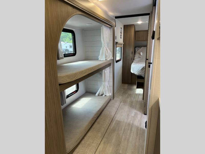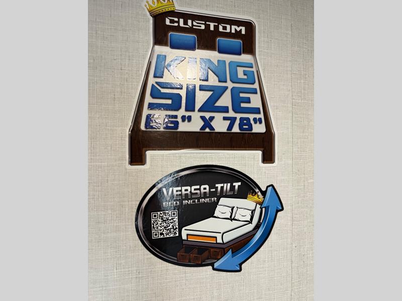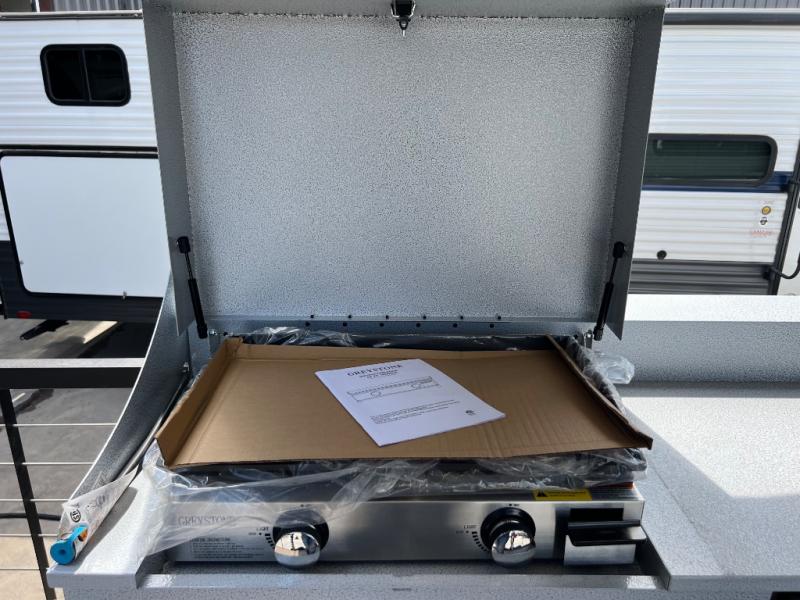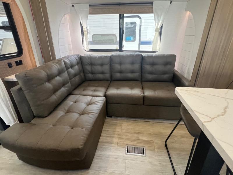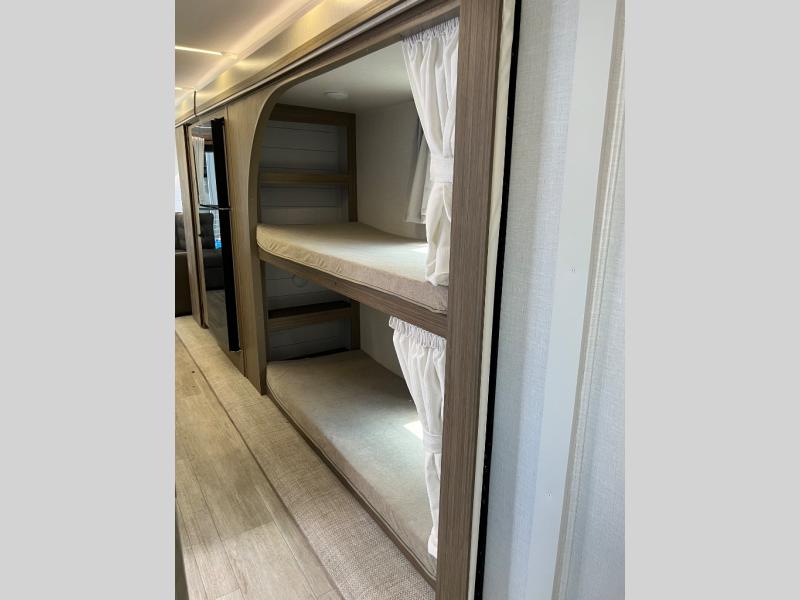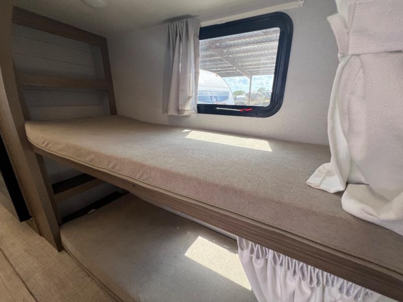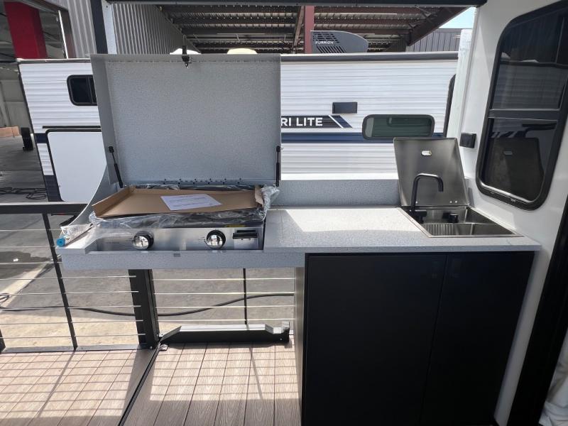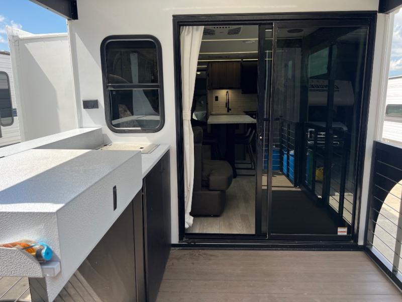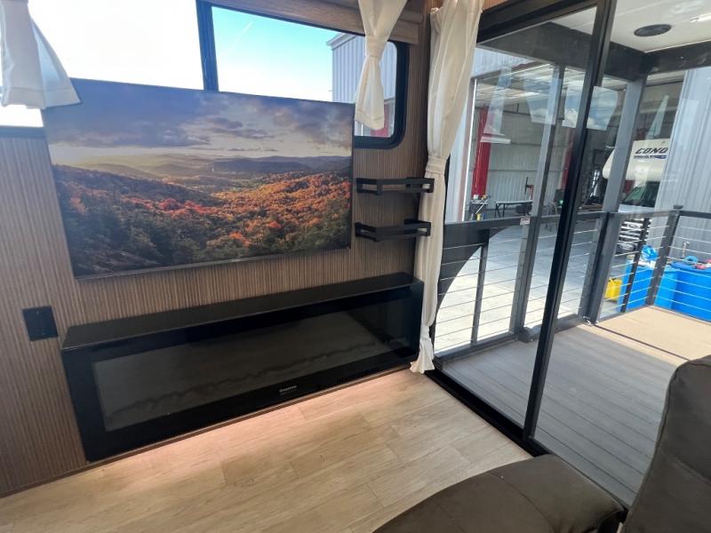 This travel trailer will feel more like home with its rear veranda/porch, dual entry doors, and front private bedroom! There is an outdoor kitchen on the back porch so you can make lunch in the fresh air, and the patio doors lead right into the main living area. Your crew can relax on the L-shaped sofa across from the fireplace, which will make your space more cozy. You will love having your own space in the private bedroom, and the Versa-Tilt custom king bed will let you sit up in bed to read your book at night, while your guests take the bunk beds within the large slide out!