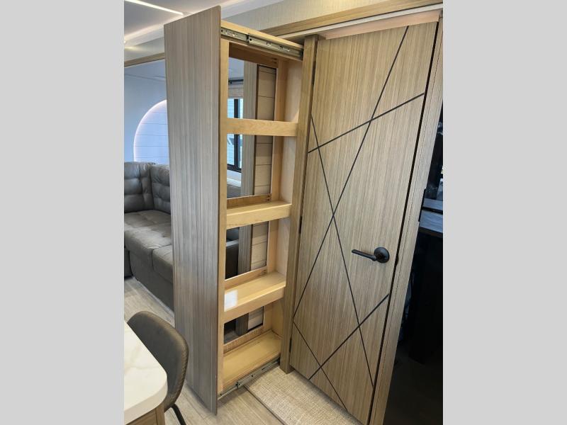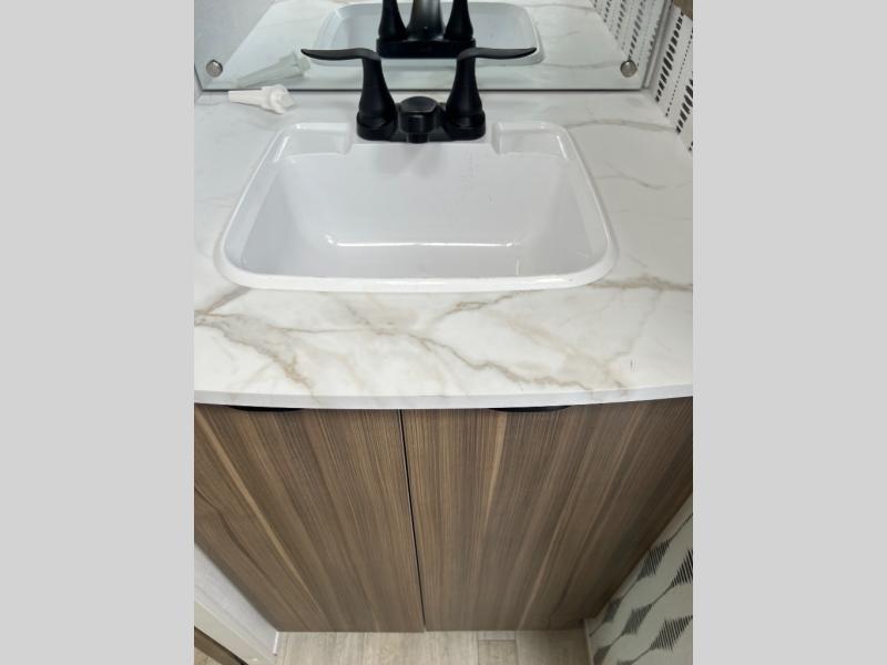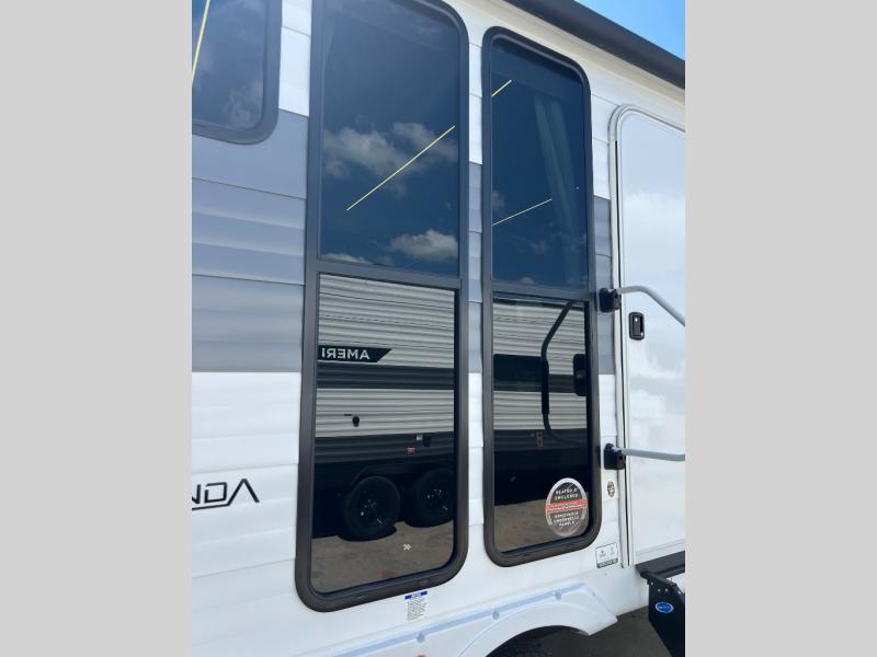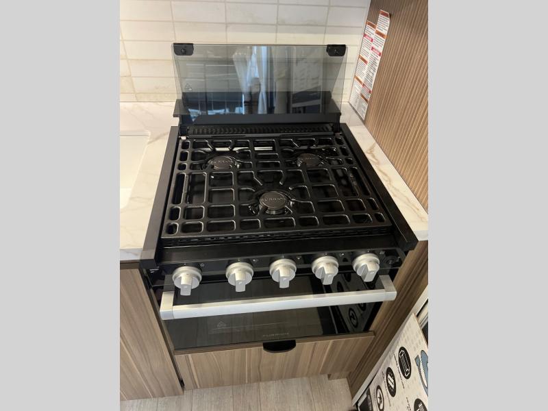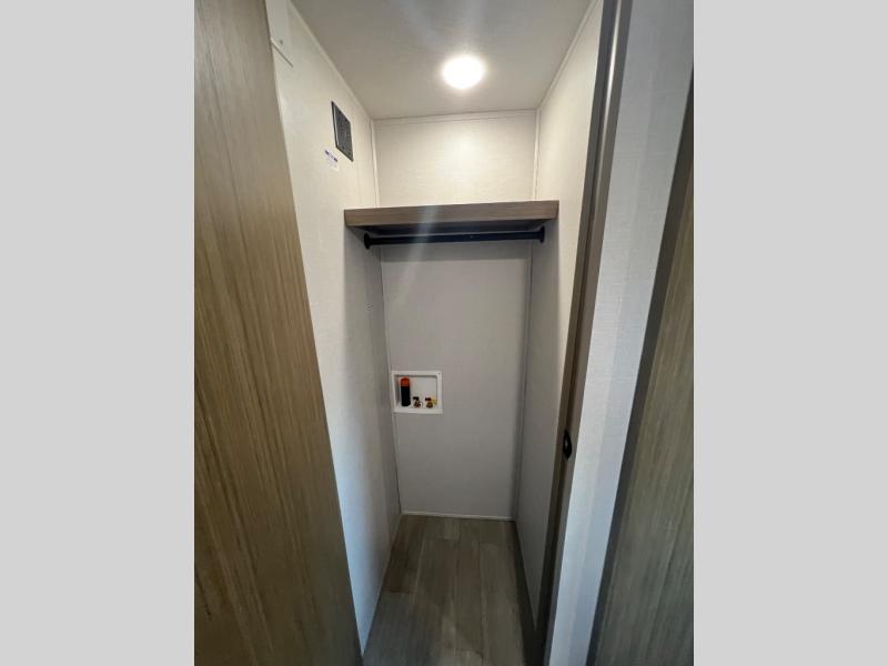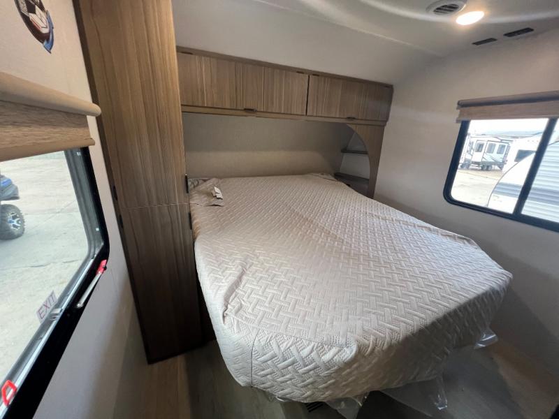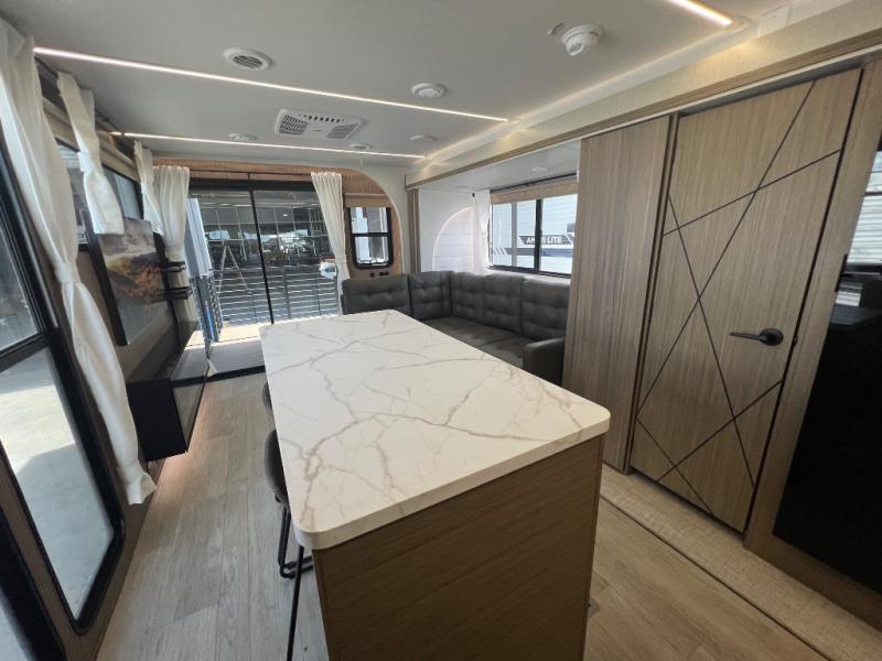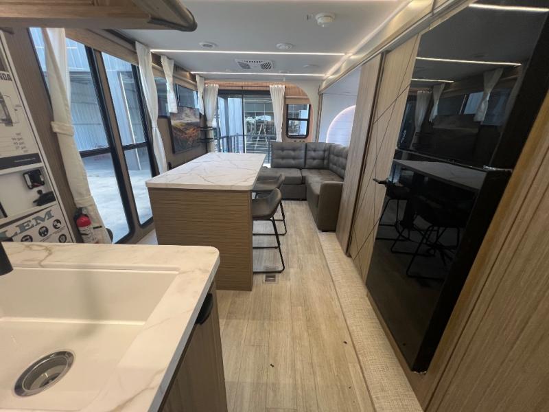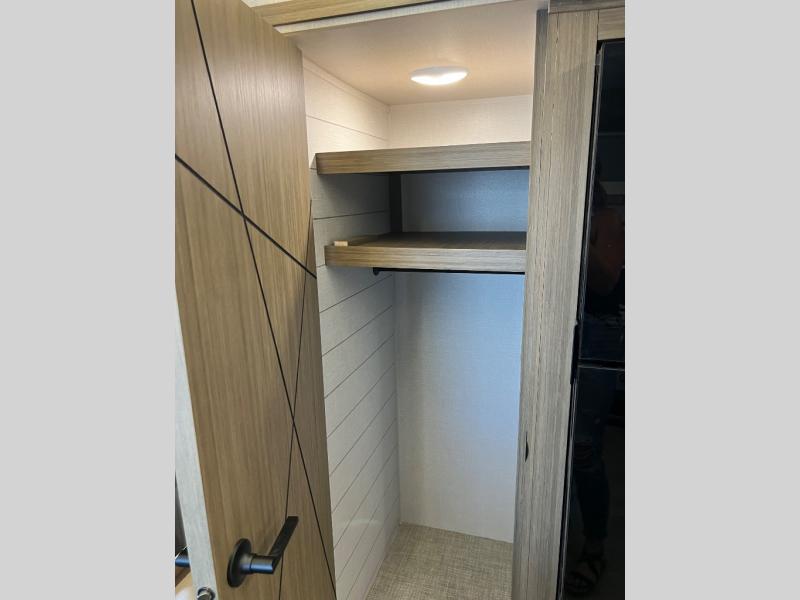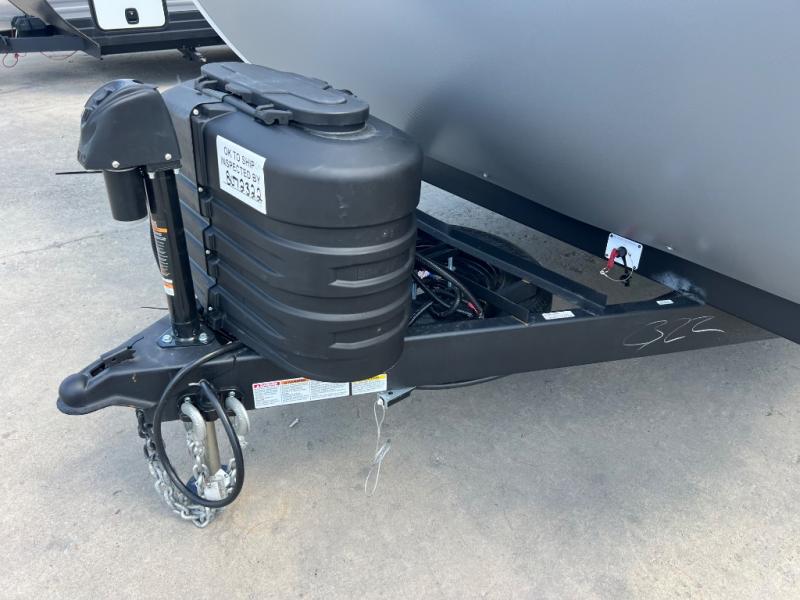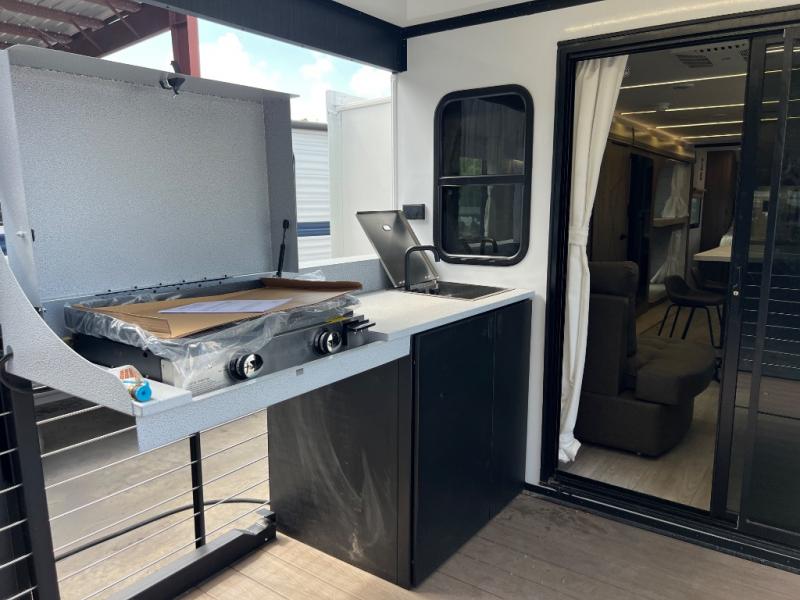 This travel trailer will feel more like home with its rear veranda/porch, dual entry doors, and front private bedroom! There is an outdoor kitchen on the back porch so you can make lunch in the fresh air, and the patio doors lead right into the main living area. Your crew can relax on the L-shaped sofa across from the fireplace, which will make your space more cozy. You will love having your own space in the private bedroom, and the Versa-Tilt custom king bed will let you sit up in bed to read your book at night, while your guests take the bunk beds within the large slide out!