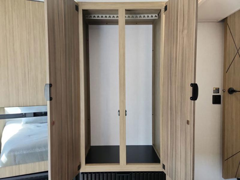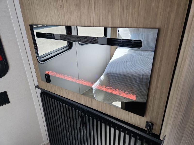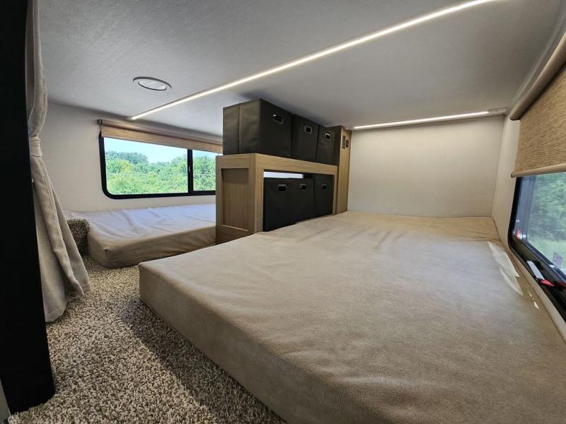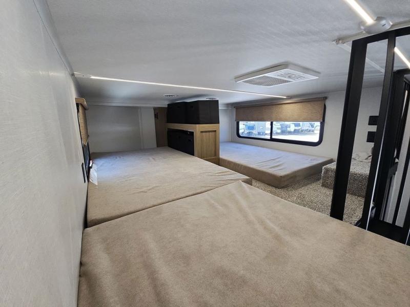 This trailer is built with comfort and convenience in mind, offering plenty of sleeping space for the whole gang. It has two spacious lofts, each equipped with two 42" x 72" bunk mats, plus an extra 36" x 38" bunk mat, providing cozy sleeping spots for everyone. Each loft also includes built-in storage for essentials, and instead of climbing a ladder, easy stair access makes getting in and out much safer. On the main floor, you’ll find a full rear bathroom with a walk-in shower and washer/dryer prep. The main living area has a large sectional sofa, perfect for gathering the group to watch the TV on the Televator or relaxing by the fireplace after a day outdoors. The kitchen is equipped with all the essentials, including a large pantry, overhead cabinets for snack storage, a fridge, and a kitchen island that adds prep space. Up front, the private bedroom has a king bed with Versa Tilt, a dresser, and shelves to keep your clothes and camp gear neatly organized. Regardless that you're adventuring about, this trailer is ready to make every trip feel like home.