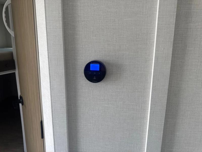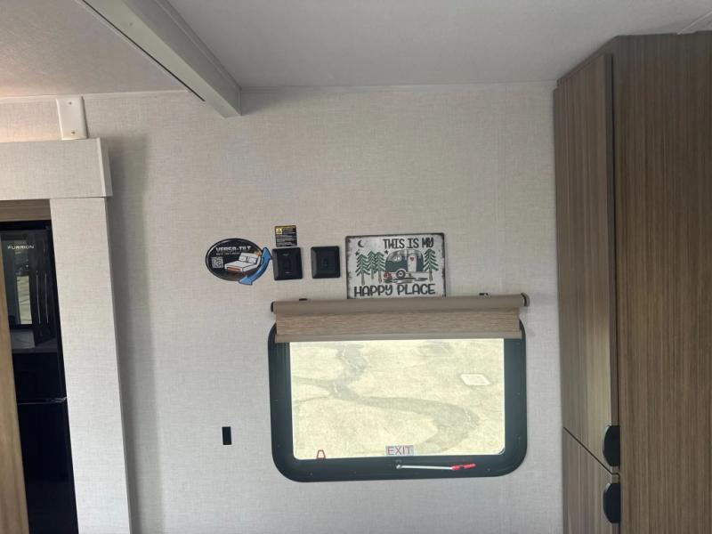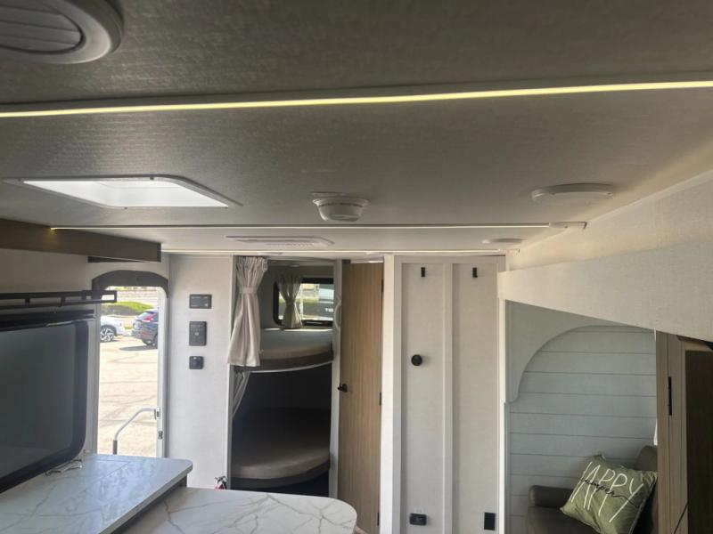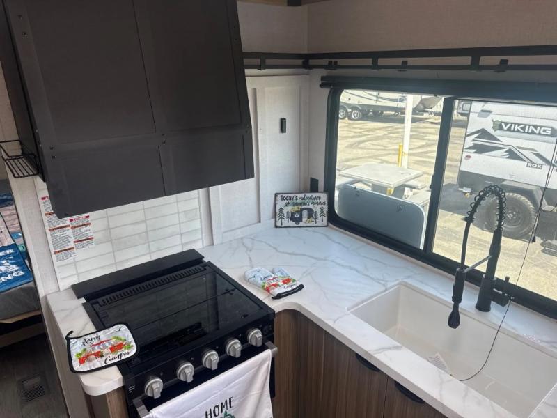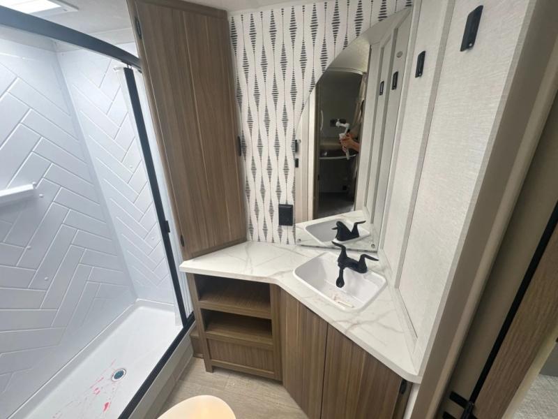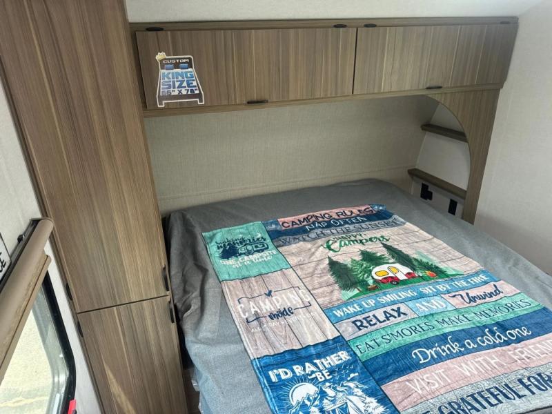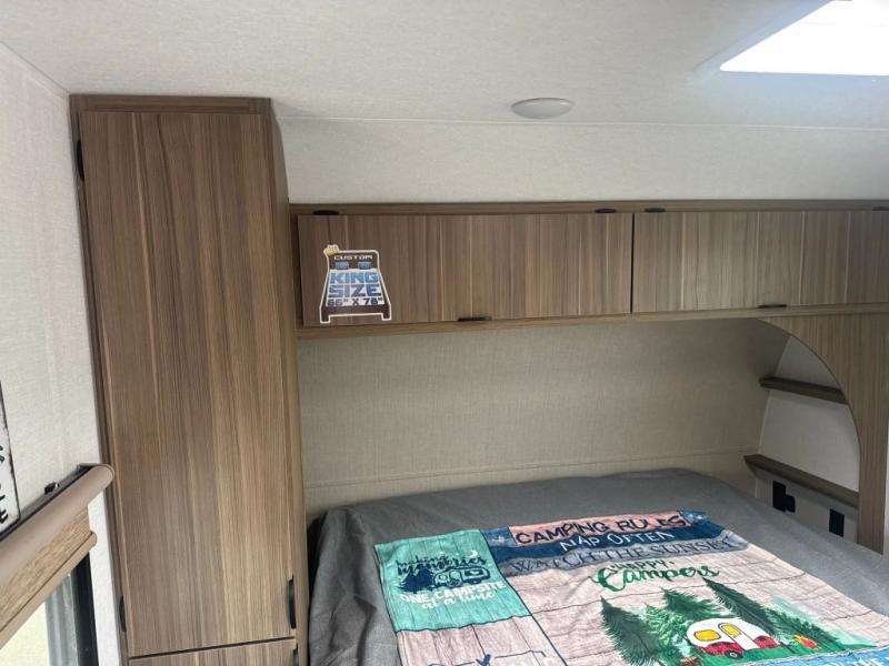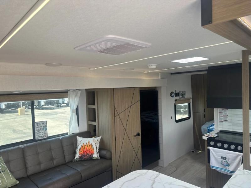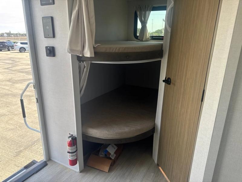 You're sure to make camping memories in this spacious travel trailer! You can easily sleep eight people each night thanks to the double-size bunks, the custom king bed with Versa Tilt in the front bedroom plus the Versa-Lounge within the large slide out! The cooktop and microwave oven will let you make meals each day, and you'll appreciate the hidden pantry with shelves behind the fireplace. There is also a booth dinette where you can dine together or play a game of cards after dinner is cleaned up, or you may just find yourselves outdoors under the 18' awning with 4K blade lighting. And don't overlook the full bath, complete with a tub/shower that will make bath time easier if you have little ones.