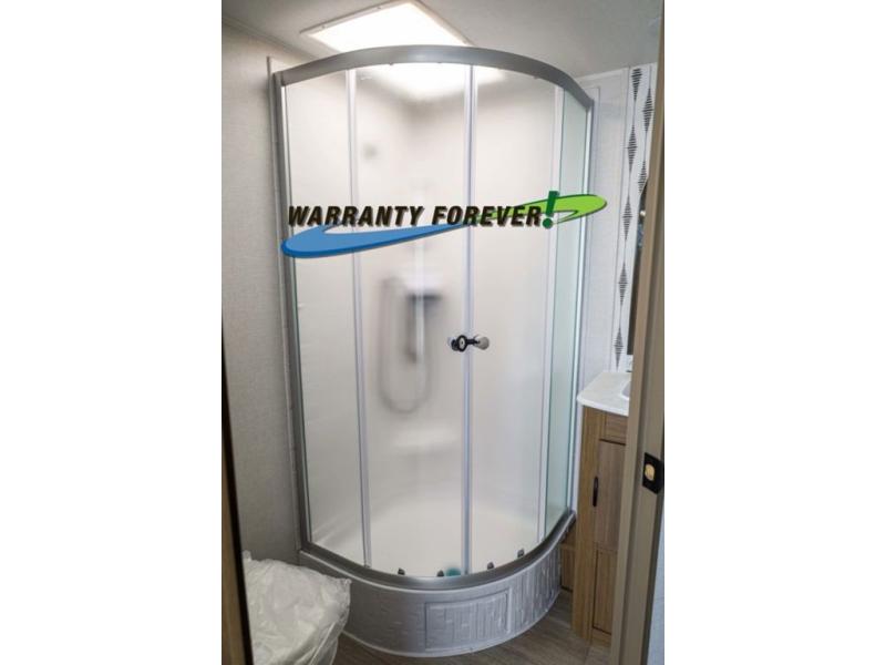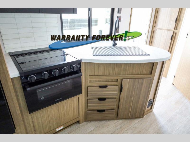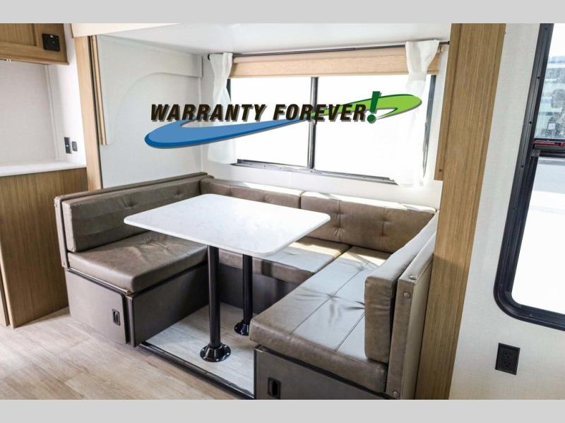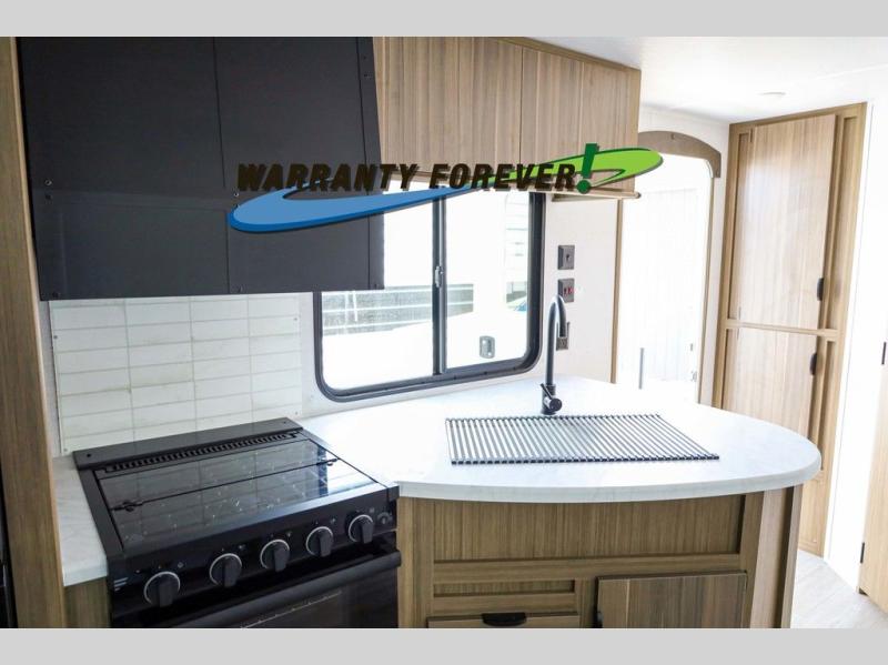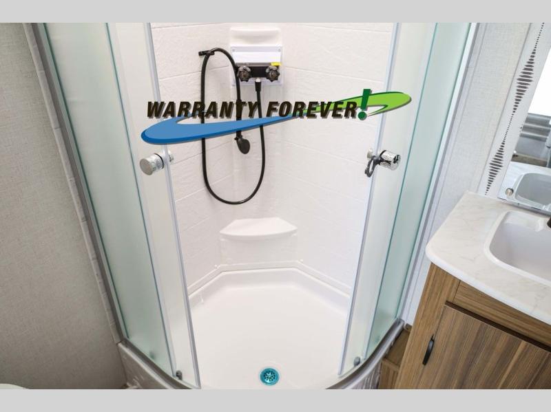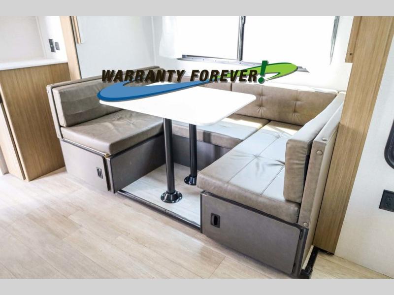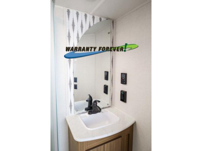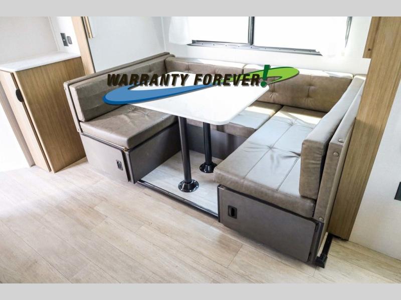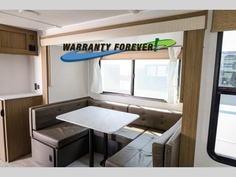 Pick your favorite campsite and load up this travel trailer for a fun weekend getaway! There is a wardrobe/pantry big enough to store your favorite snacks and a cooktop for you to create delicious home cooked meals. The U-shaped dinette slide is not only great for enjoying your meals at or playing card games, but also for transforming into an extra sleeping space. The rear corner bathroom has everything you will need to end each night feeling squeaky clean including a radius glass shower. The front custom king bed with Versa-Tilt welcomes you to enjoy a good night's rest, and the closets on either side of the bed will keep your clothes wrinkle-free!