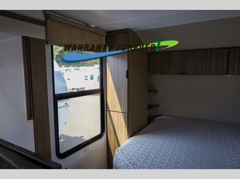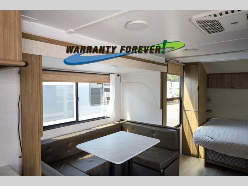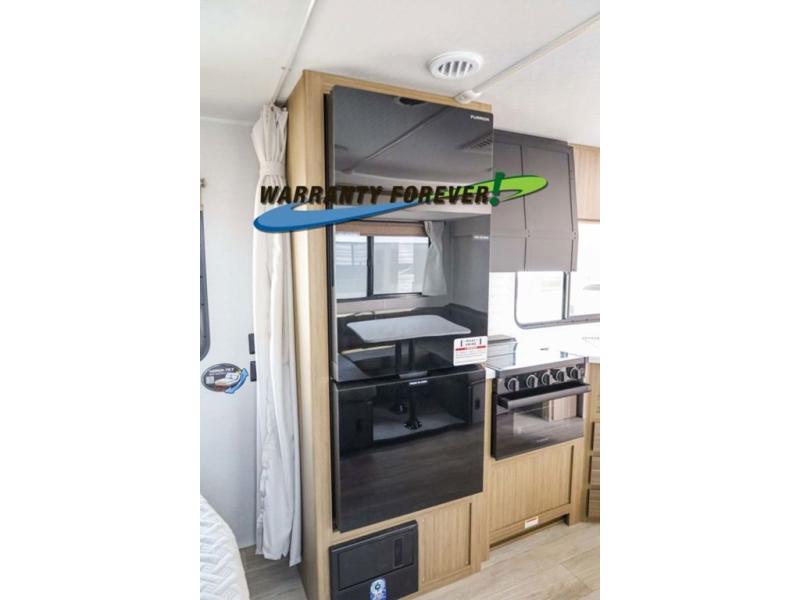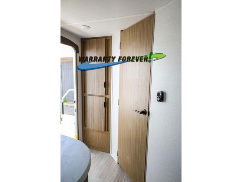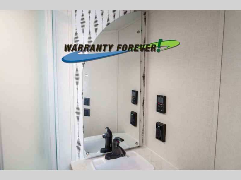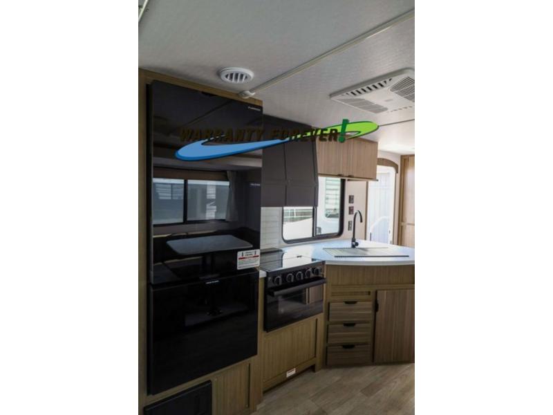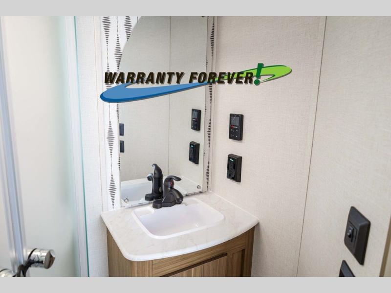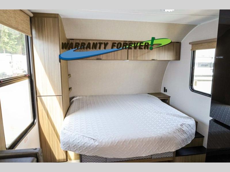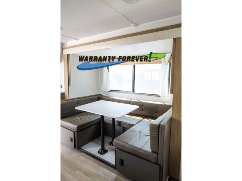 Pick your favorite campsite and load up this travel trailer for a fun weekend getaway! There is a wardrobe/pantry big enough to store your favorite snacks and a cooktop for you to create delicious home cooked meals. The U-shaped dinette slide is not only great for enjoying your meals at or playing card games, but also for transforming into an extra sleeping space. The rear corner bathroom has everything you will need to end each night feeling squeaky clean including a radius glass shower. The front custom king bed with Versa-Tilt welcomes you to enjoy a good night's rest, and the closets on either side of the bed will keep your clothes wrinkle-free!