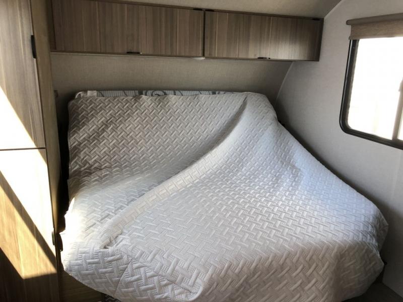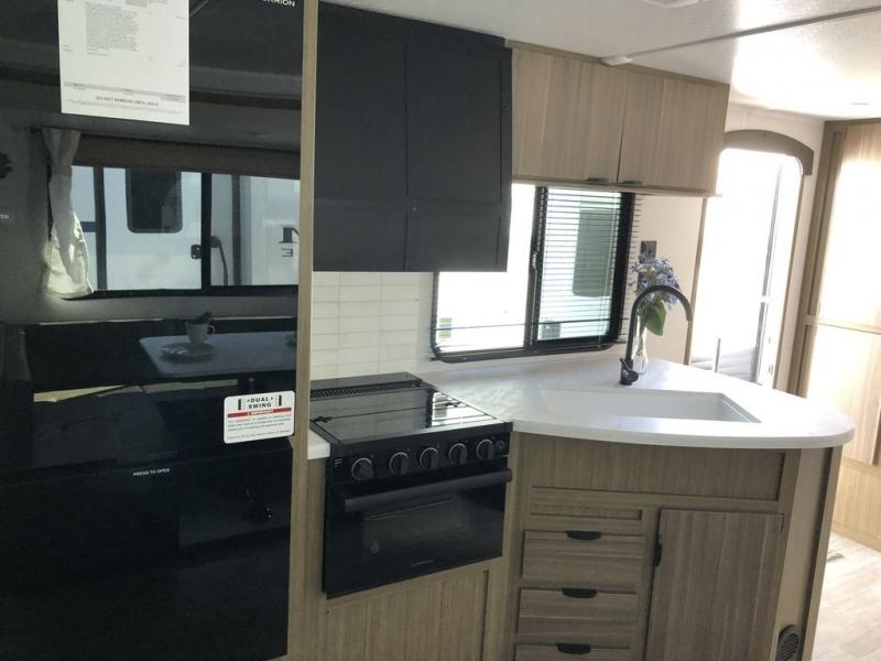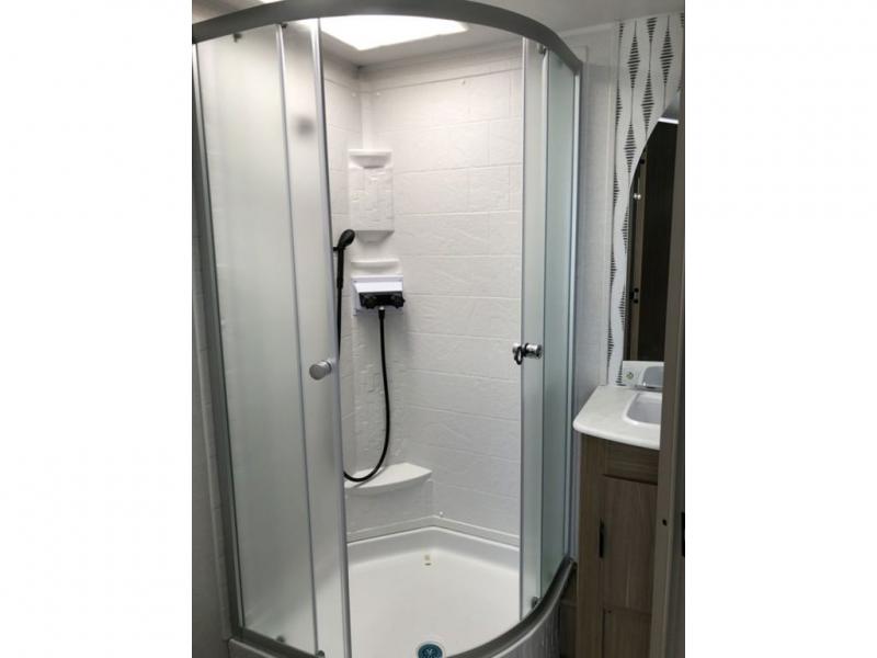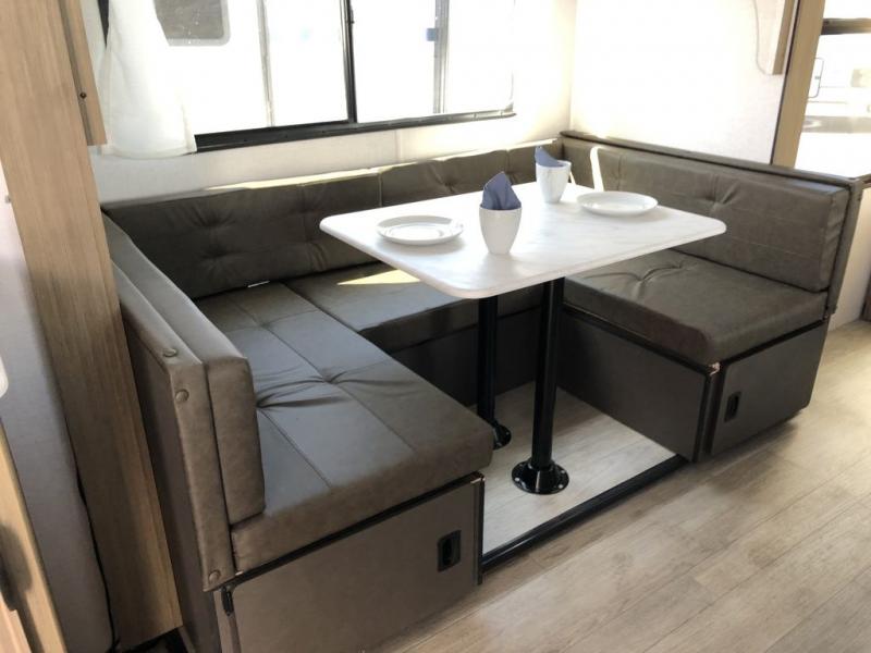Pick your favorite campsite and load up this travel trailer for a fun weekend getaway! There is a wardrobe/pantry big enough to store your favorite snacks and a cooktop for you to create delicious home cooked meals. The U-shaped dinette slide is not only great for enjoying your meals at or playing card games, but also for transforming into an extra sleeping space. The rear corner bathroom has everything you will need to end each night feeling squeaky clean including a radius glass shower. The front custom king bed with Versa-Tilt welcomes you to enjoy a good night's rest, and the closets on either side of the bed will keep your clothes wrinkle-free!
