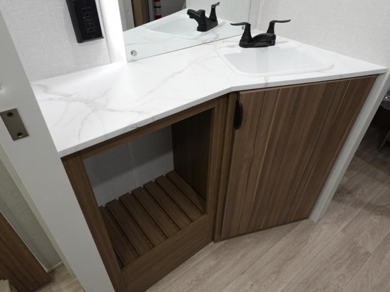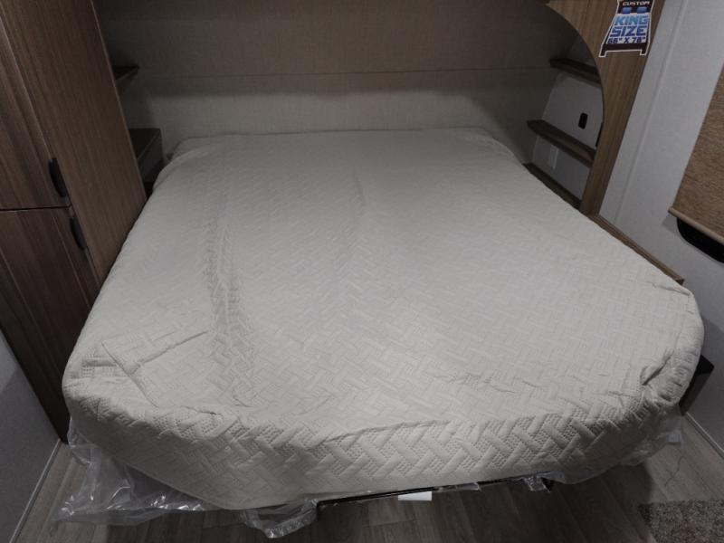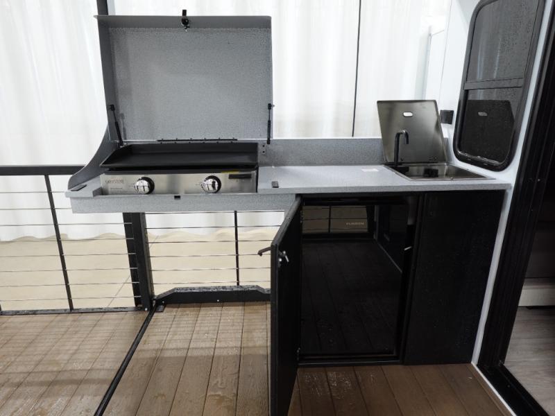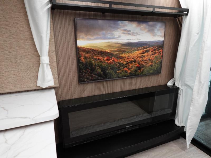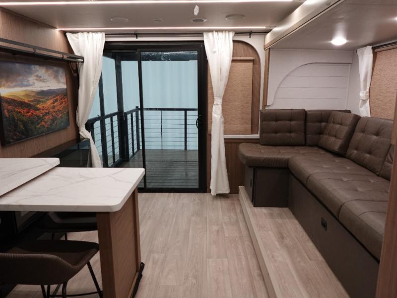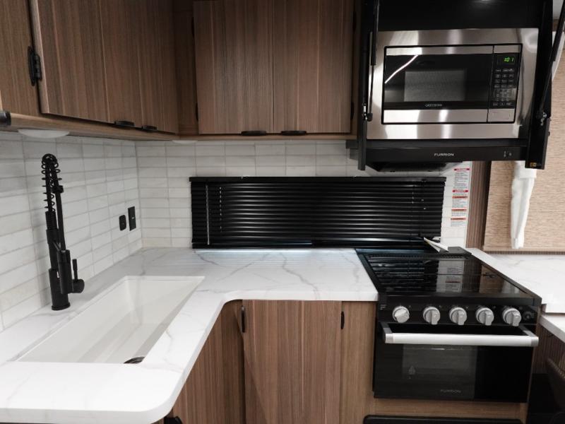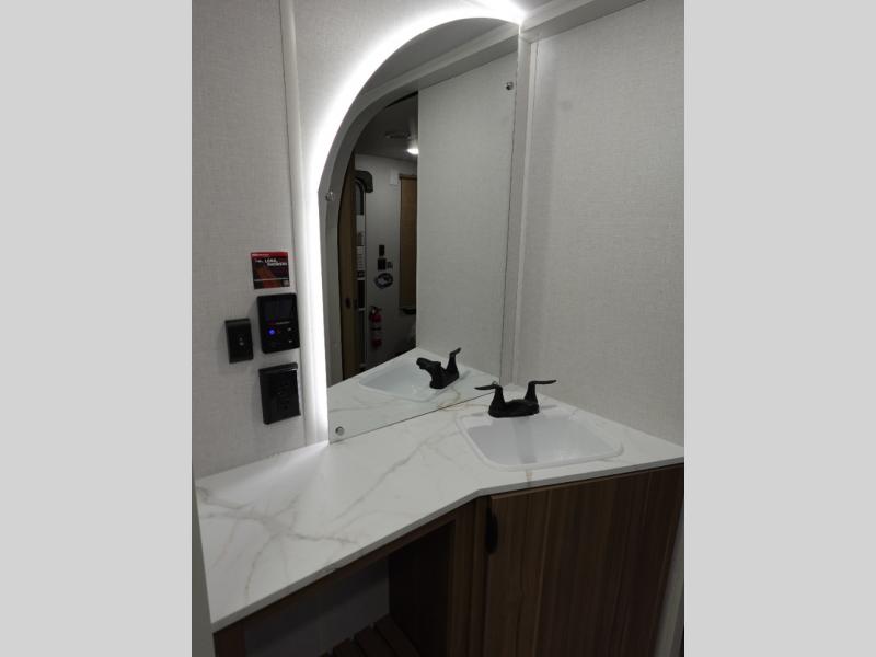 This travel trailer will feel more like home with its rear veranda/porch, dual entry doors, and front master bedroom! There is an outdoor kitchen on the back porch so you can make lunch in the fresh air, and the patio doors lead right into the main living area. Your crew can relax on the L-shaped sofa across from the fireplace, which will make your space more cozy. The U-shaped kitchen counter includes a pull-out table for even more counter space, and the walk-thru bath is easily accessible for everyone to use. You will love having your own space in the master bedroom, and the Versa-Tilt custom king bed will let you sit up in bed to read your book at night. One of the dual entry doors is also found here for added convenience!