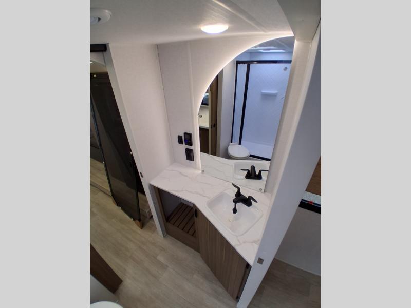 This travel trailer will feel more like home with its rear veranda/porch, dual entry doors, and front master bedroom! There is an outdoor kitchen on the back porch so you can make lunch in the fresh air, and the patio doors lead right into the main living area. Your crew can relax on the L-shaped sofa across from the fireplace, which will make your space more cozy. The U-shaped kitchen counter includes a pull-out table for even more counter space, and the walk-thru bath is easily accessible for everyone to use. You will love having your own space in the master bedroom, and the Versa-Tilt custom king bed will let you sit up in bed to read your book at night. One of the dual entry doors is also found here for added convenience!