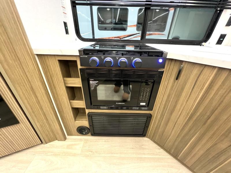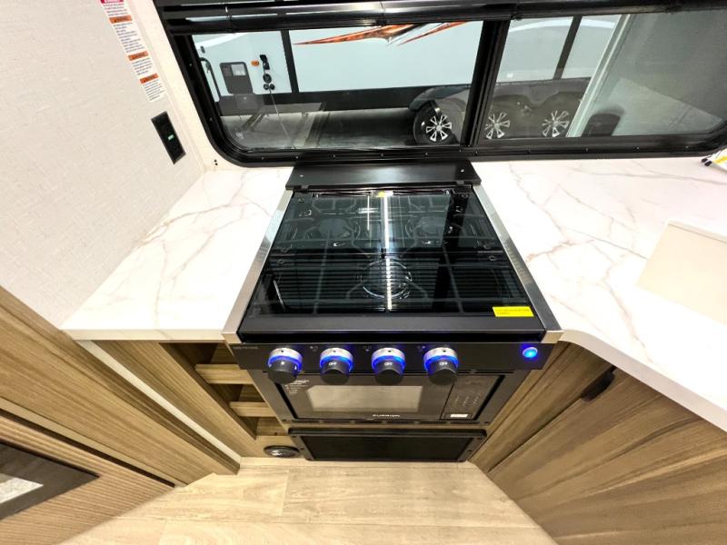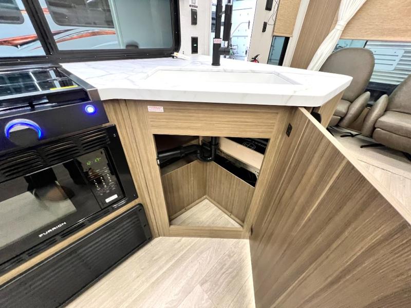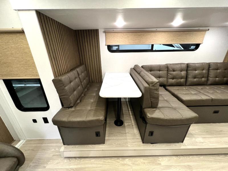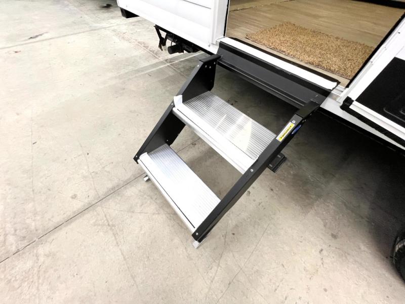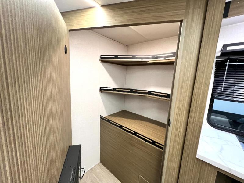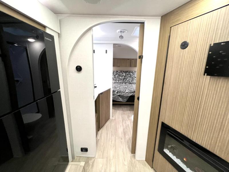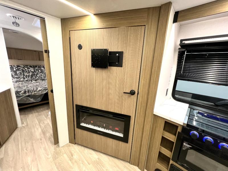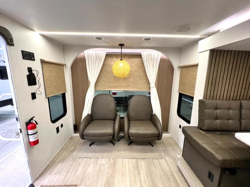Comfort comes easy in this spacious travel trailer for three to four! The rear living area includes dual lounge chairs and a picture window so you can sit with your coffee and book in the morning. Once the chef of your crew has made breakfast in the fully equipped kitchen, you can dine at the booth dinette or take your plate outdoors under the awning. There is also a Versa-Lounge beside the dinette for more seating spaces. An entertainment center with a fireplace will make your space cozier, and you'll appreciate the hidden pantry behind for dry goods, movies, games and more! The walk-thru bath leads to the master bedroom where you'll find a walk-around Versa-Tilt custom king bed, a bedroom closet, and overhead storage so everything has a place!