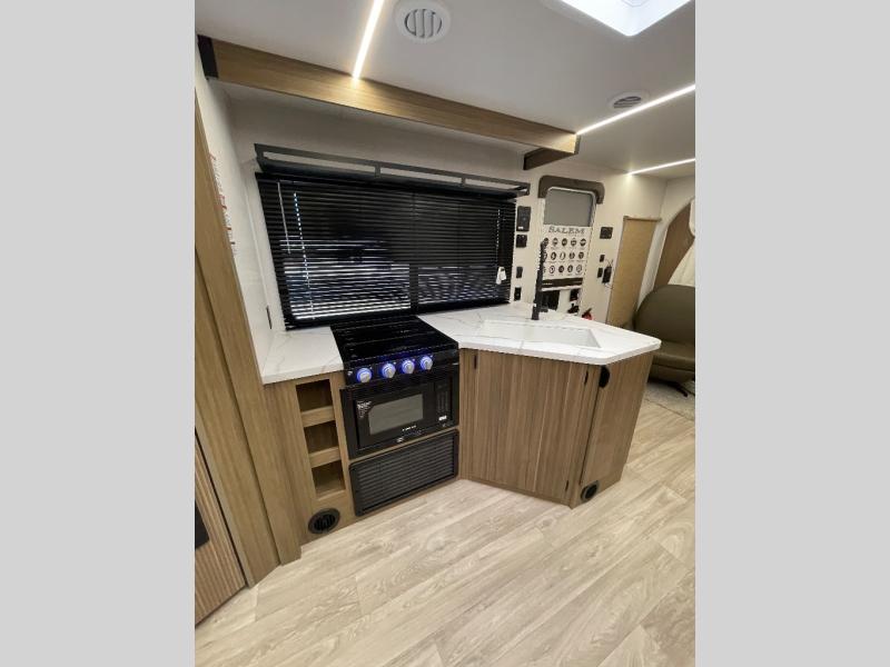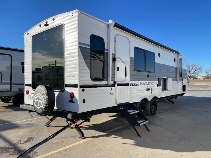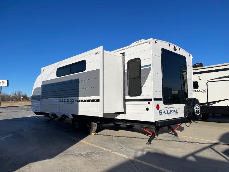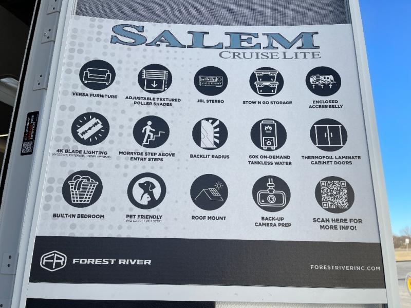The Salem Cruise Lite travel trailers are packed with hassle-free camping amenities! There are a variety of floorplans to choose from so you can find the best one to fit your needs. The enclosed Accessibelly will help protect against the elements and debris during transport, and the exterior is sure to be eye-catching! There are stylish roller shades inside, along with updated backsplash, elegant curtain rods and curtains, plus many more interior comforts! Choose a Salem Cruise Lite travel trailer today for quality and value!