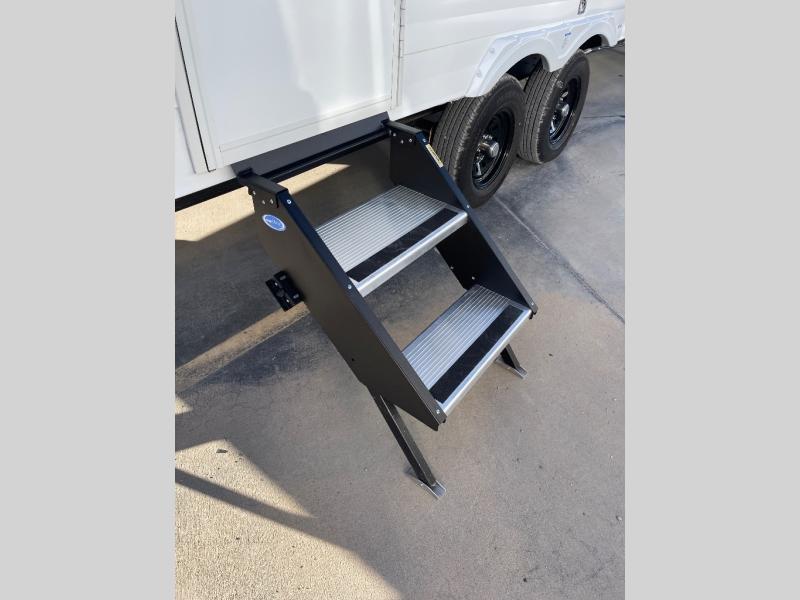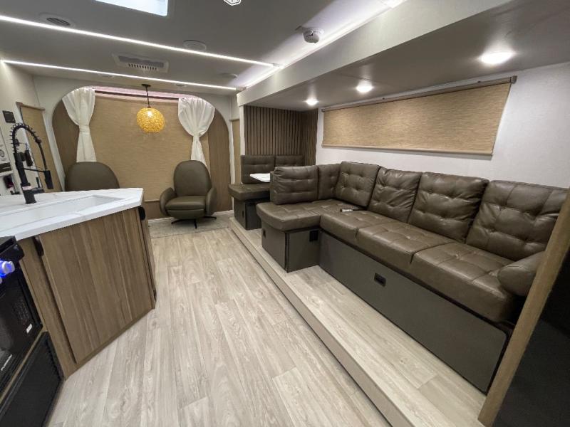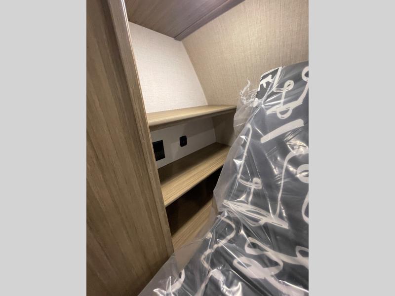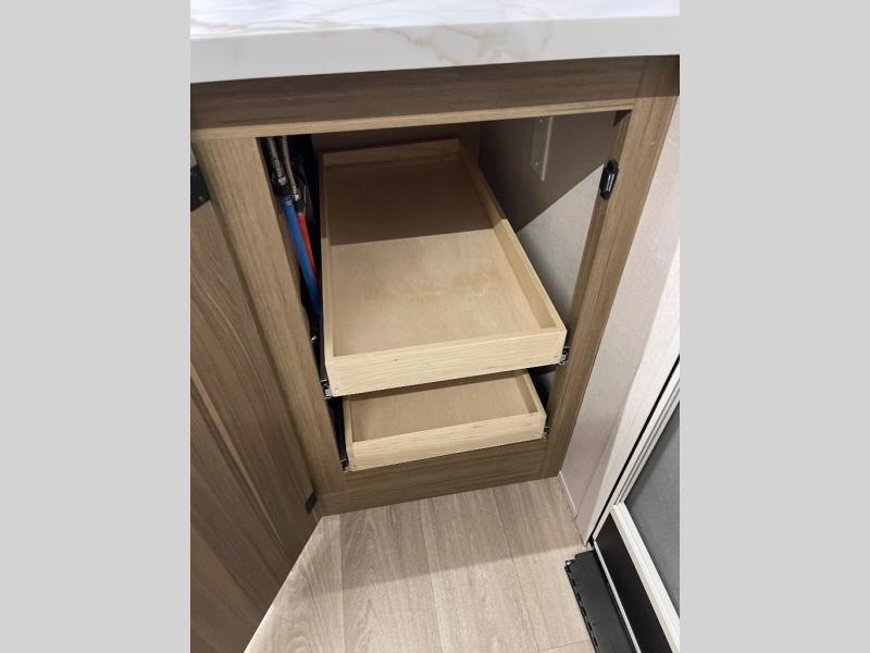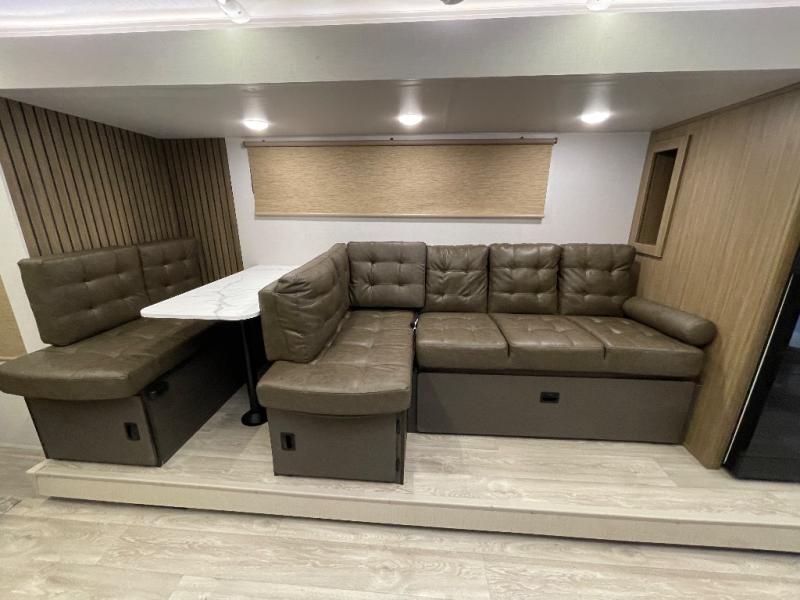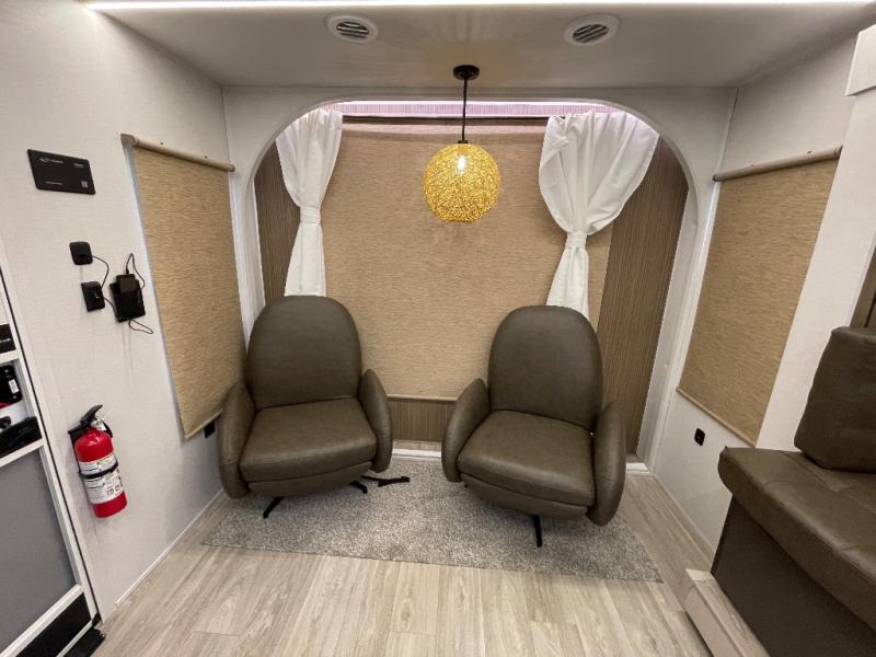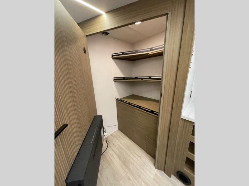 Comfort comes easy in this spacious travel trailer for three to four! The rear living area includes dual lounge chairs and a picture window so you can sit with your coffee and book in the morning. Once the chef of your crew has made breakfast in the fully equipped kitchen, you can dine at the booth dinette or take your plate outdoors under the awning. There is also a Versa-Lounge beside the dinette for more seating spaces. An entertainment center with a fireplace will make your space cozier, and you'll appreciate the hidden pantry behind for dry goods, movies, games and more! The walk-thru bath leads to the master bedroom where you'll find a walk-around Versa-Tilt custom king bed, a bedroom closet, and overhead storage so everything has a place!